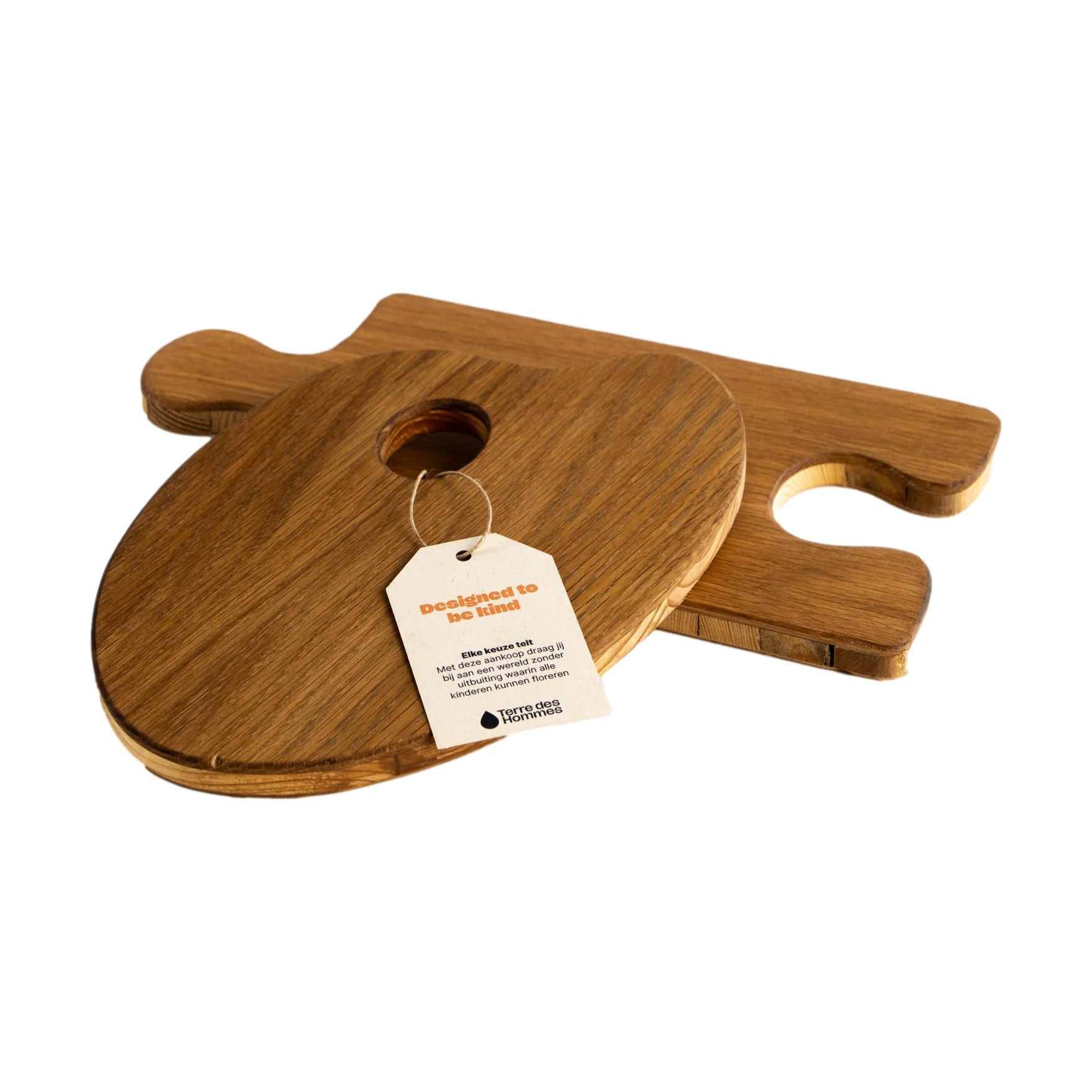 De borrelplankjes zijn gemaakt van restanten eiken pakket, in de vorm van een puzzelstukje en als schilderpallet.