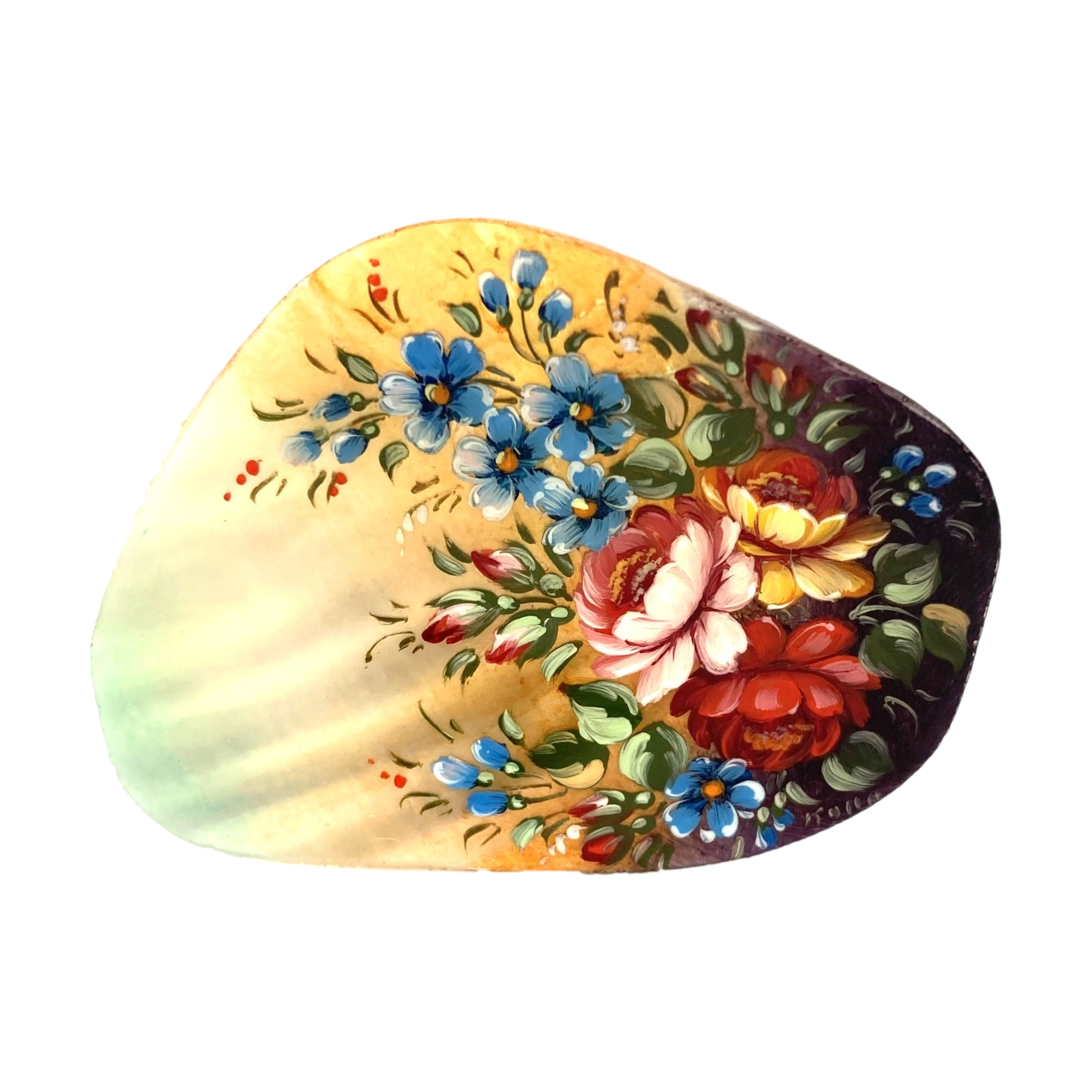 Handbeschilderde broche van parelmoer. Met fraai bloemmotief in de stijl van Zhostovo-schilderkunst.