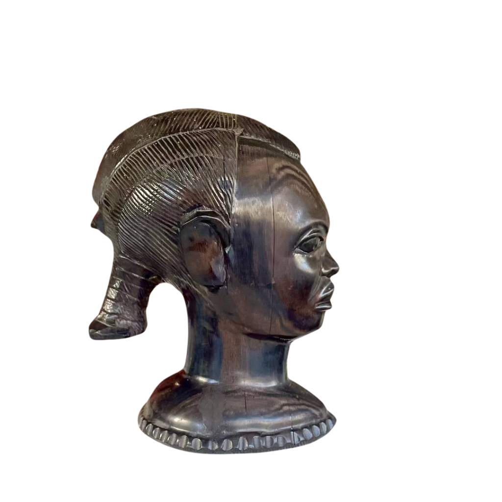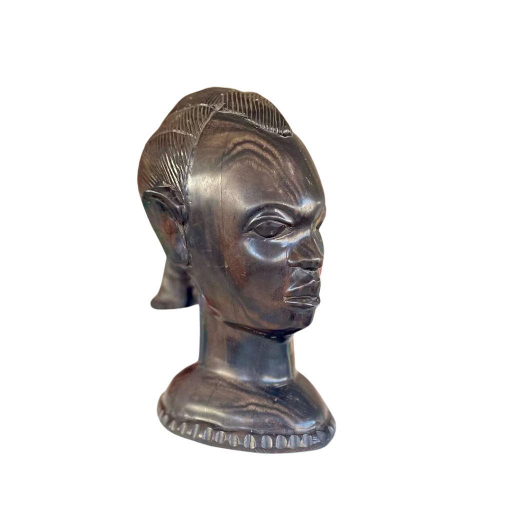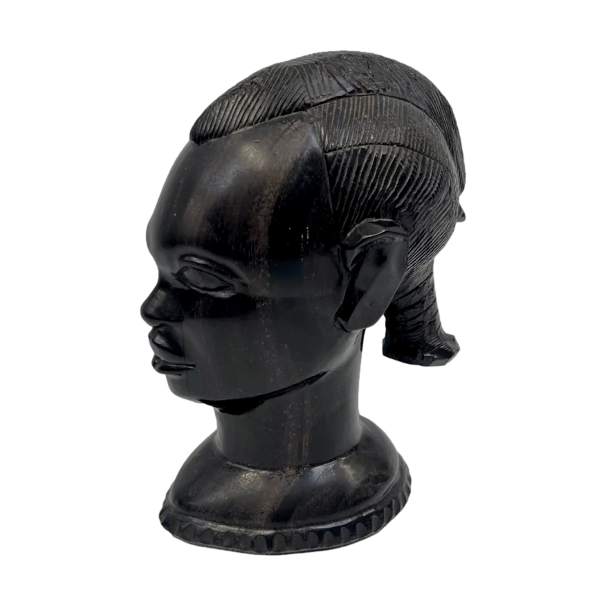 Dit indrukwekkende Afrikaanse hoofdbeeld, handgesneden uit massief ebbenhout, is een prachtig voorbeeld van traditioneel Afrikaans houtsnijwerk. Met een hoogte van 23 cm en een breedte van 17 cm heeft het beeld een krachtige uitstraling en toont het de verfijnde details en expressie waar dit soort kunst om bekend staat.