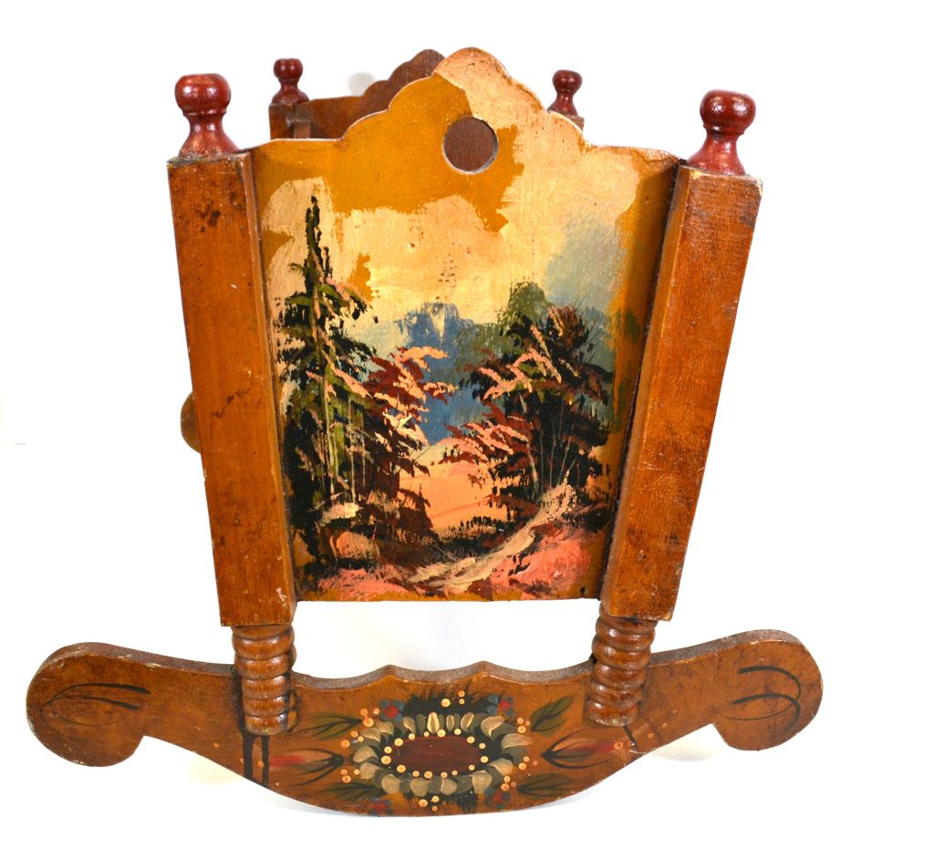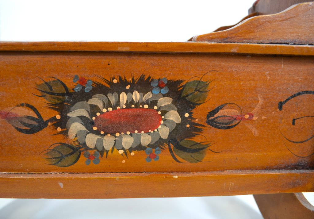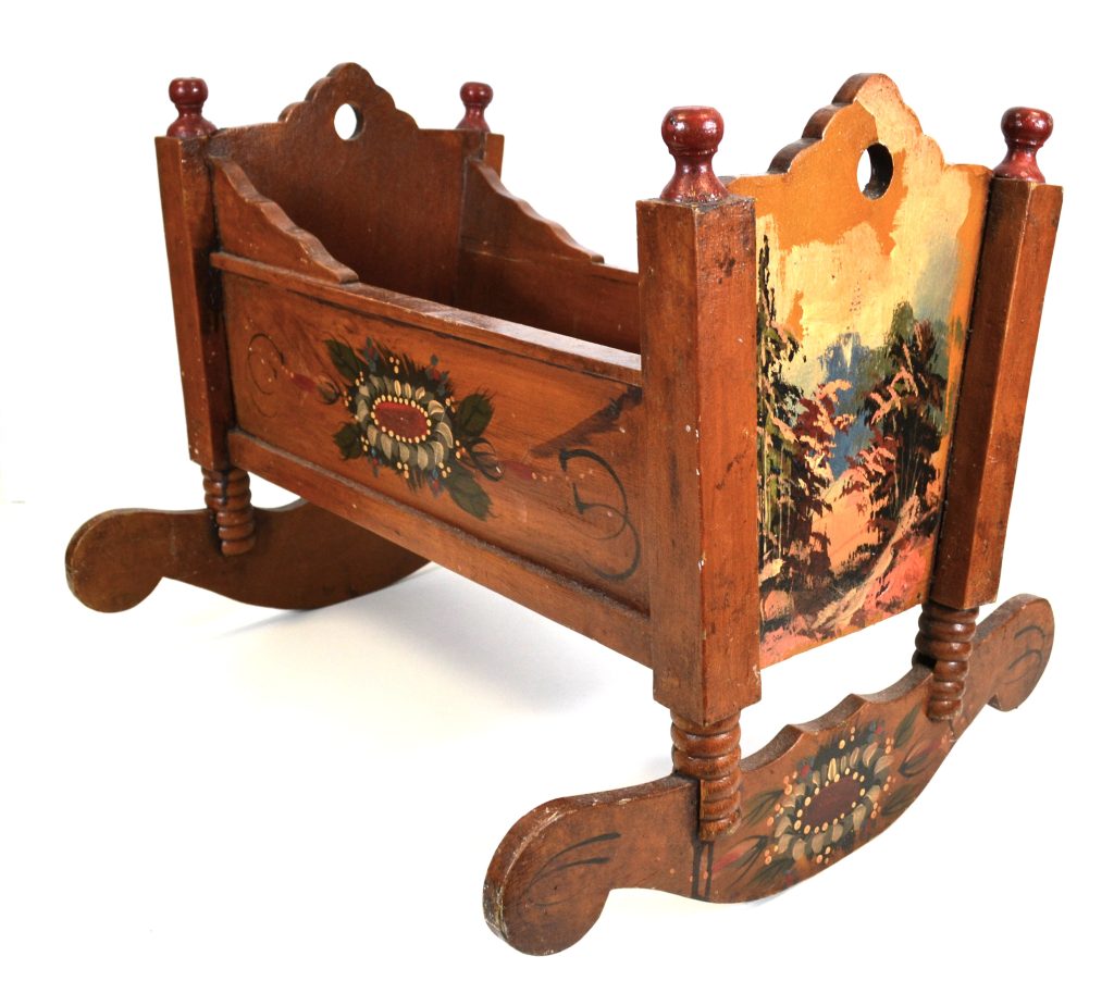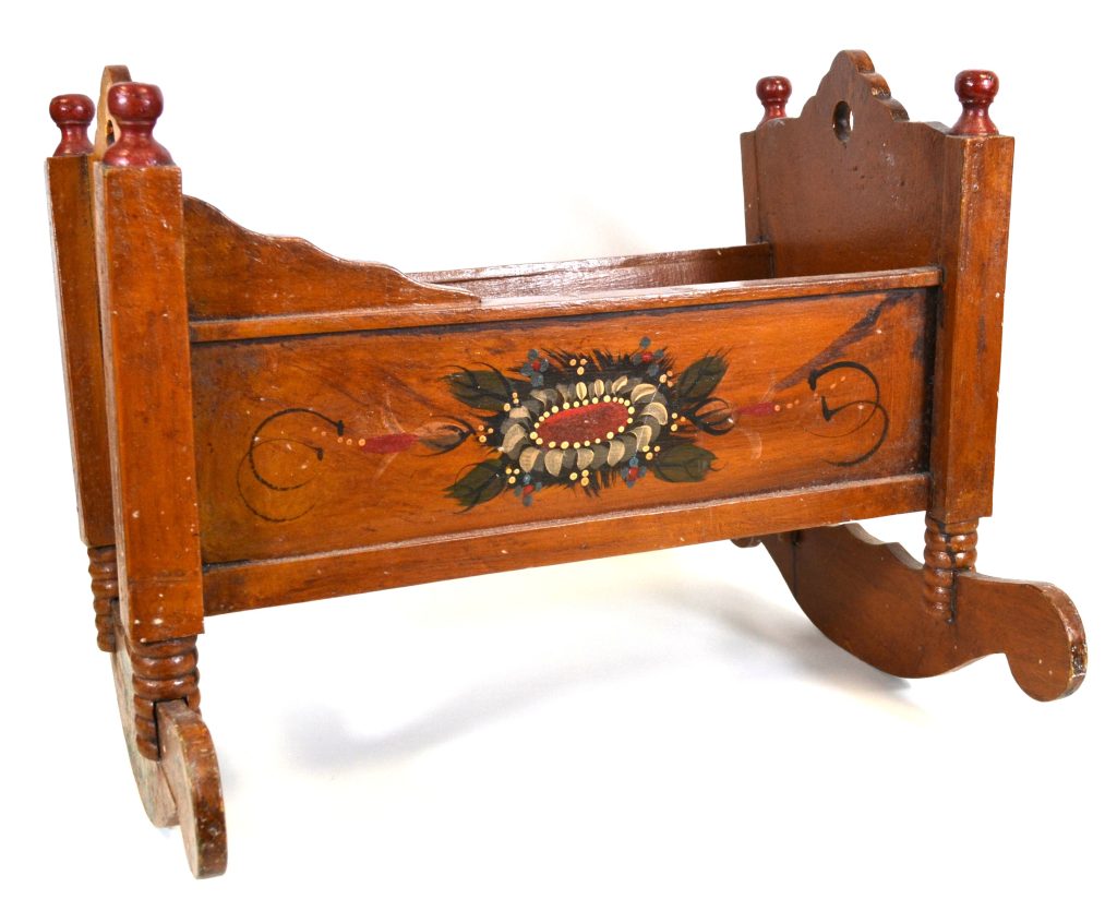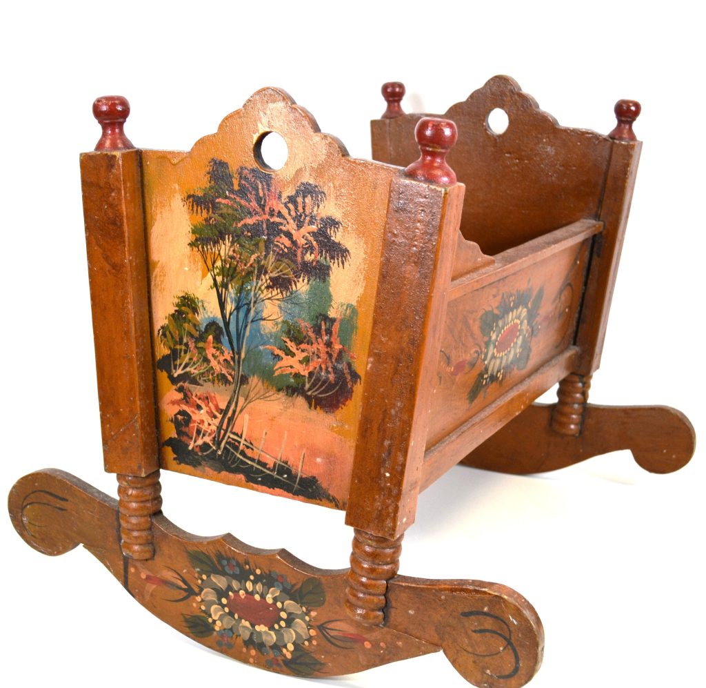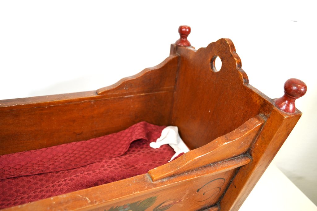 Antiek beschilderd houten poppen schommelwiegje, compleet met schuimrubber matrasje en lakentjes.