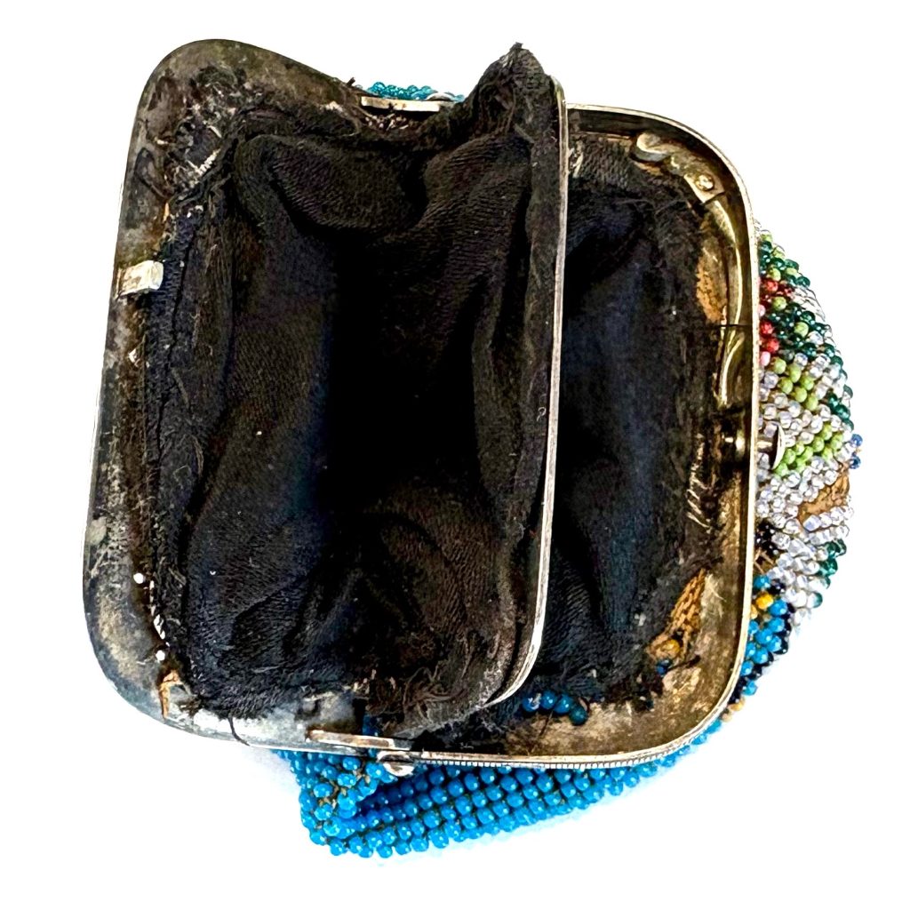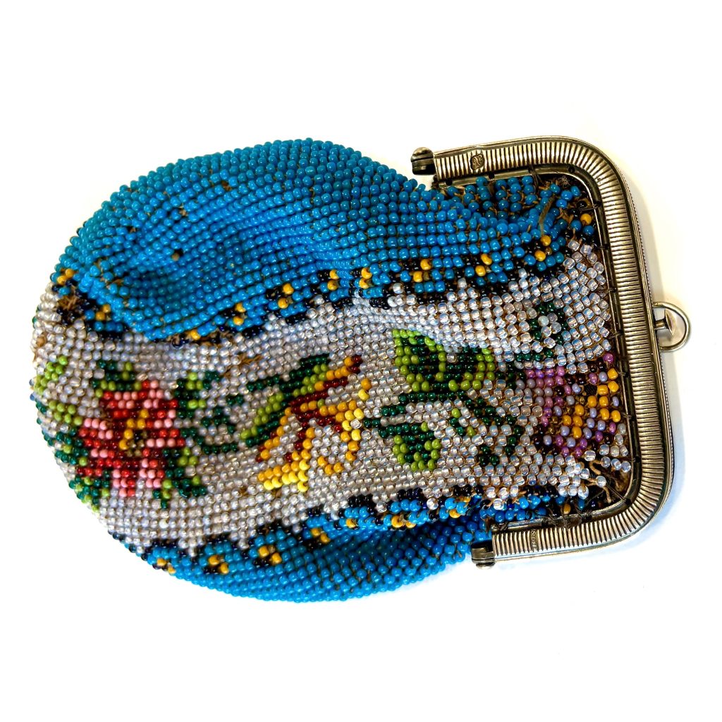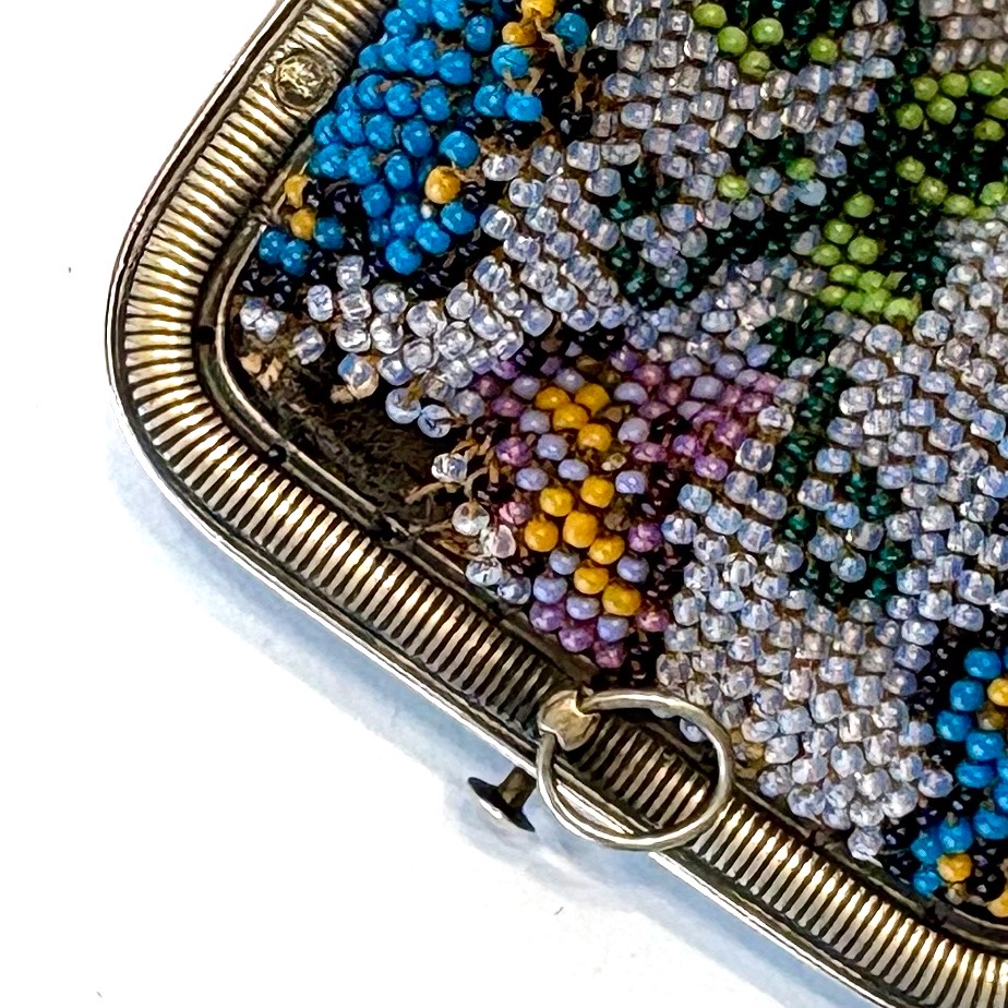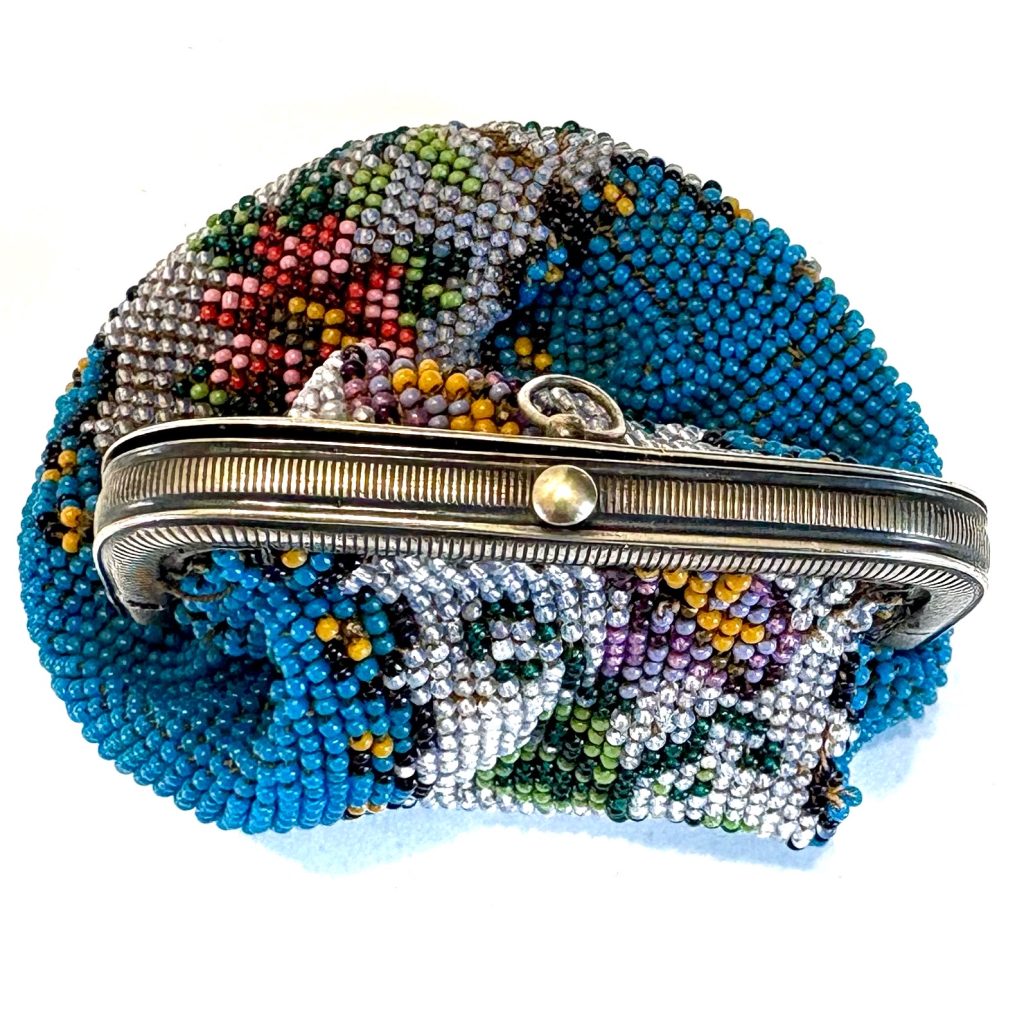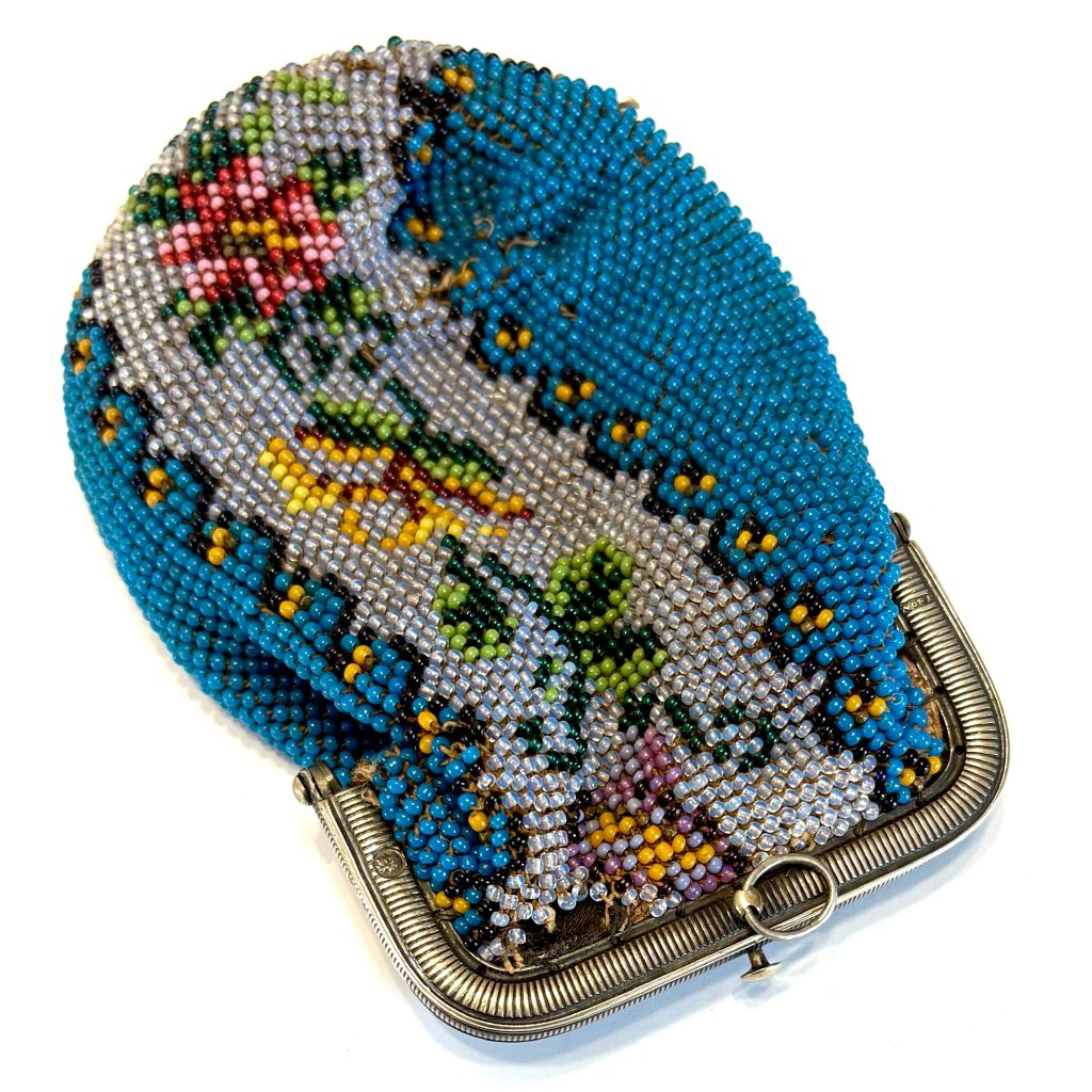 Een antiek Nederlands beursje met zilveren beugel. Het tasje bestaat uit kleine kraaltjes in een bloemmotief. Langs de rand zijn wat kraaltjes los (zie foto’s).