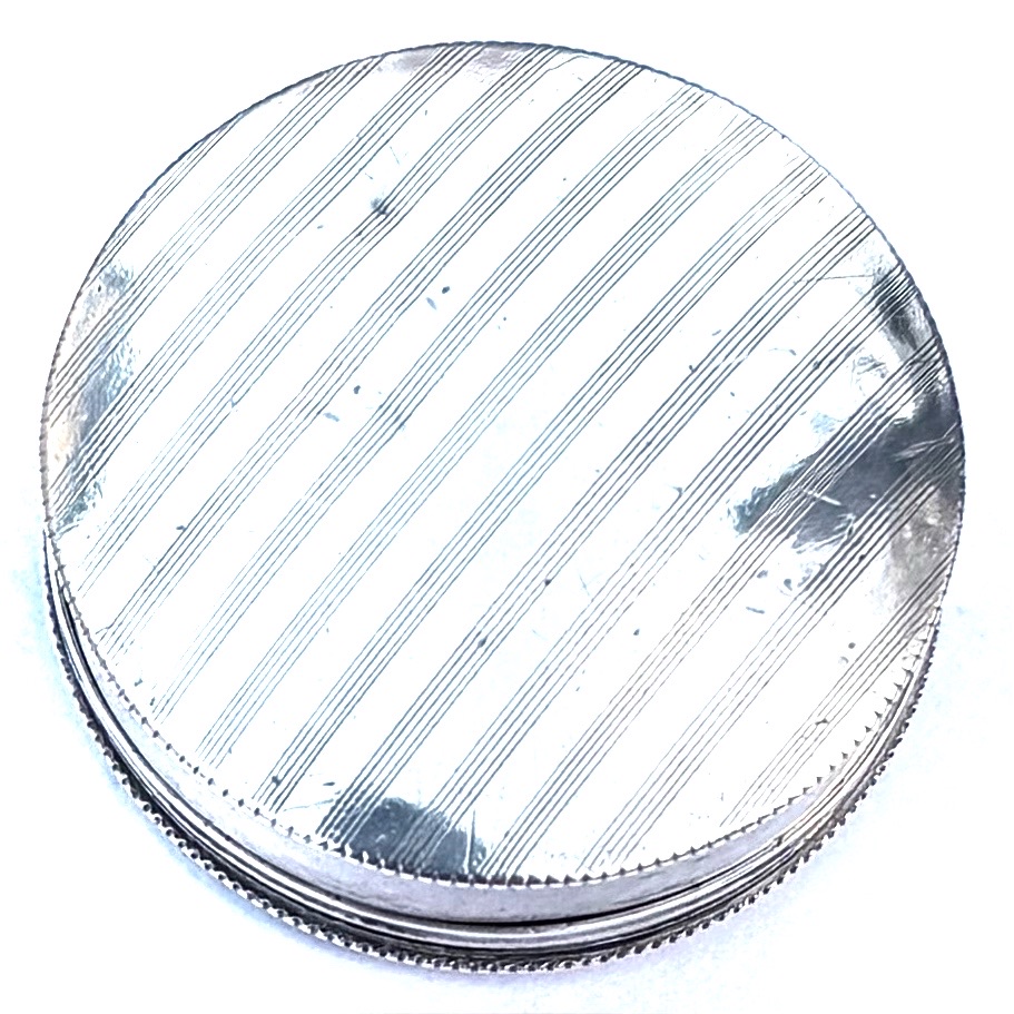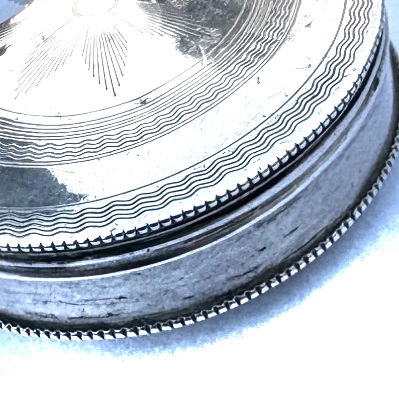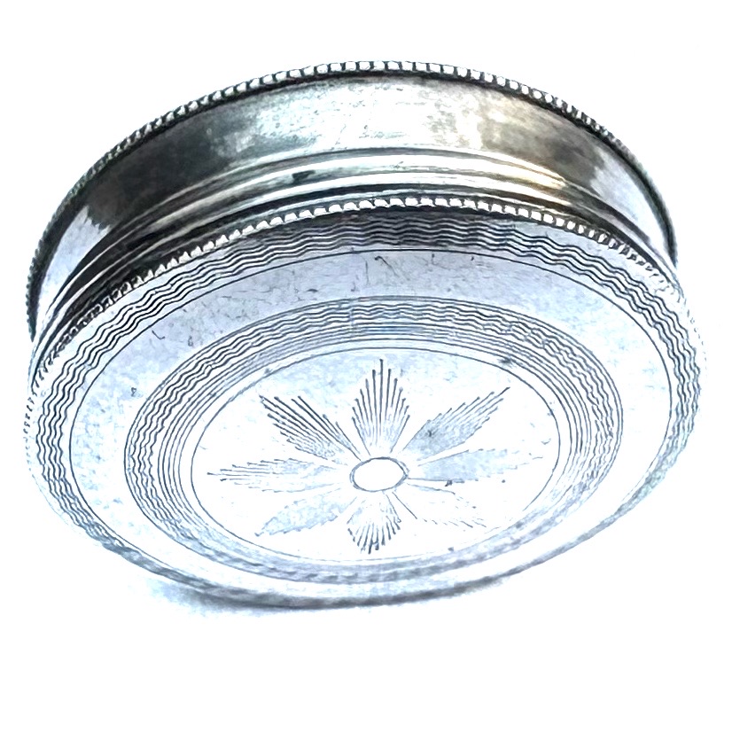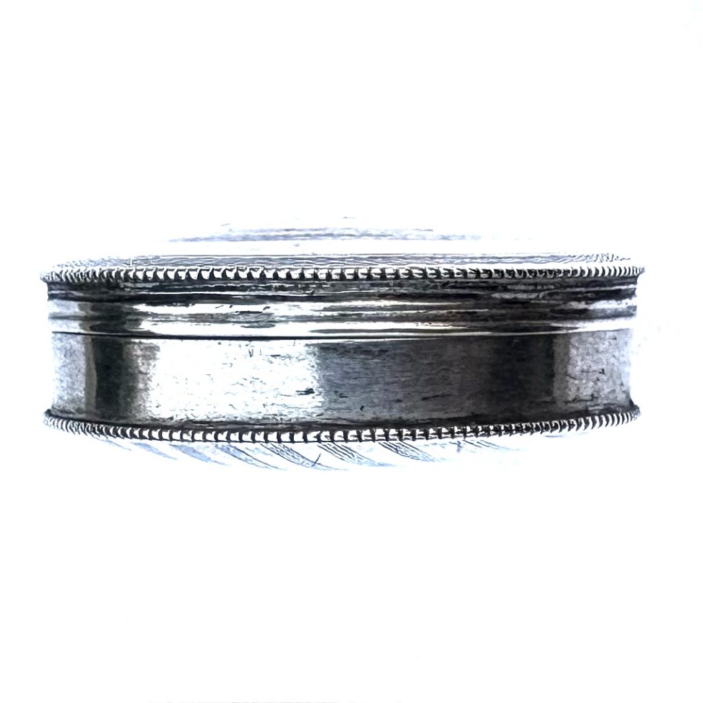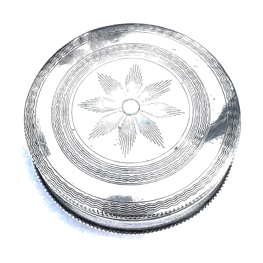 Antiek, rond, zilveren pillendoosje uit 1827. Aan de voorzijde onder meer een bloemmotief, aan de achterzijde een streepjes motief.