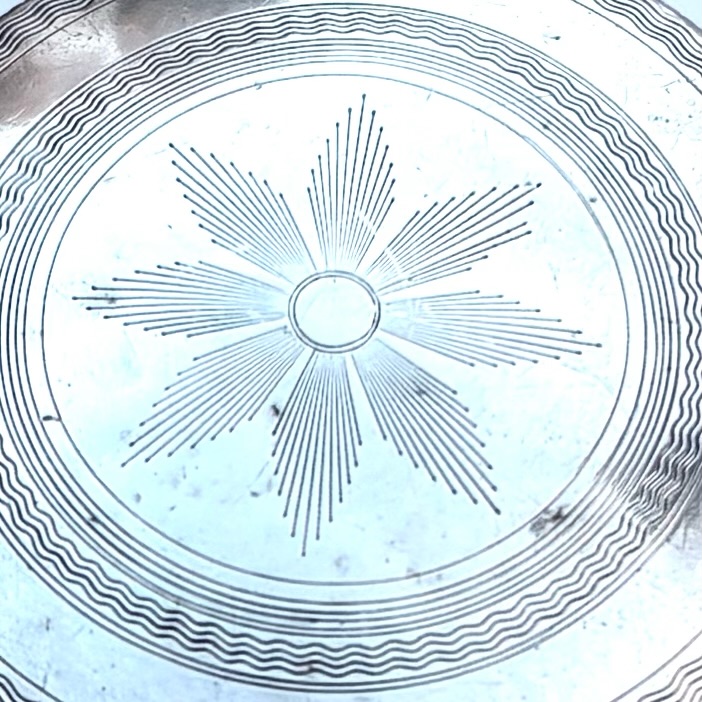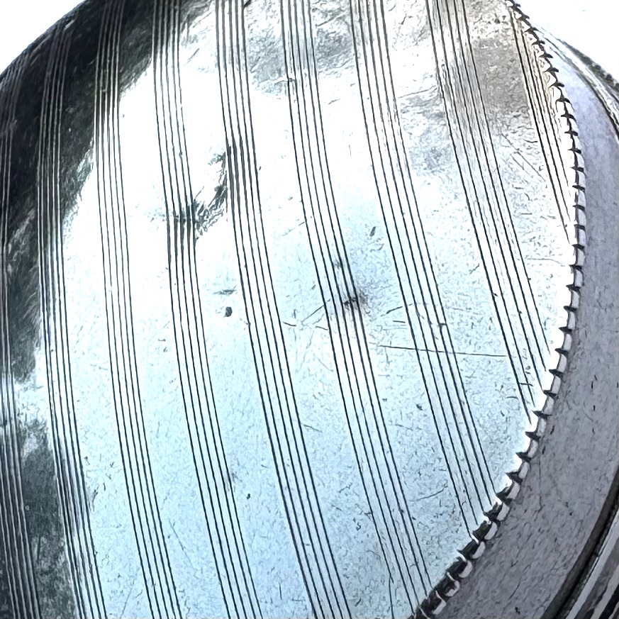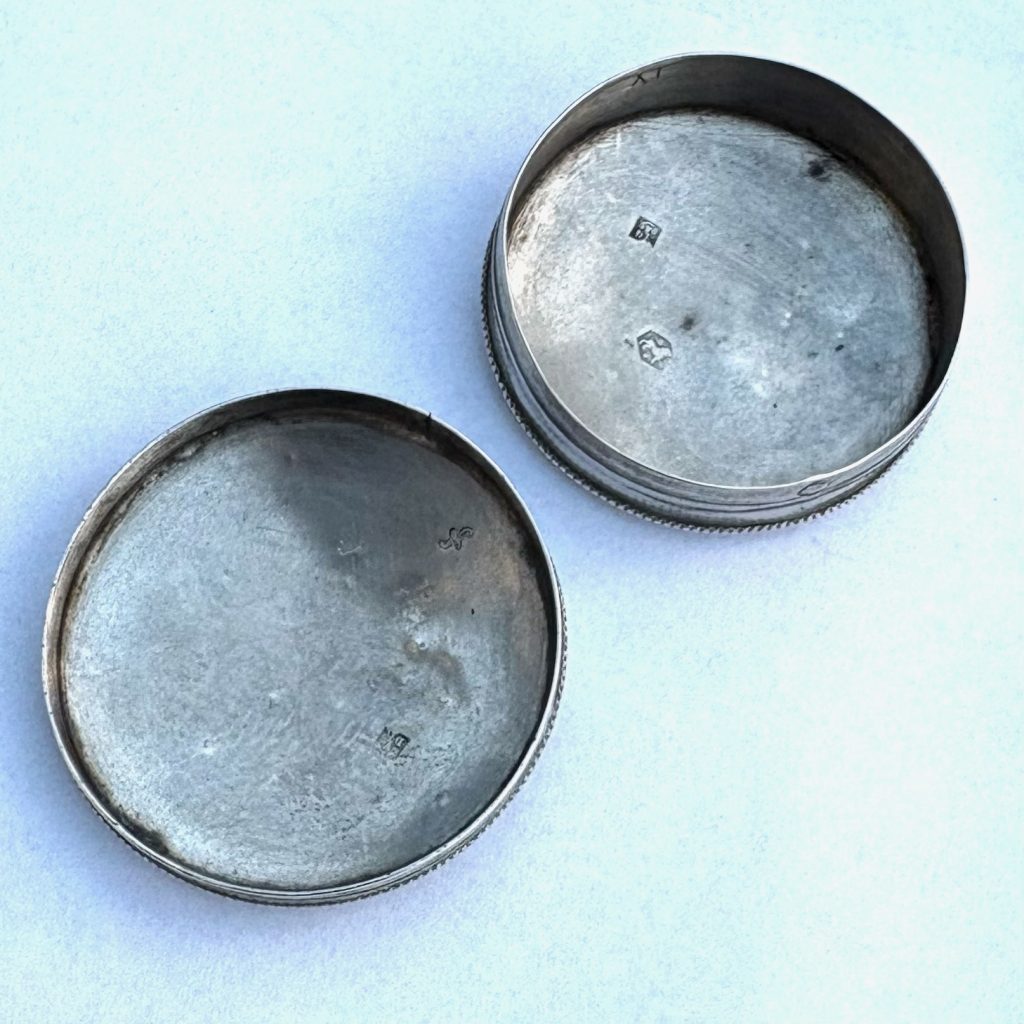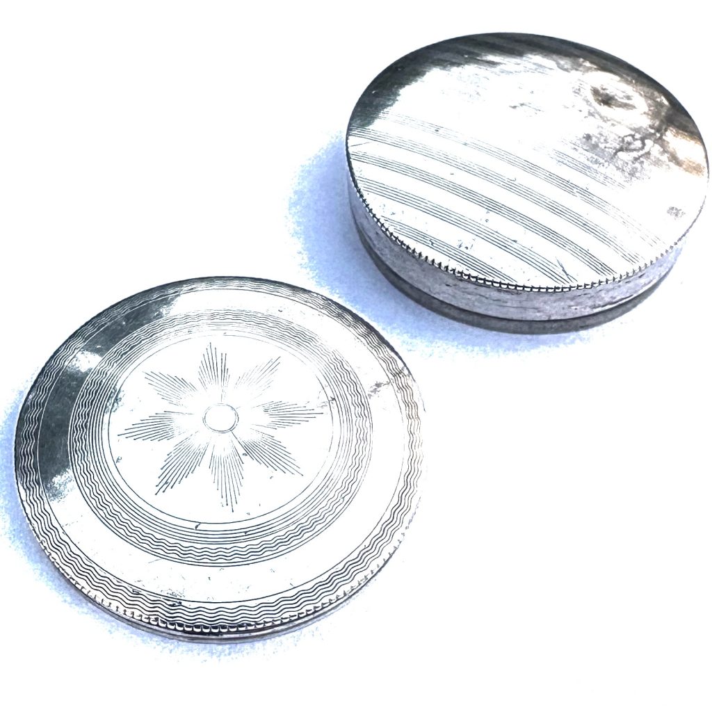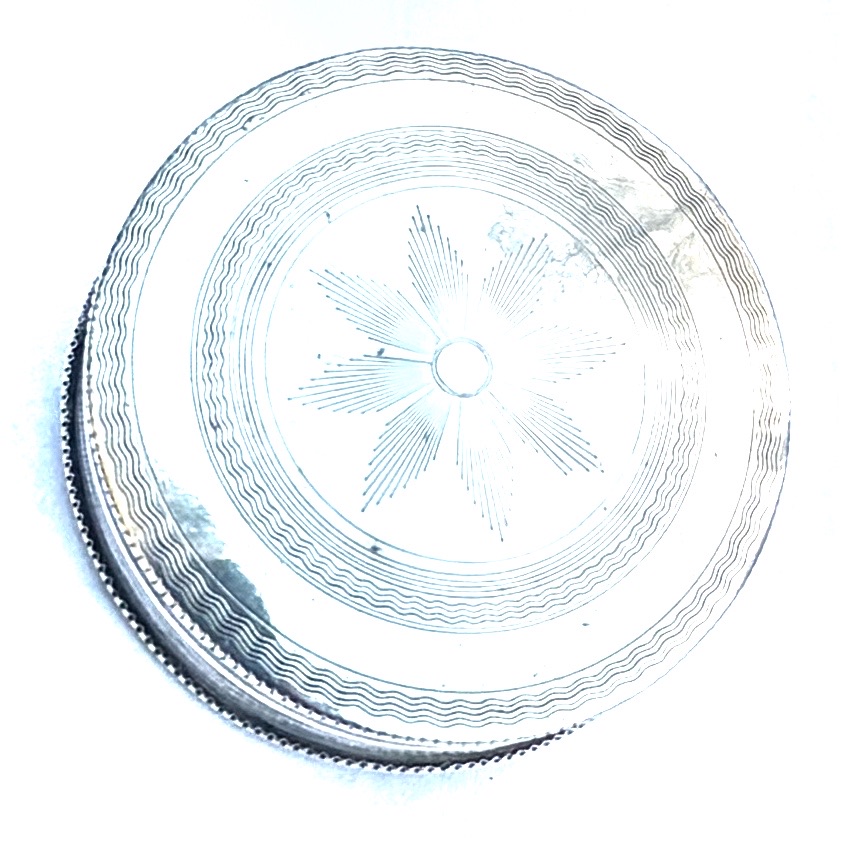 Antiek, rond, zilveren pillendoosje uit 1827. Aan de voorzijde onder meer een bloemmotief, aan de achterzijde een streepjes motief.