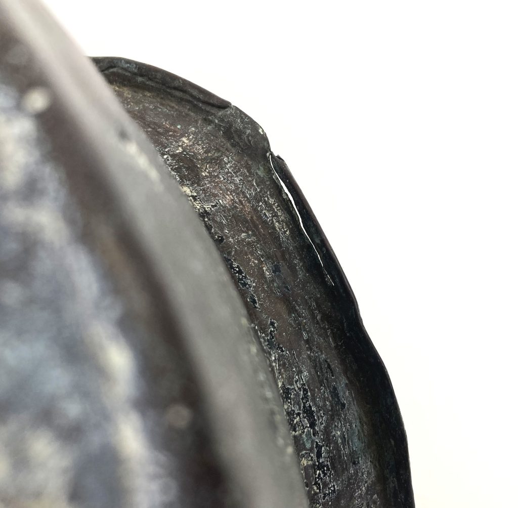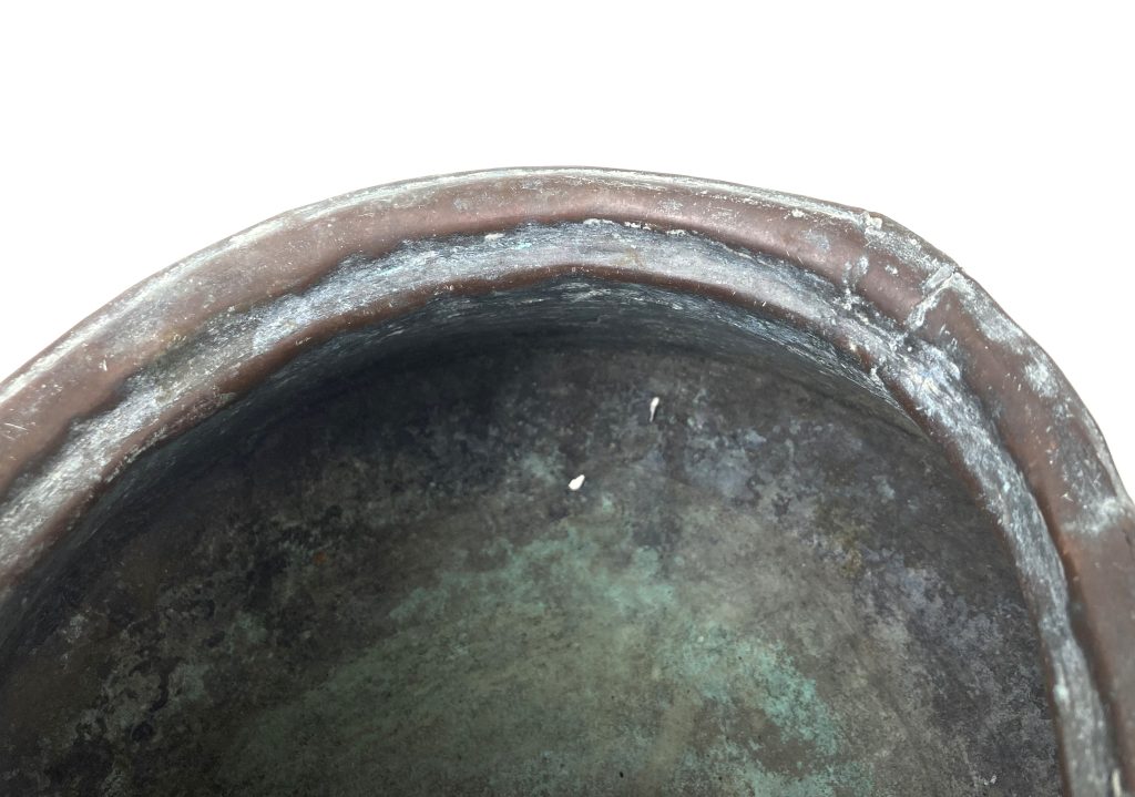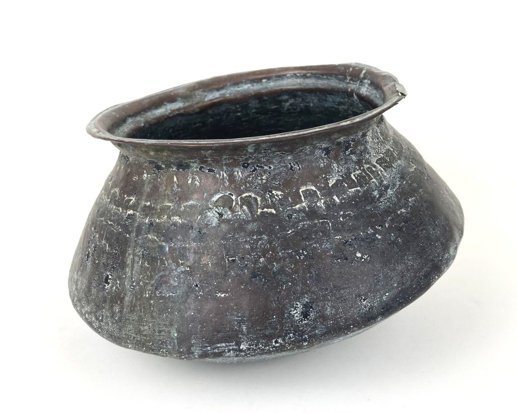Antieke Arabische koperen tuimelpot. Formaat: ca. 28 cm breed; 14,5 cm hoog. Opening: diameter 18 cm. Met klein gaatje in het koper (zie foto).