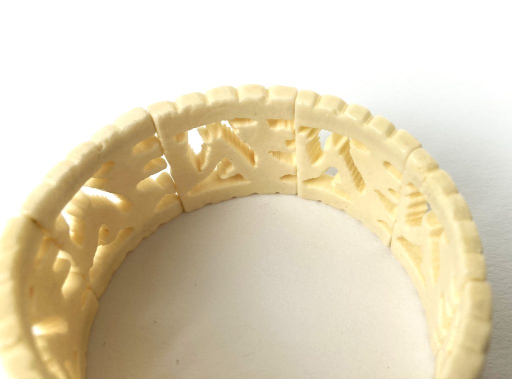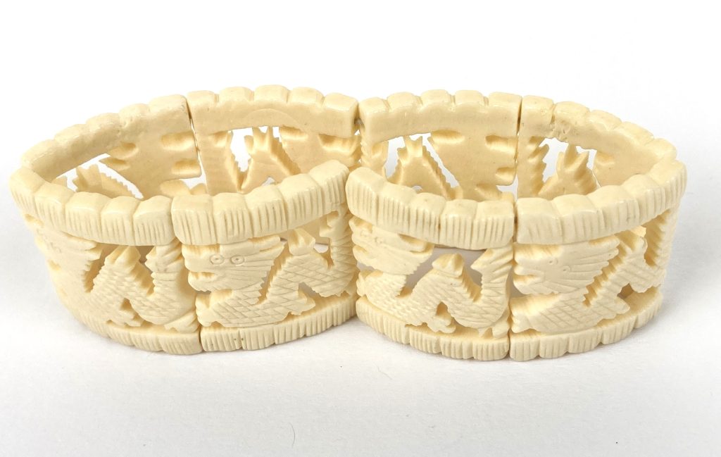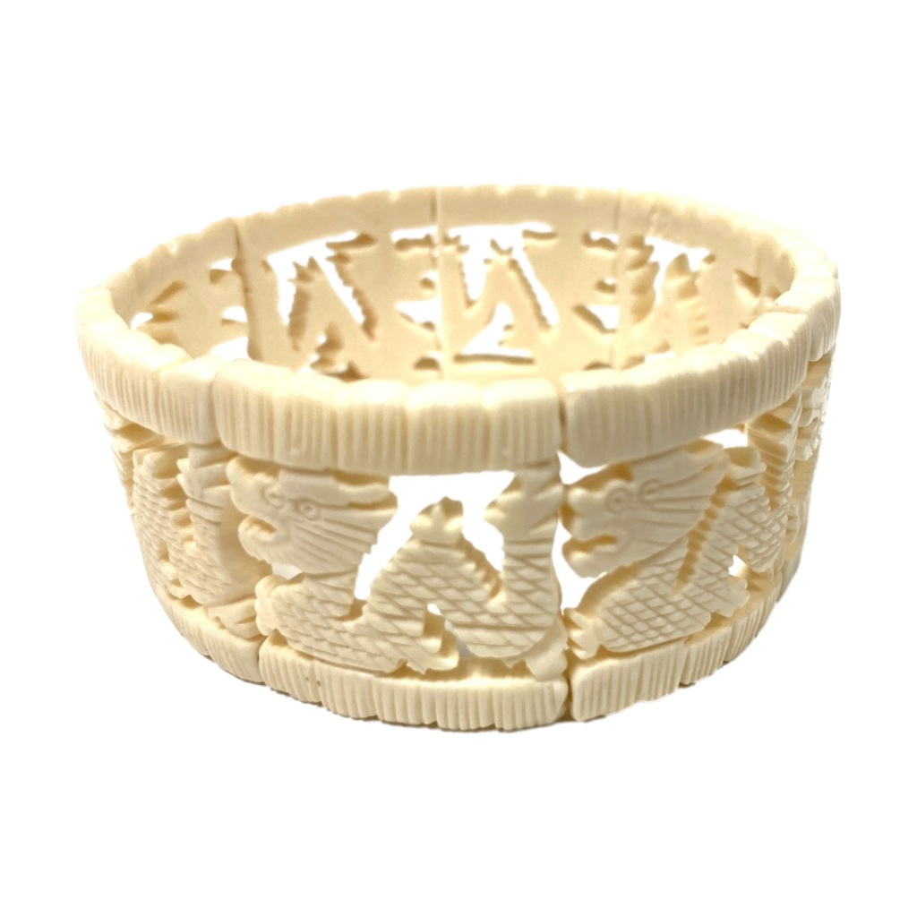 Antieke Chinese uit been gesneden stretch armband. De armband bestaat uit 8 schakels van 2×2,5 cm met in iedere schakel een uitgesneden draak.