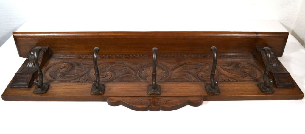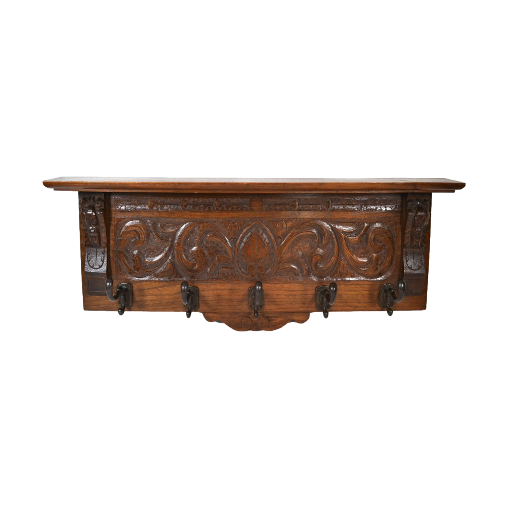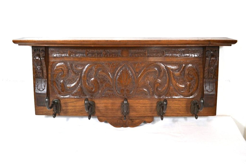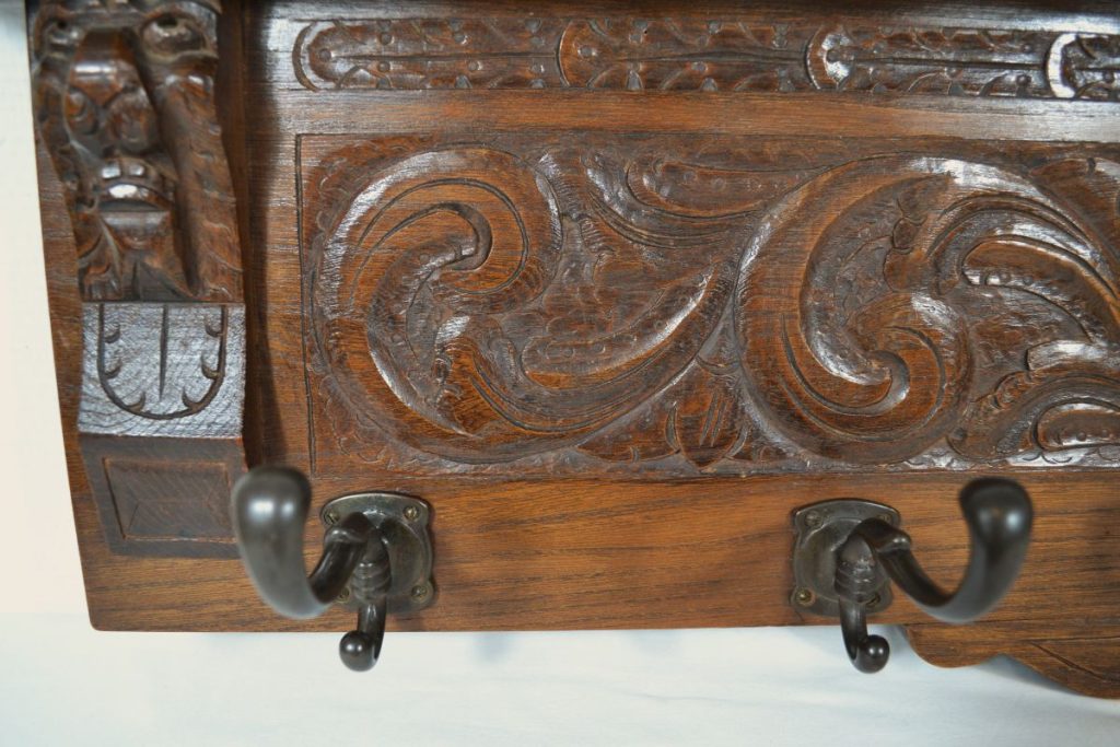 Antieke eikenhouten kapstok. Fraai bewerkt en met 5 haken.