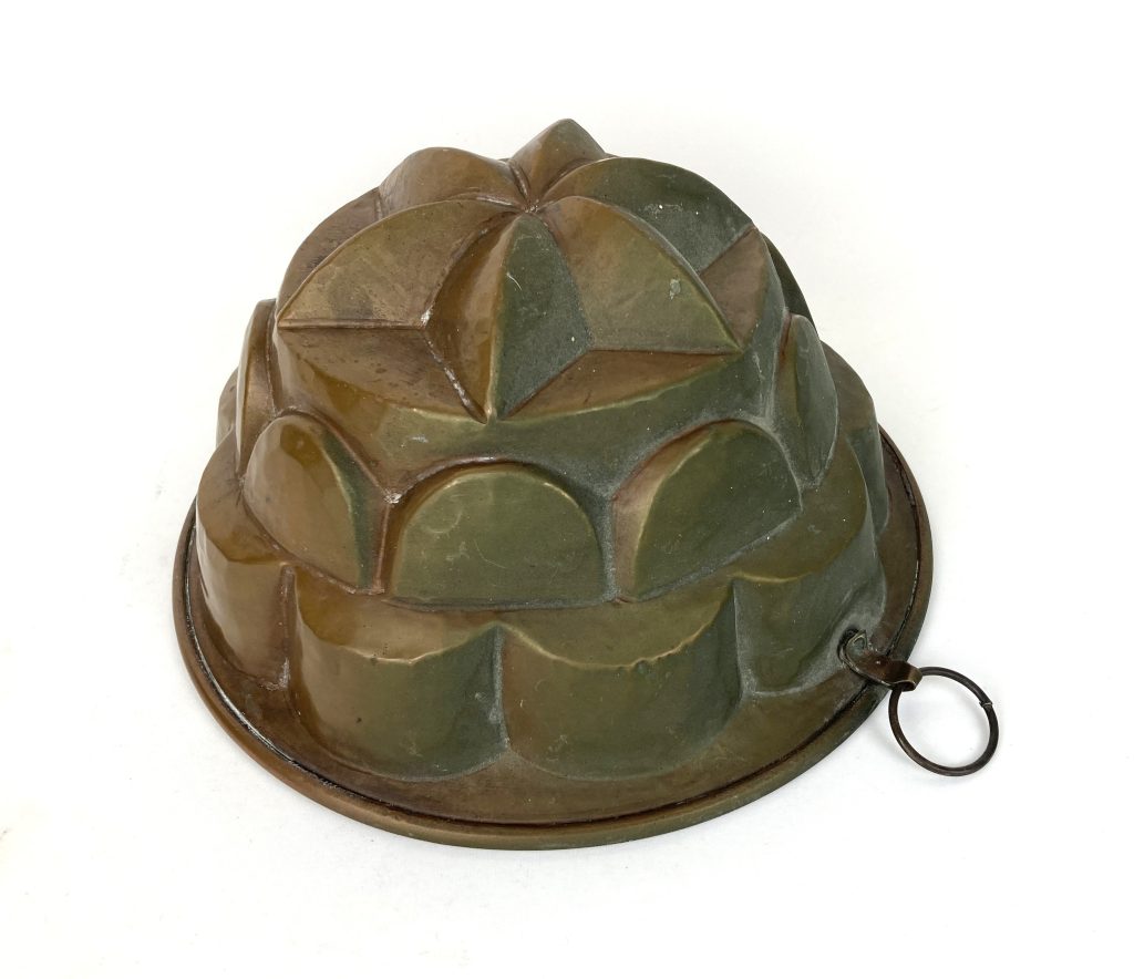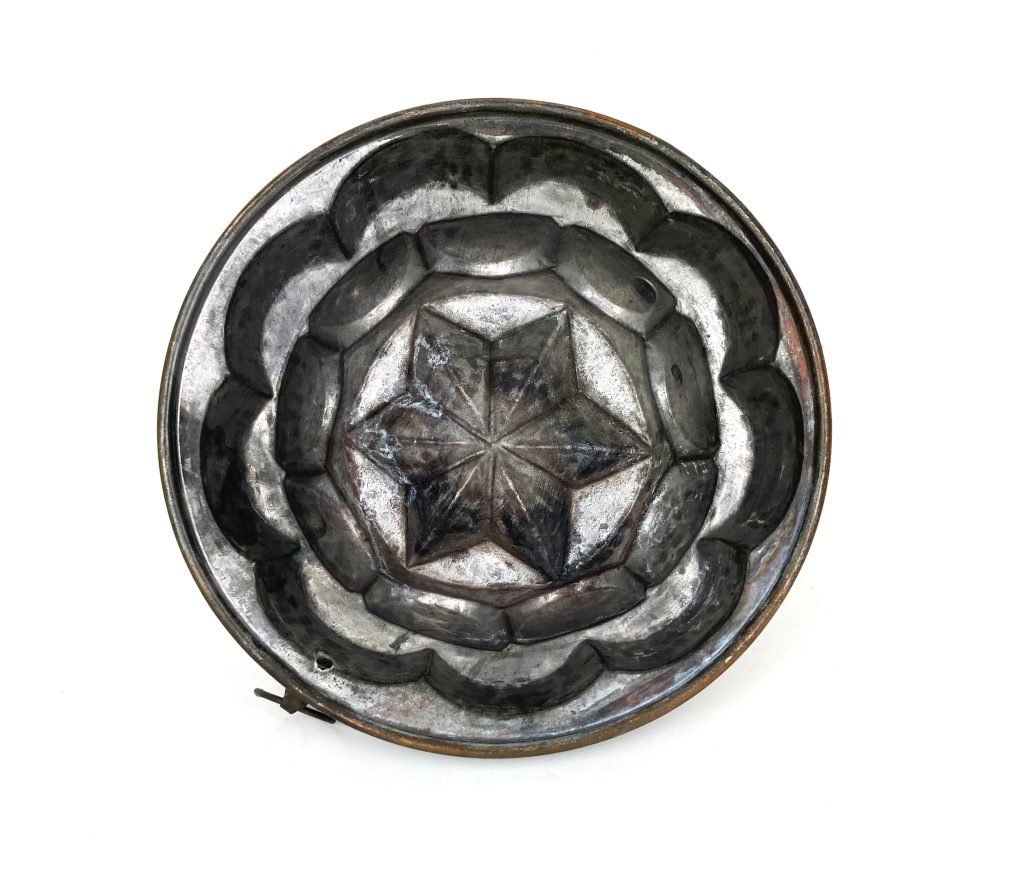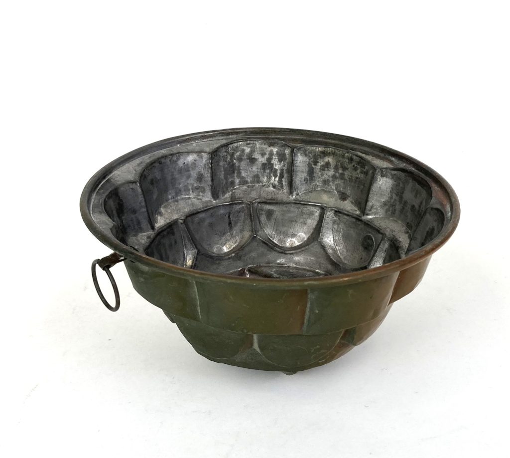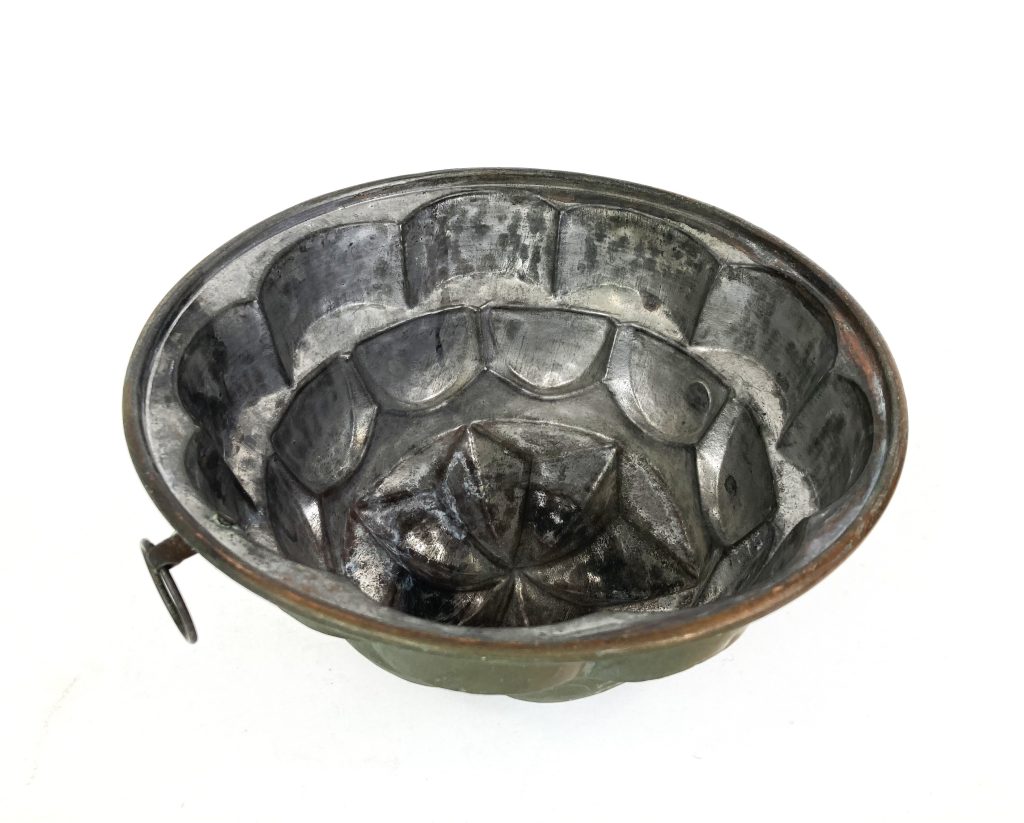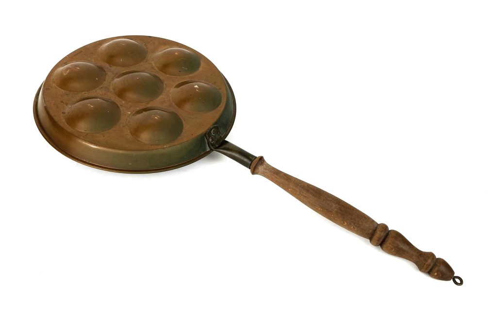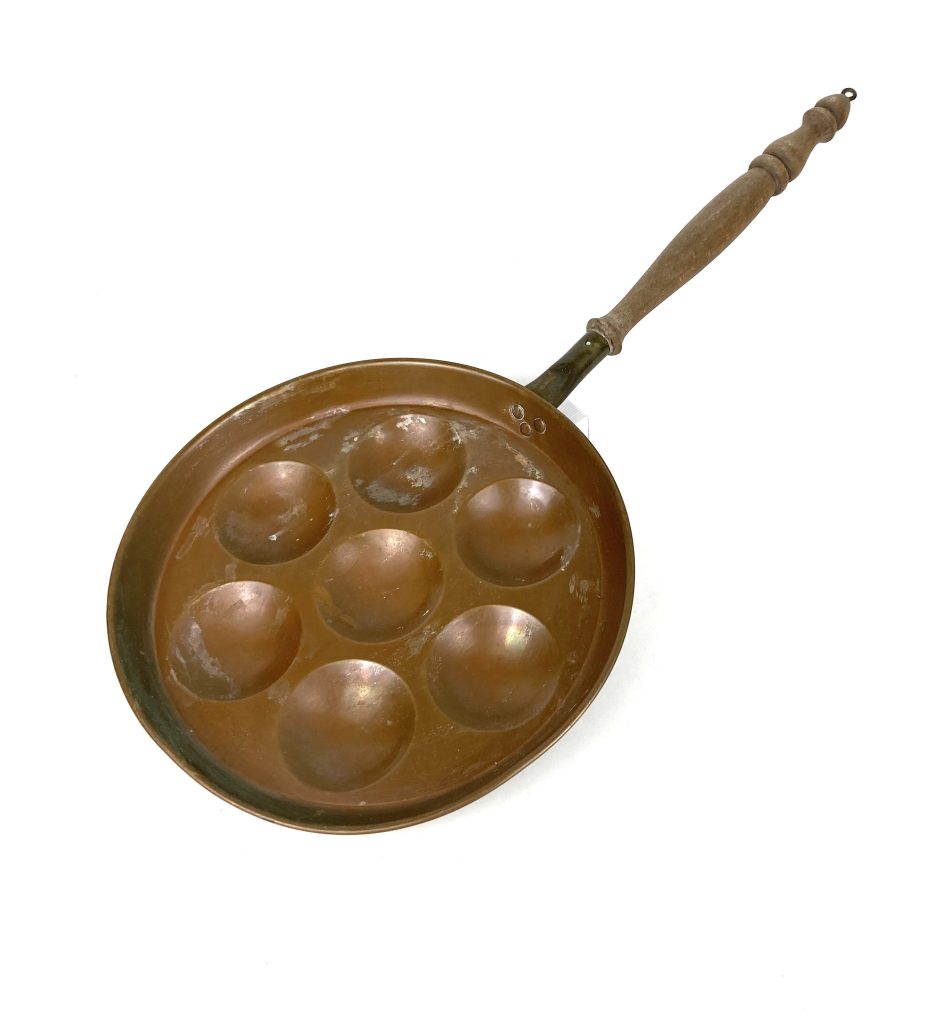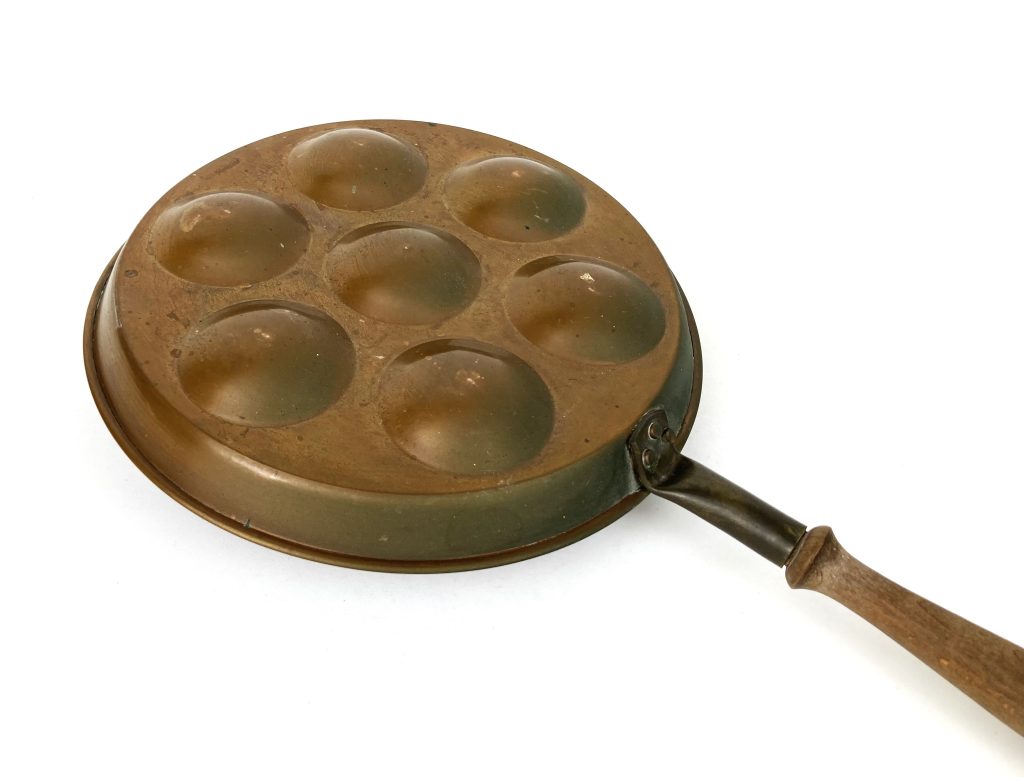 Antieke koperen tulband puddingvorm en poffertjes pan