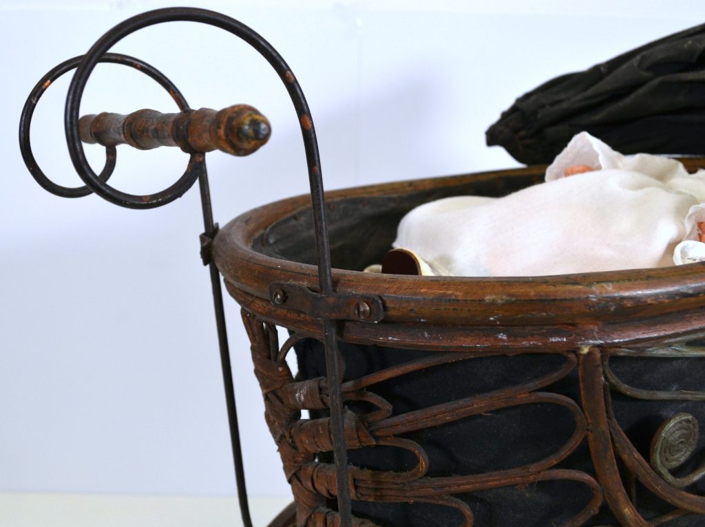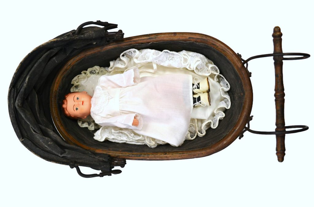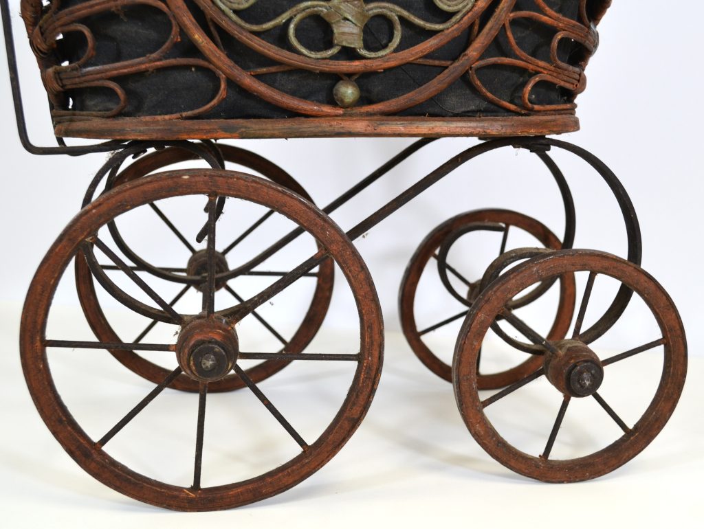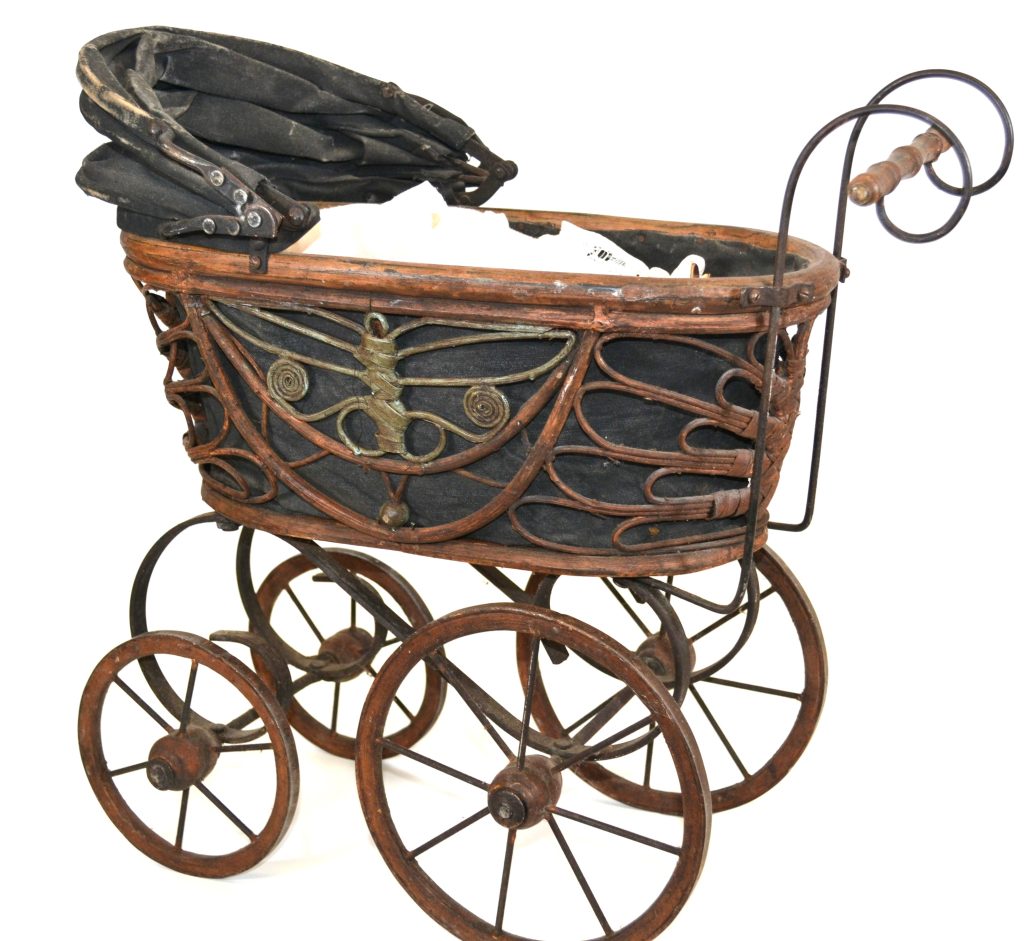 Antieke poppenwagen met pop