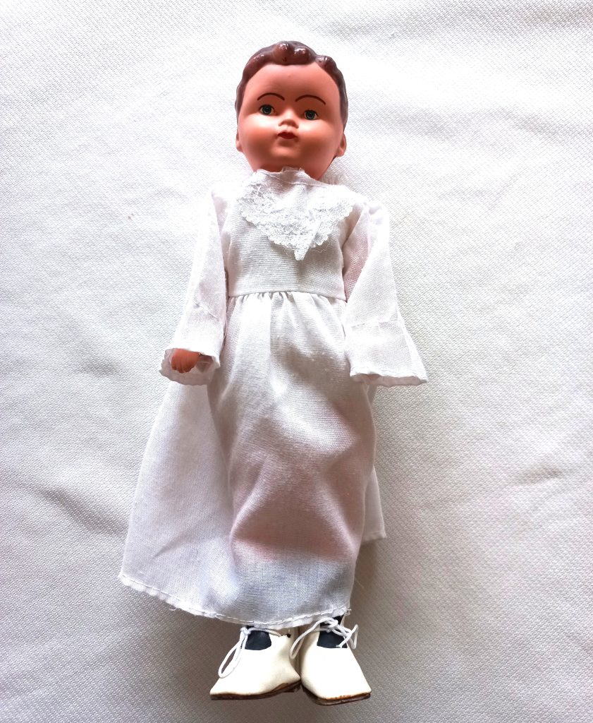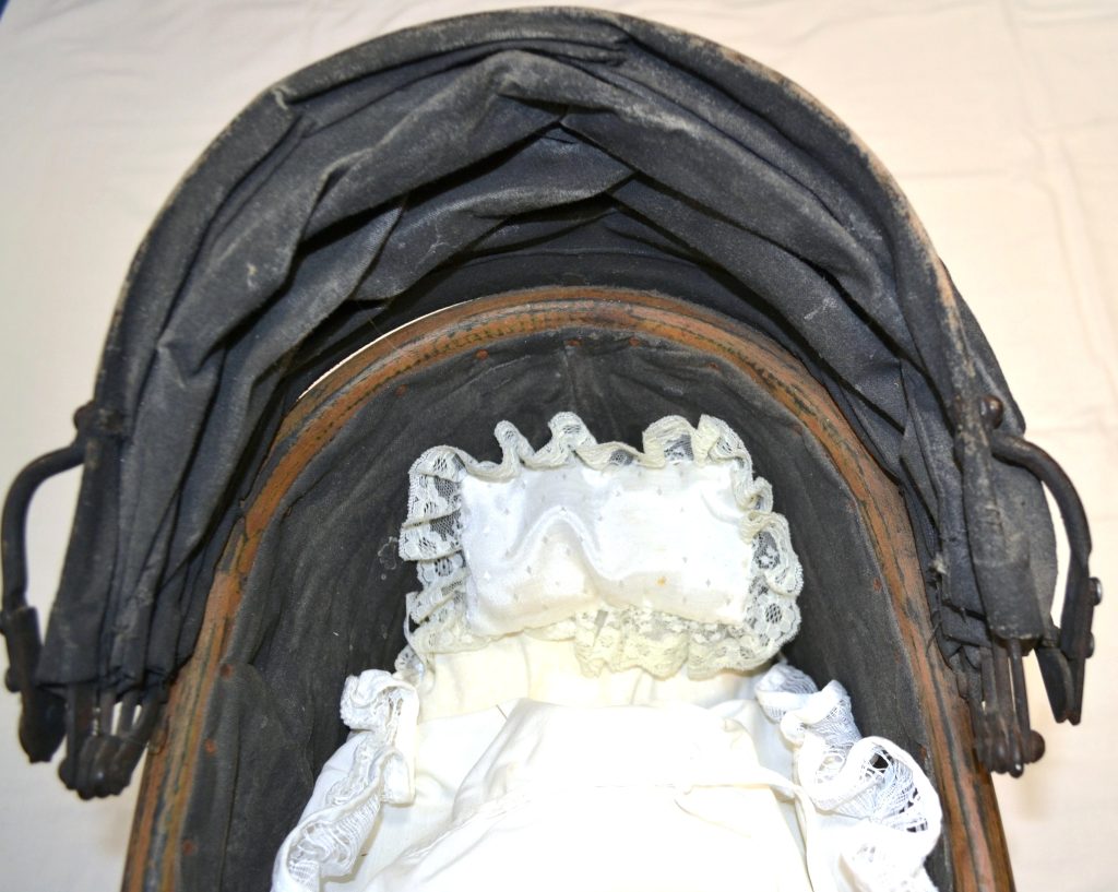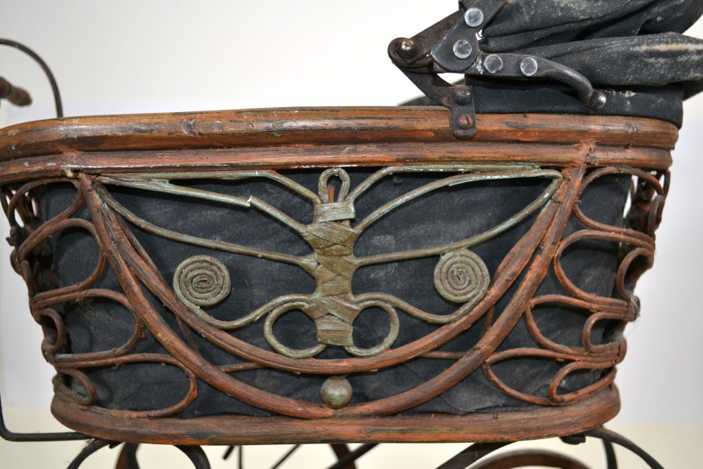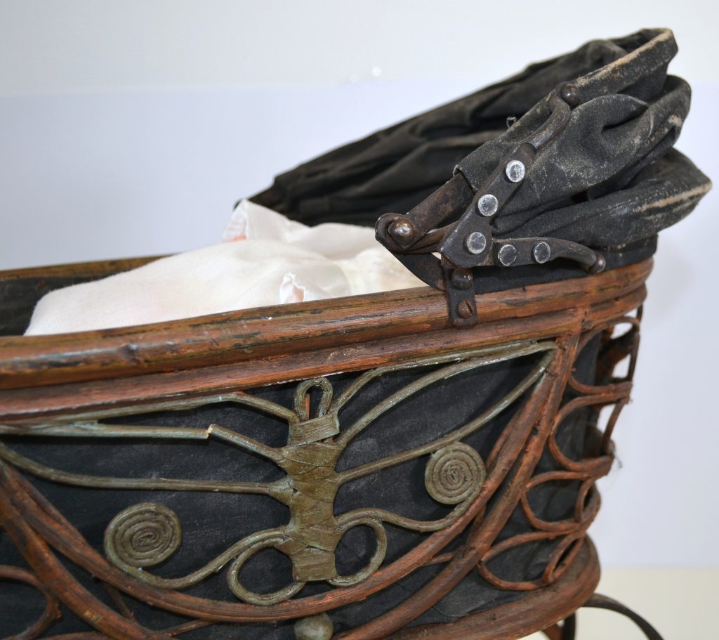 Antieke poppenwagen met pop