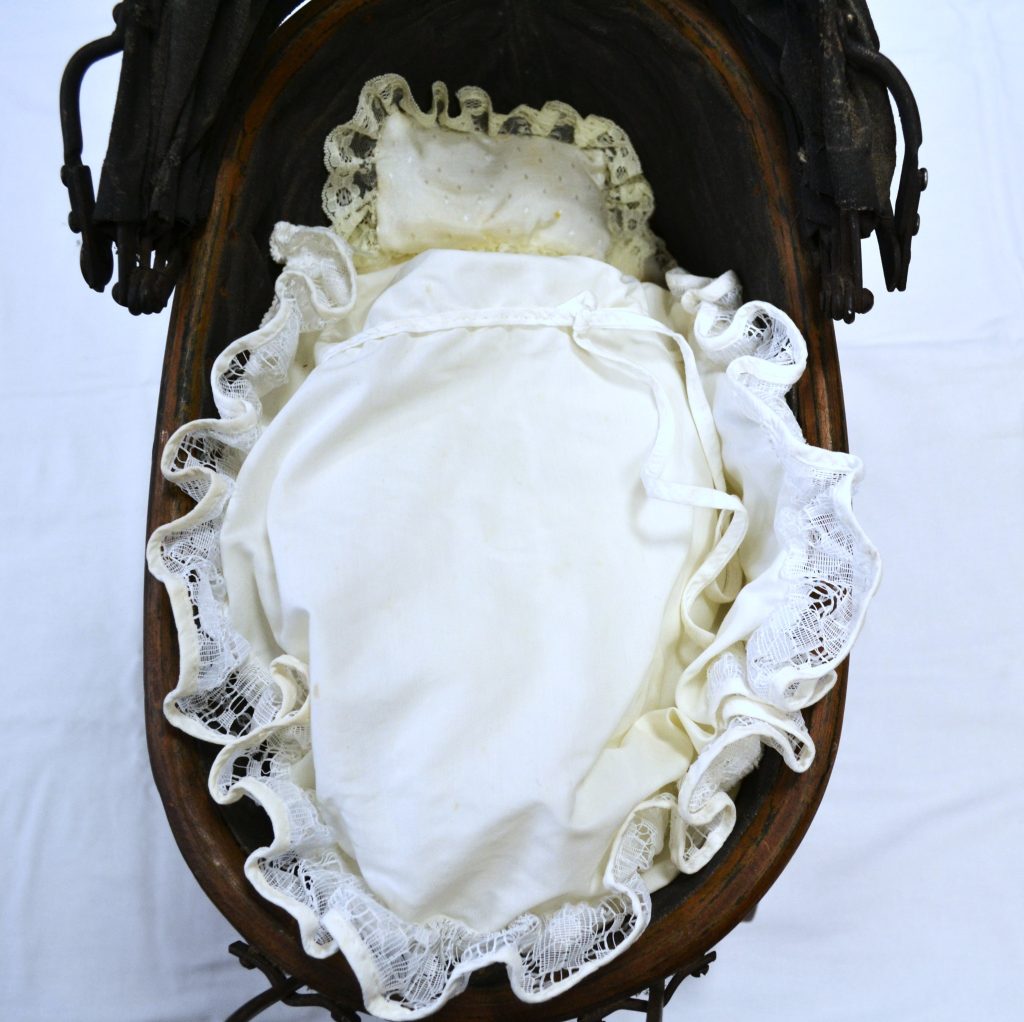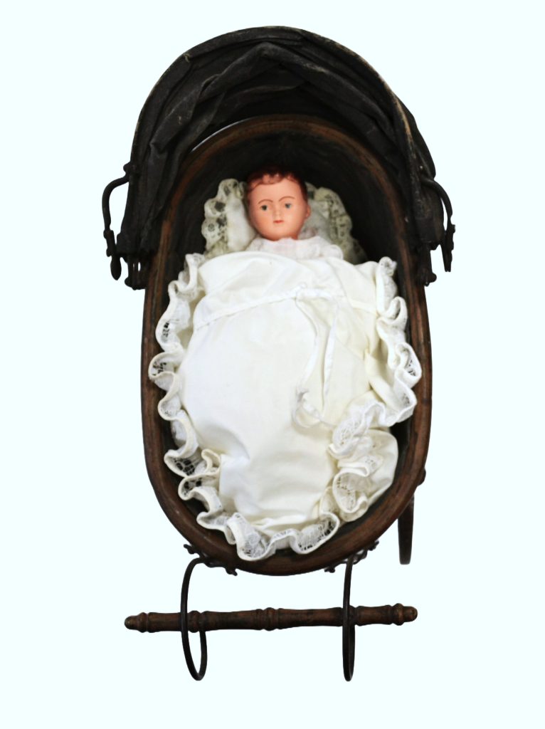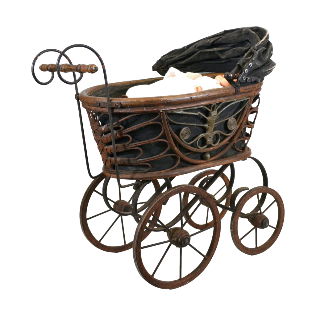 Antieke houten poppenwagen met antieke porseleinen pop.