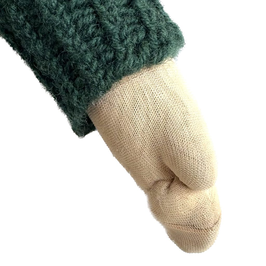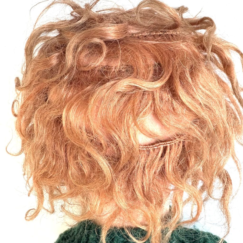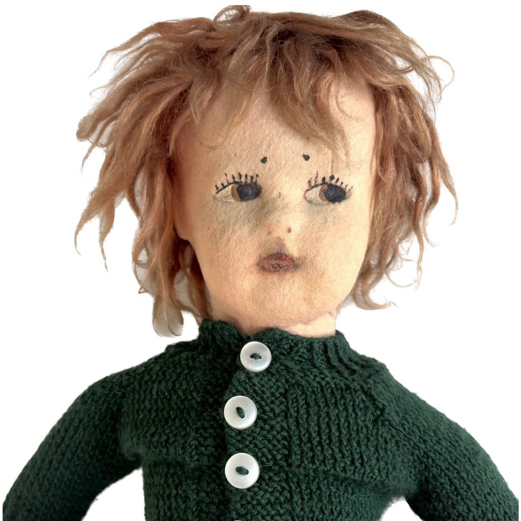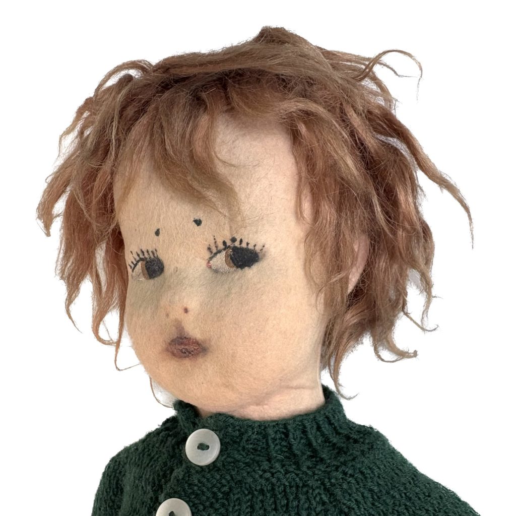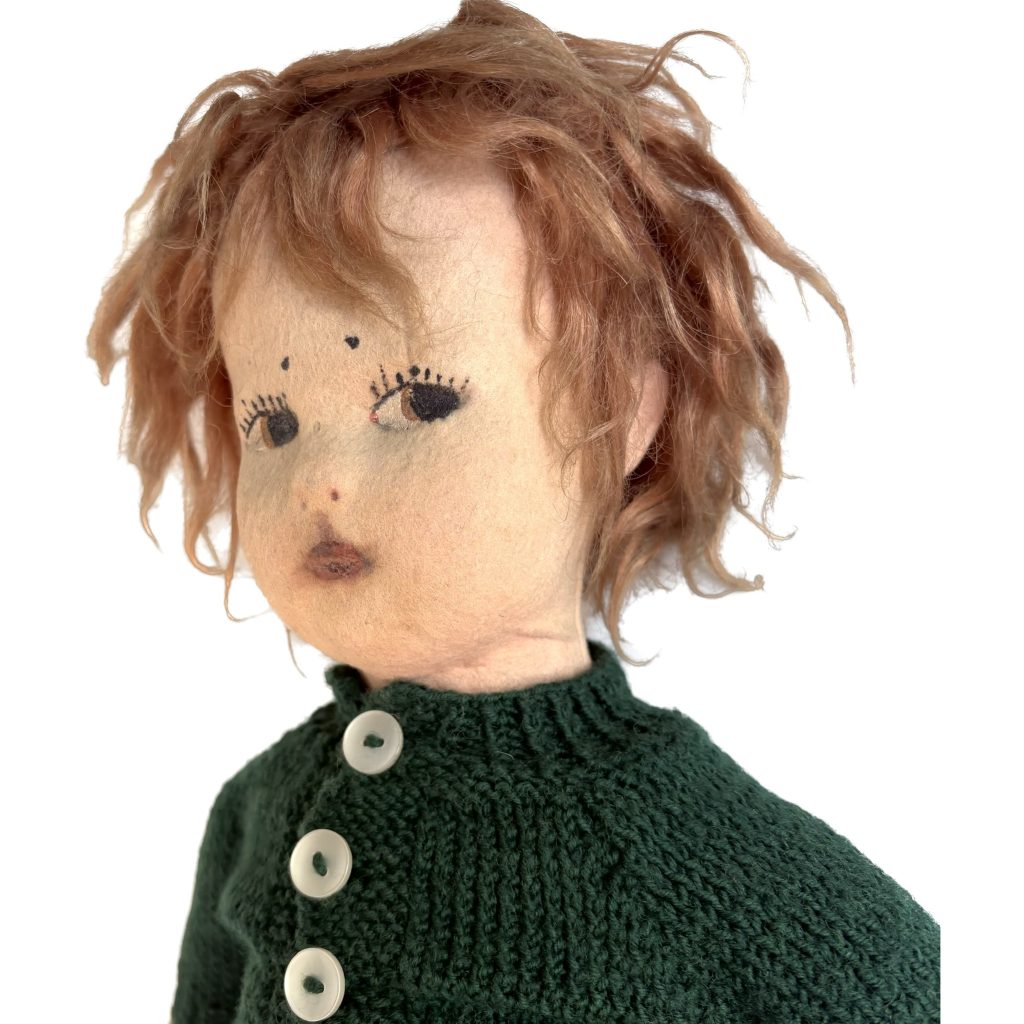 Details: Andere kenmerkende details zijn vilten oren onder het haar en gestikte, wantvormige handen.