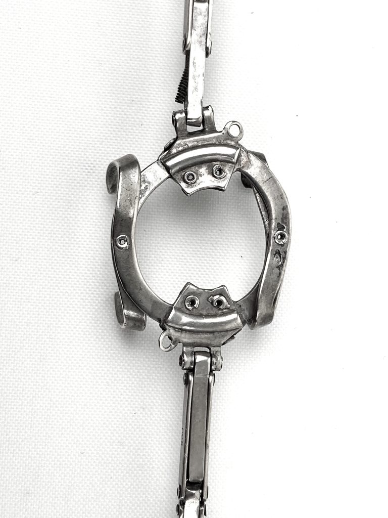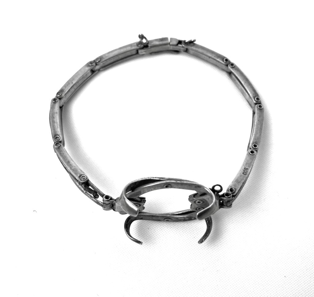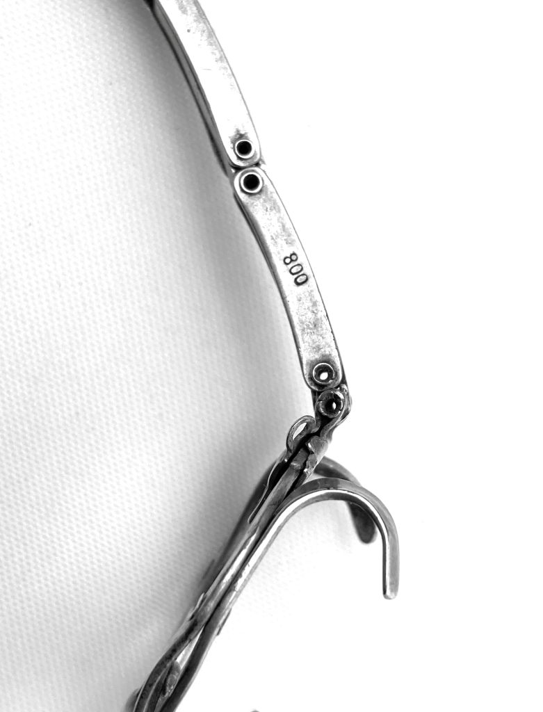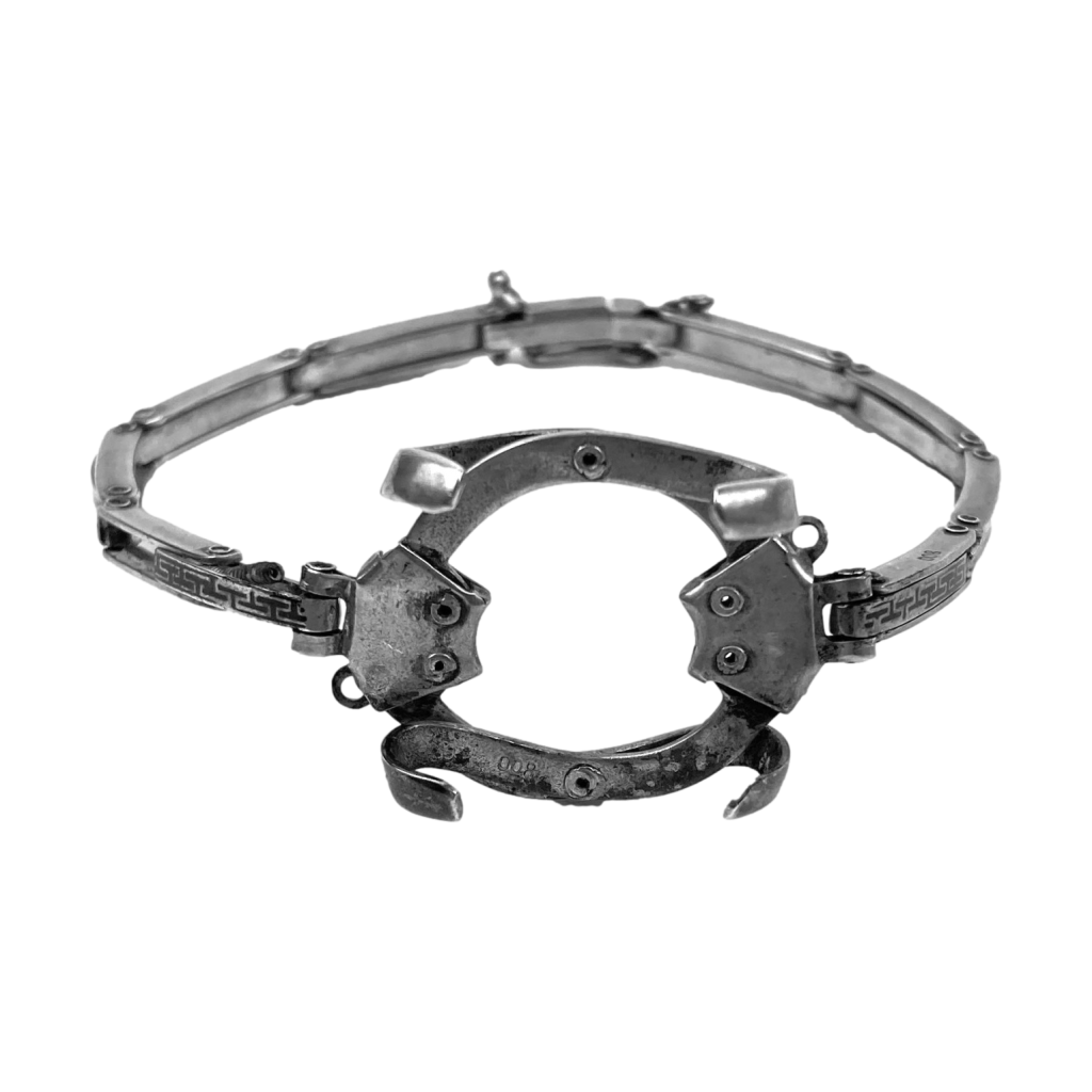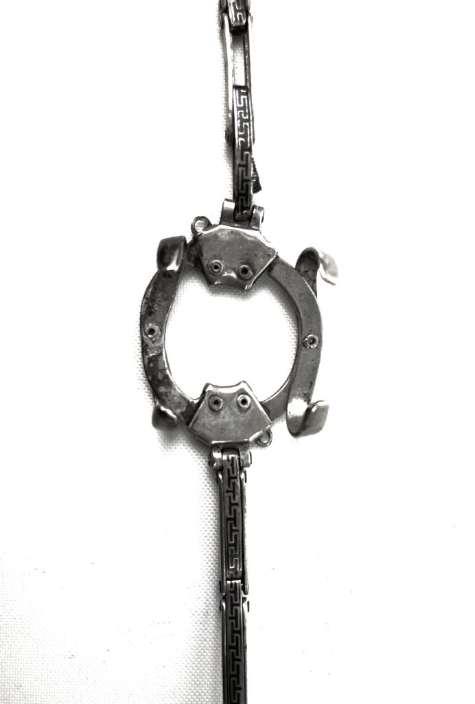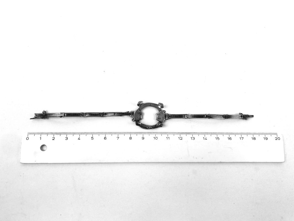 Zilveren (800) armband met meander motiefje. Datering: ca. 1930. Werd gedragen met ingeklemd een horlogeklokje (ontbreekt). Gewicht: 11,3 gram.