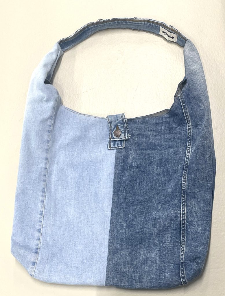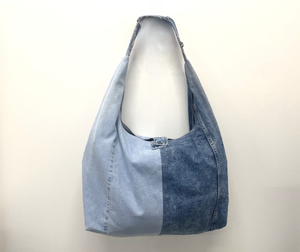 Deze handige en modieuze baggy schoudertas is samengesteld uit opnieuw gebruikte verschillende stukjes blauwe jeansstof, hierdoor kan jouw tas dus net iets anders zijn dan op de foto.
