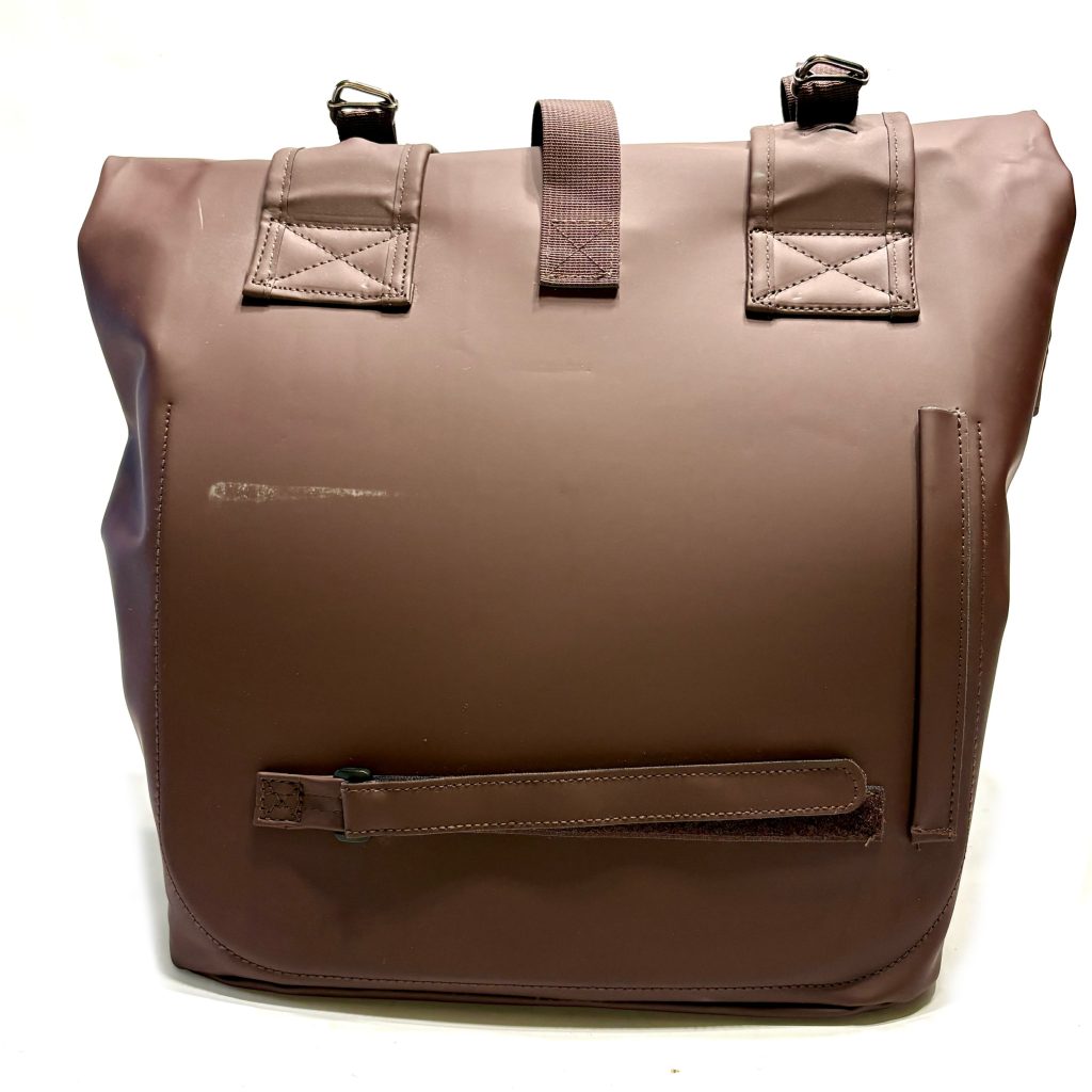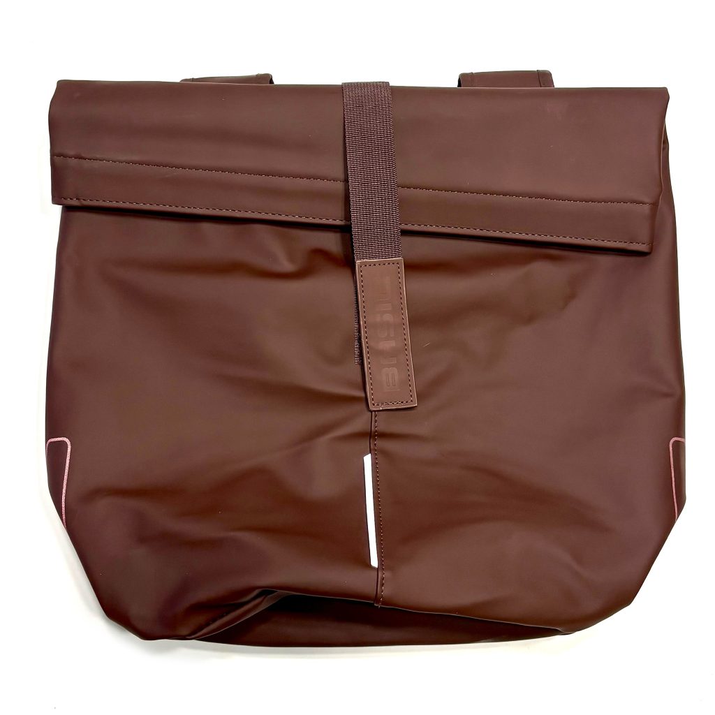 De tas in de kleur roasted brown is verder gemaakt van waterafstotend polyester. Aan veiligheid is ook gedacht, de tas is namelijk voorzien van reflectie op alle zijden en een bevestigingsmogelijkheid voor LED-verlichting.