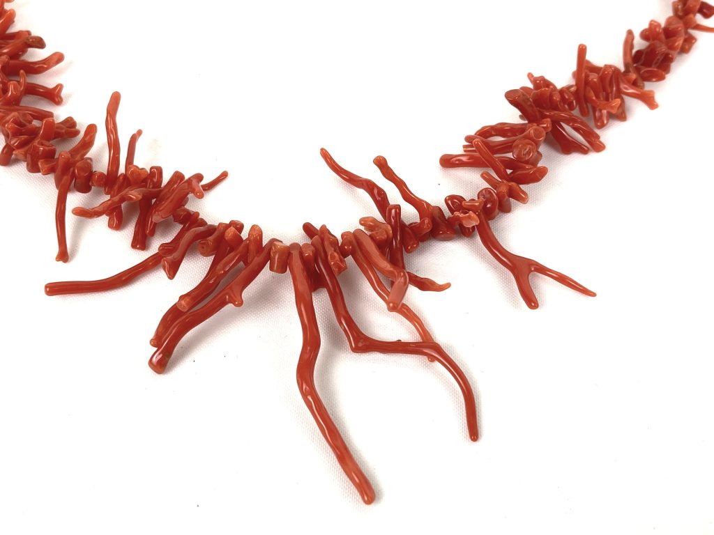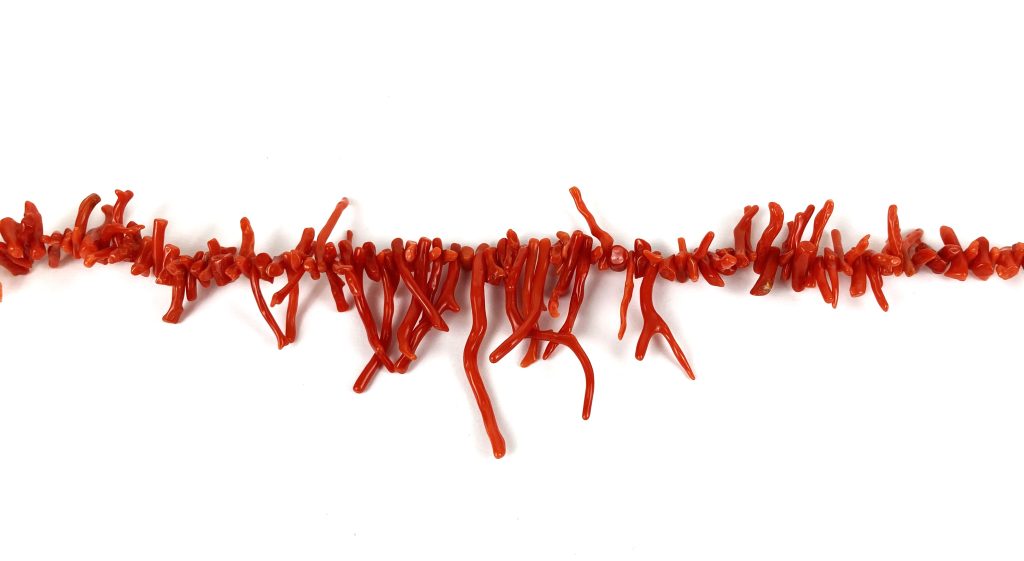 Ketting van bloedkoralen takjes. Lengte: 50 cm. Met goudkleurig metalen slotje.