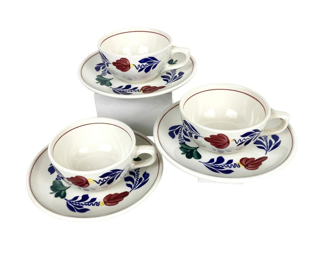 Van Boch Belgium boerenbont: 3 kop- en schotels en 6 melk bekers. Met floraal décor. Eén beker met haarlijn, verder alles in uitstekende staat. Zie ook de andere advertentie van een theepot met theelicht!