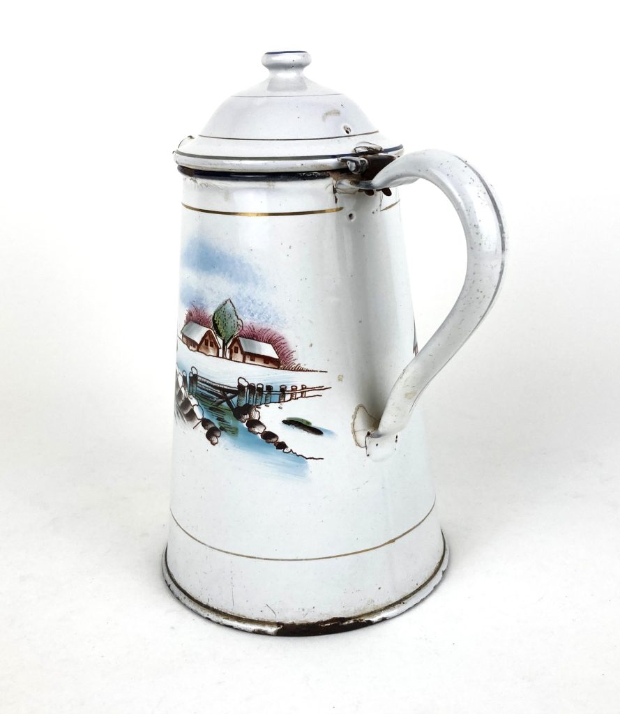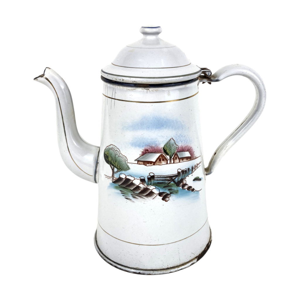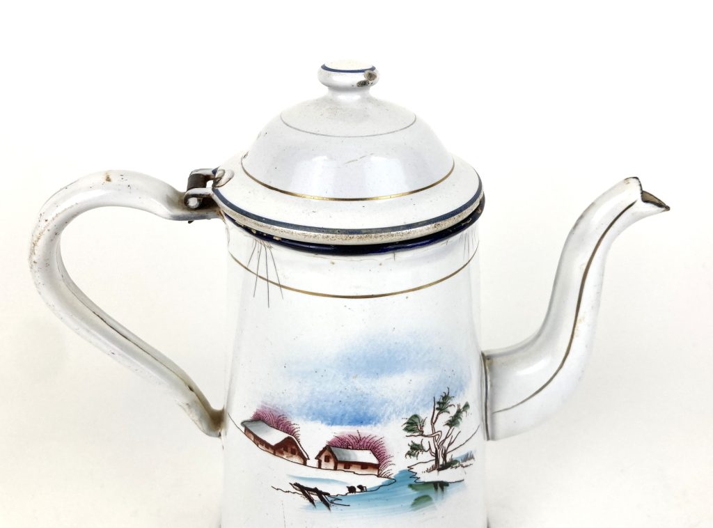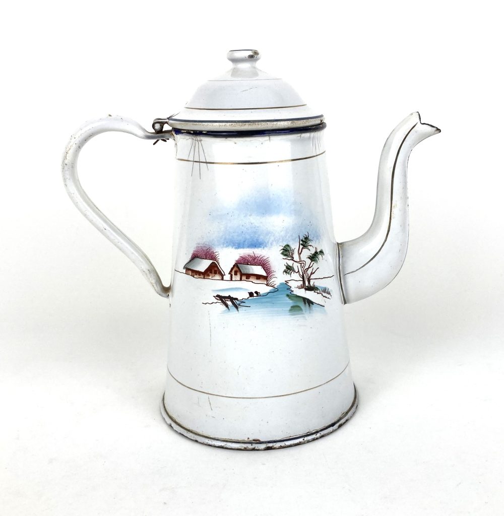 Oude 22 cm. hoge emaille koffiekan, beschilderd met een winters landschap.