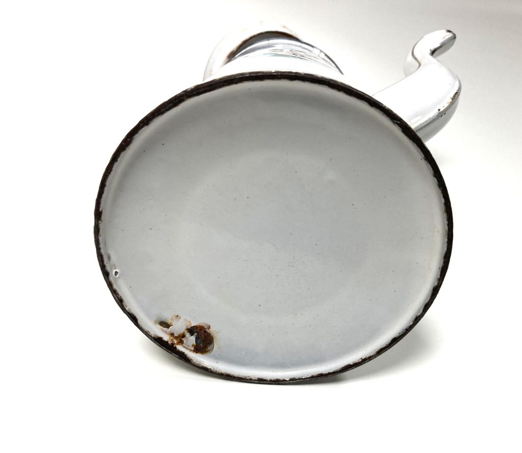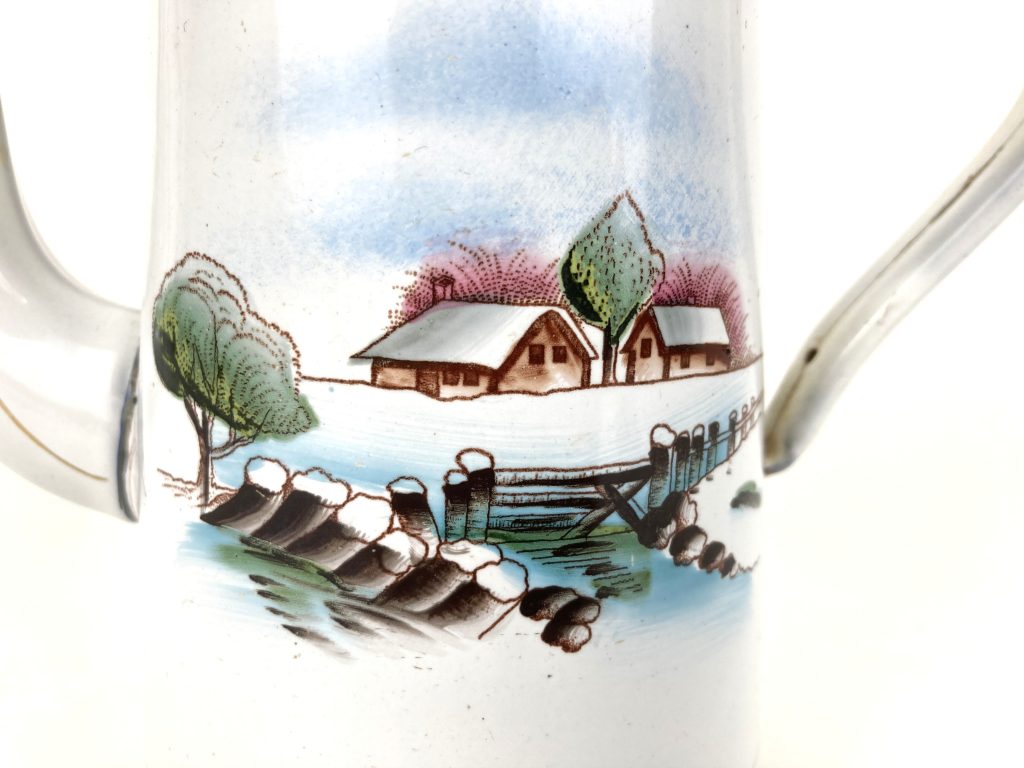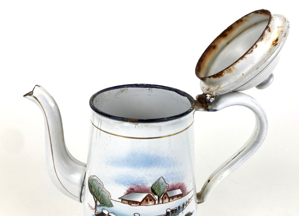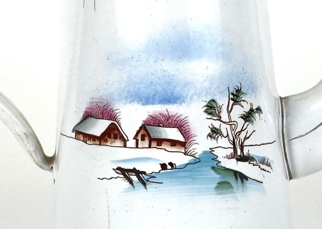 Oude 22 cm. hoge emaille koffiekan, beschilderd met een winters landschap.