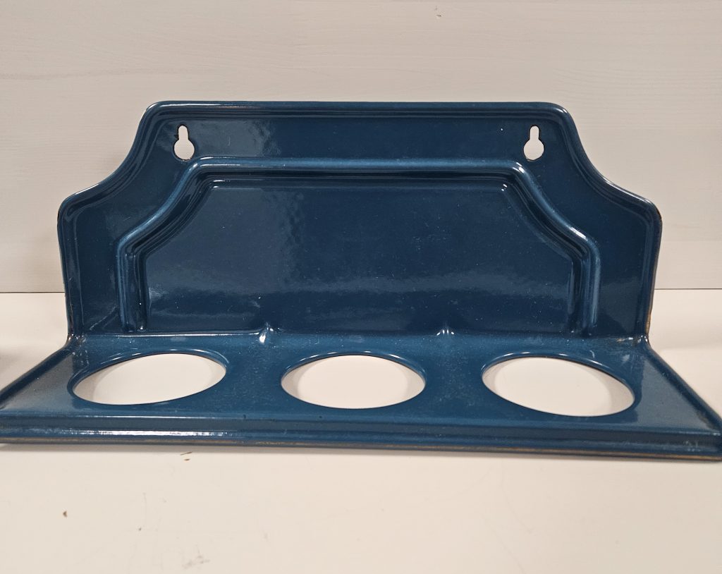 Breng nostalgie in huis met dit brocante zand-zeep-soda rekje in een blauwgroene emaille afwerking. Een blikvanger in keuken of bijkeuken! Dit rekje is niet alleen een sfeervolle decoratie, maar maar kan ook functioneel zijn – ideaal om zeep, borstels of kleine flacons op te bergen. Het rekje is ca. 38 cm lang en 15 cm hoog. De bodem van de bakjes vertoont gebruikssporen, maar dat geeft het een extra vintage tintje.