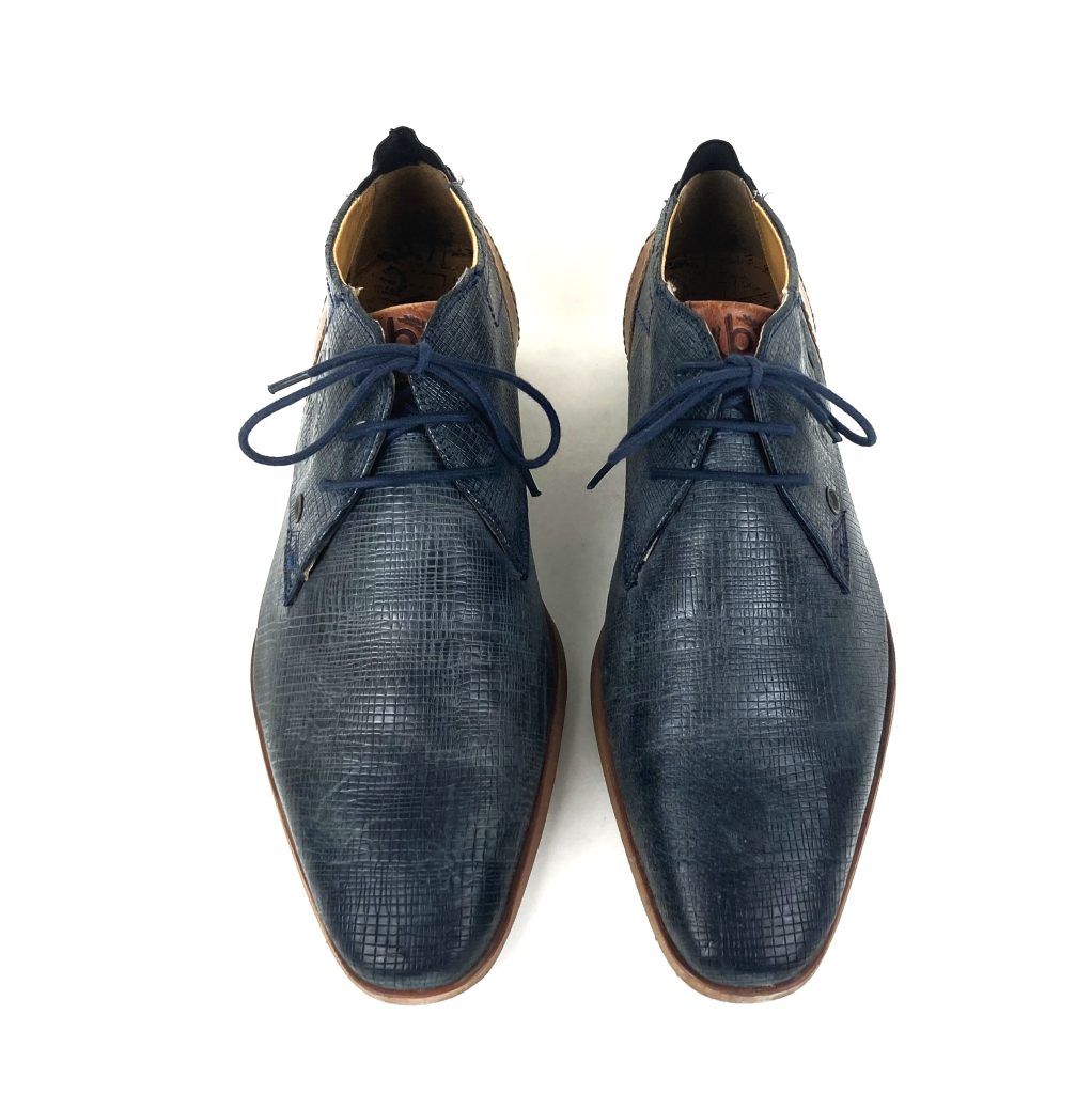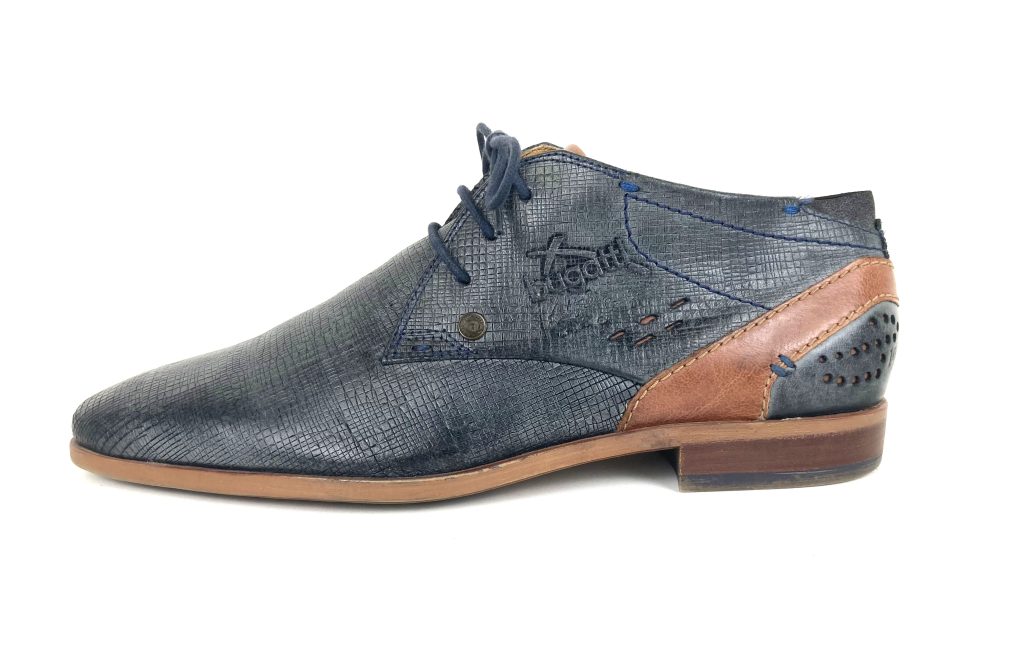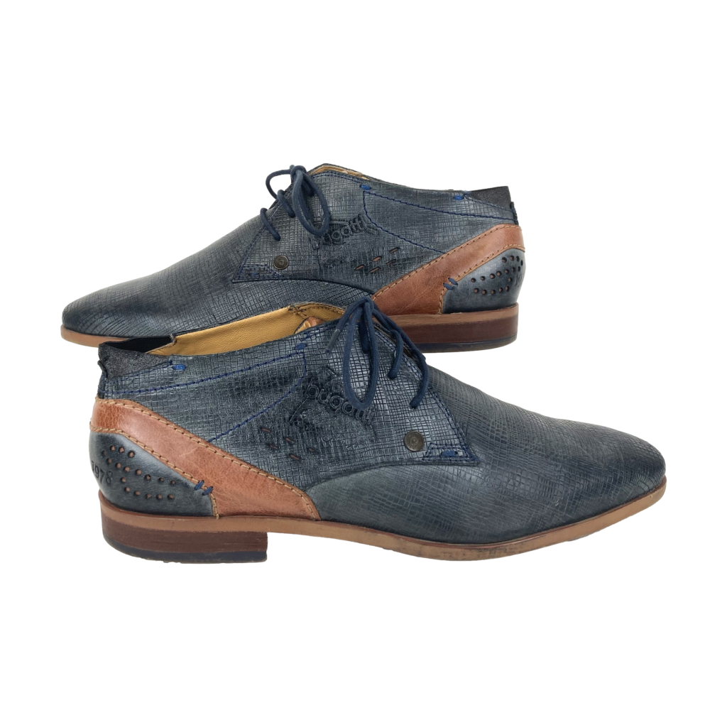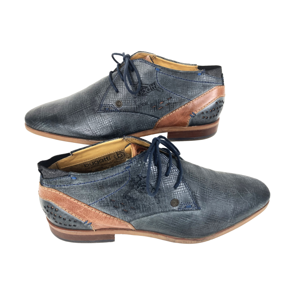 Nette leren veterschoenen van Bugatti. In blauw reptielleer. De hiel heeft opgestikte leer stukken met geperforeerde gaatjes. Met merklogo aan de zijkant en uitneembaar voetbed. Voering: synthetisch. Binnenzool: synthetisch. Buitenzool: rubber.