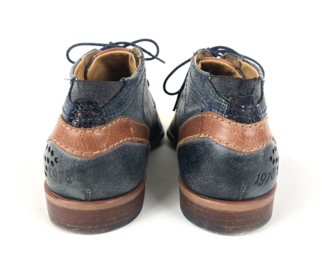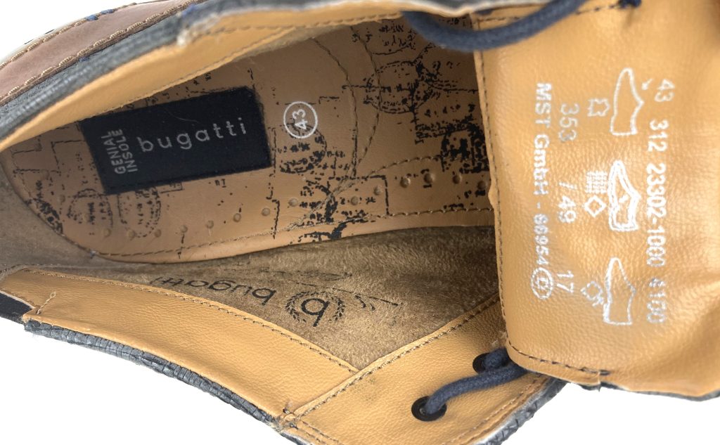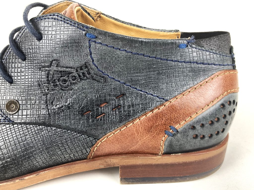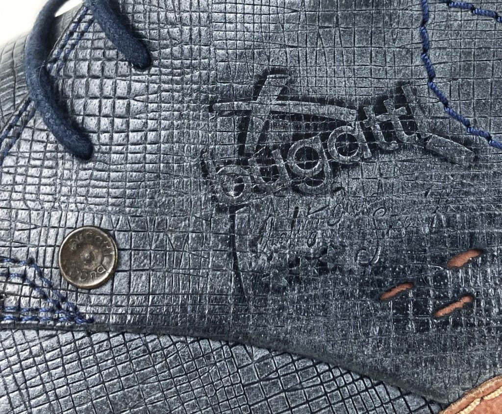 Nette leren veterschoenen van Bugatti. In blauw reptielleer. De hiel heeft opgestikte leer stukken met geperforeerde gaatjes. Met merklogo aan de zijkant en uitneembaar voetbed. Voering: synthetisch. Binnenzool: synthetisch. Buitenzool: rubber.