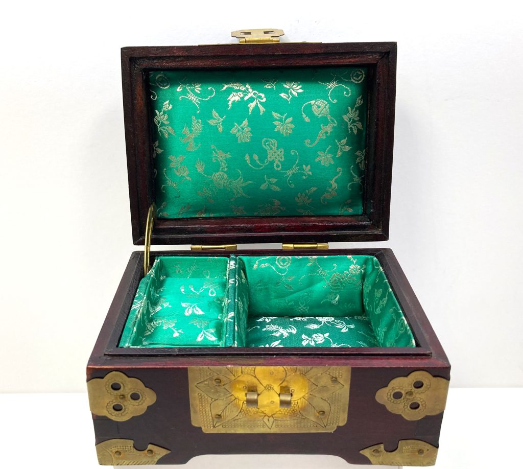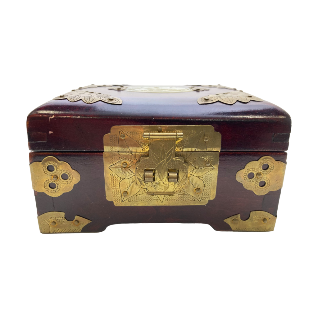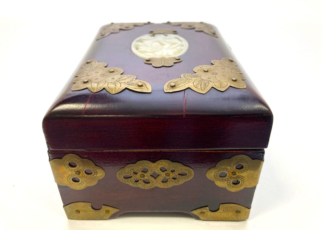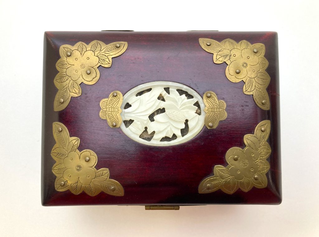 Chinees palissanderhouten sieradenkistje uit Shanghai. Met uitgesneden jade bloemmotief in deksel en messing beslag.