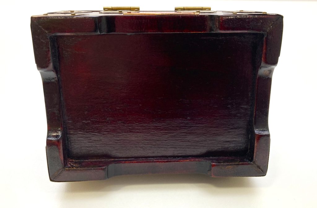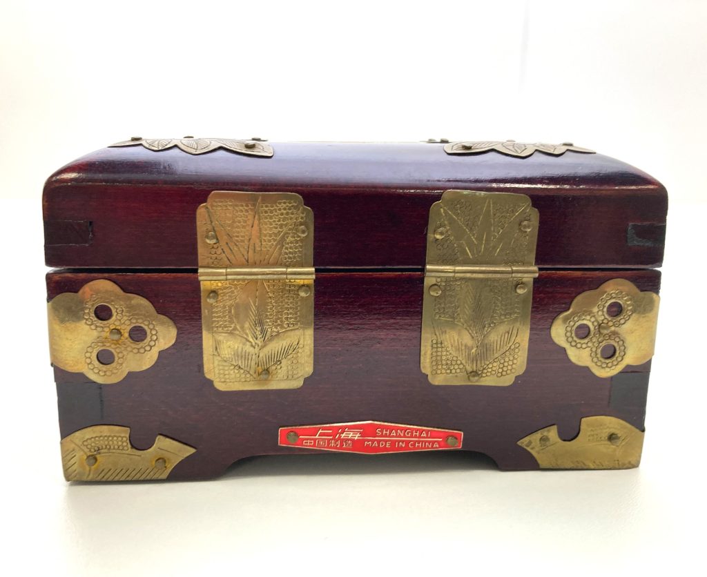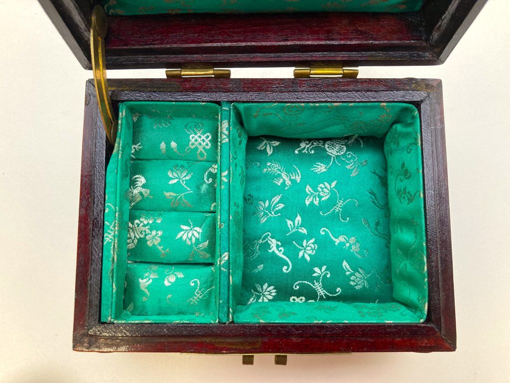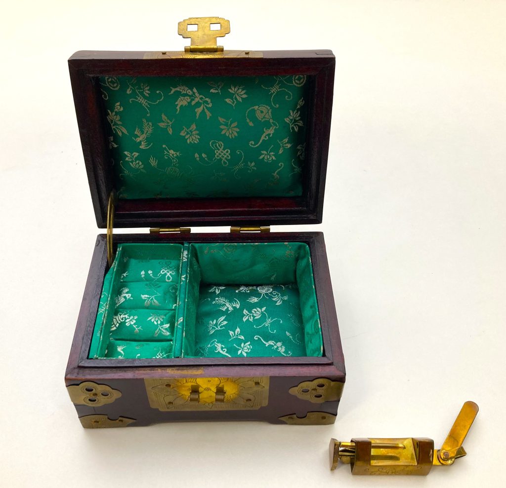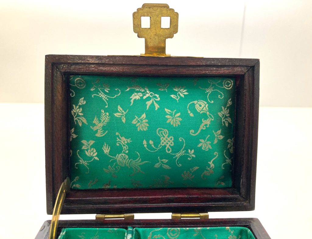 Chinees palissanderhouten sieradenkistje uit Shanghai. Met uitgesneden jade bloemmotief in deksel en messing beslag.