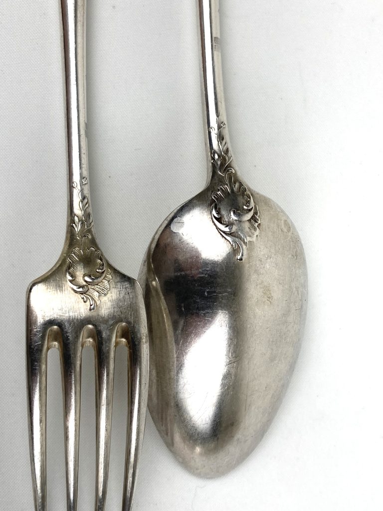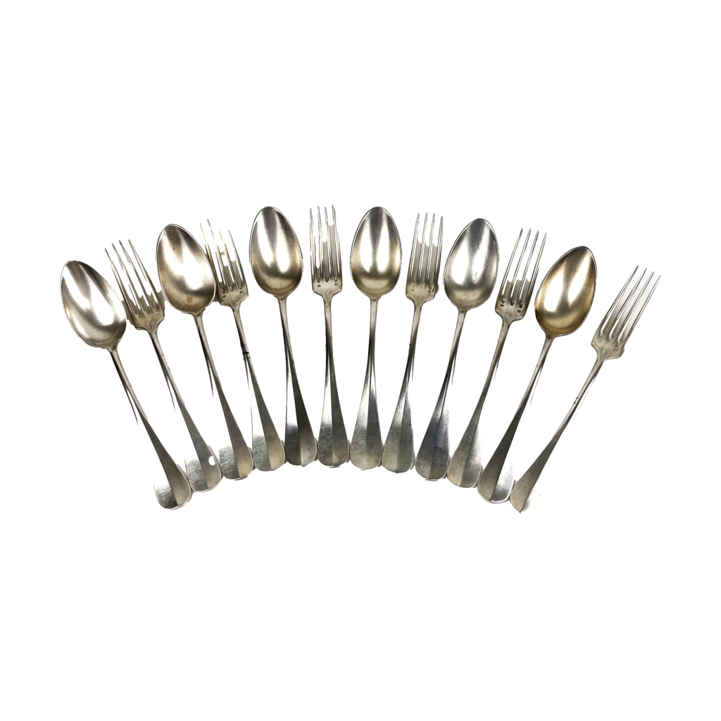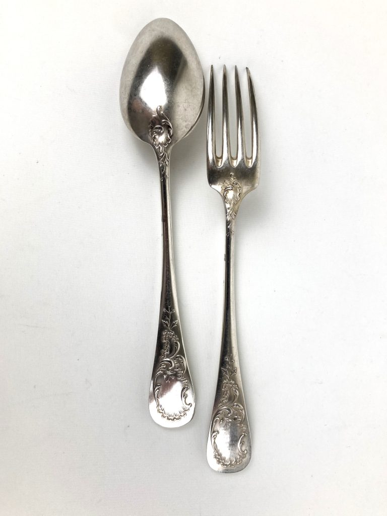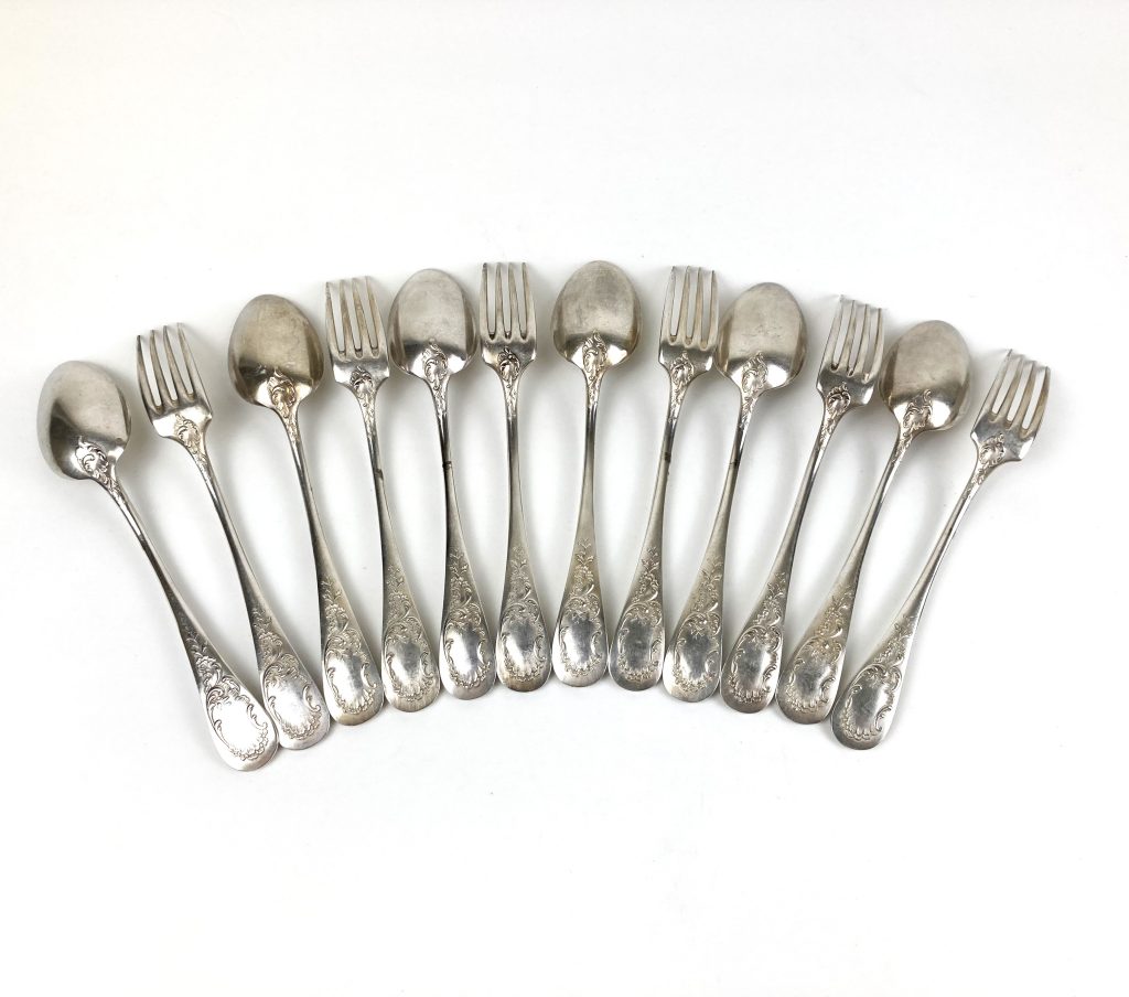 6 Dinerlepels en 6 dinervorken van Christofle. Gemerkt: Metal alliages blanc en 40 Gr. Met motief aan achterzijde. Van wit metaal.