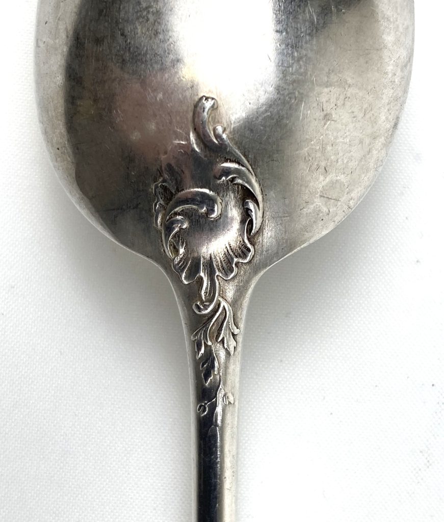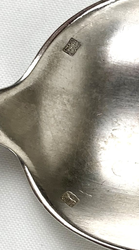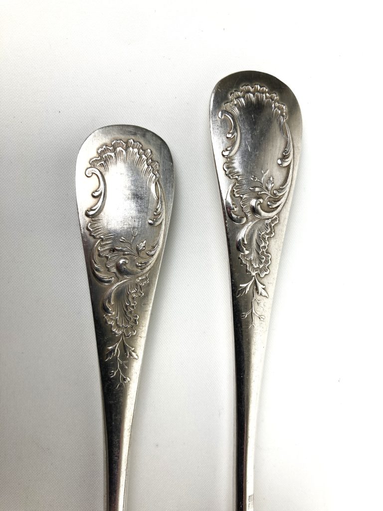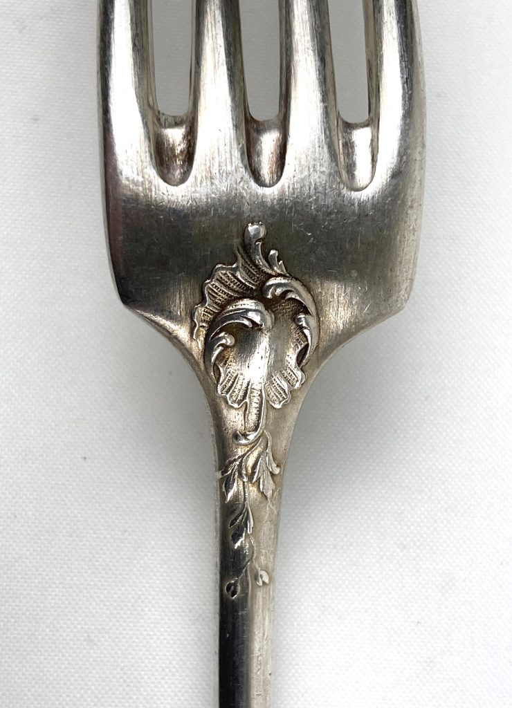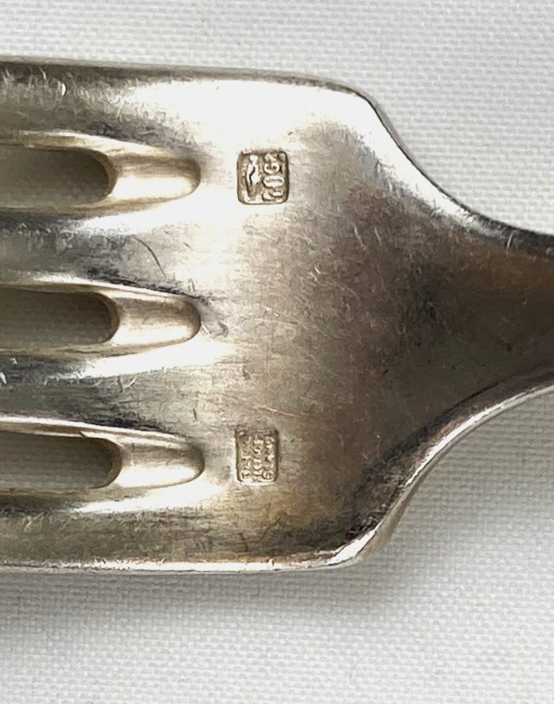 6 Dinerlepels en 6 dinervorken van Christofle. Gemerkt: Metal alliages blanc en 40 Gr. Met motief aan achterzijde. Van wit metaal.