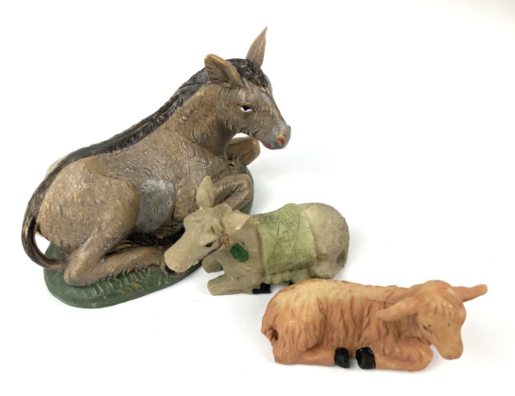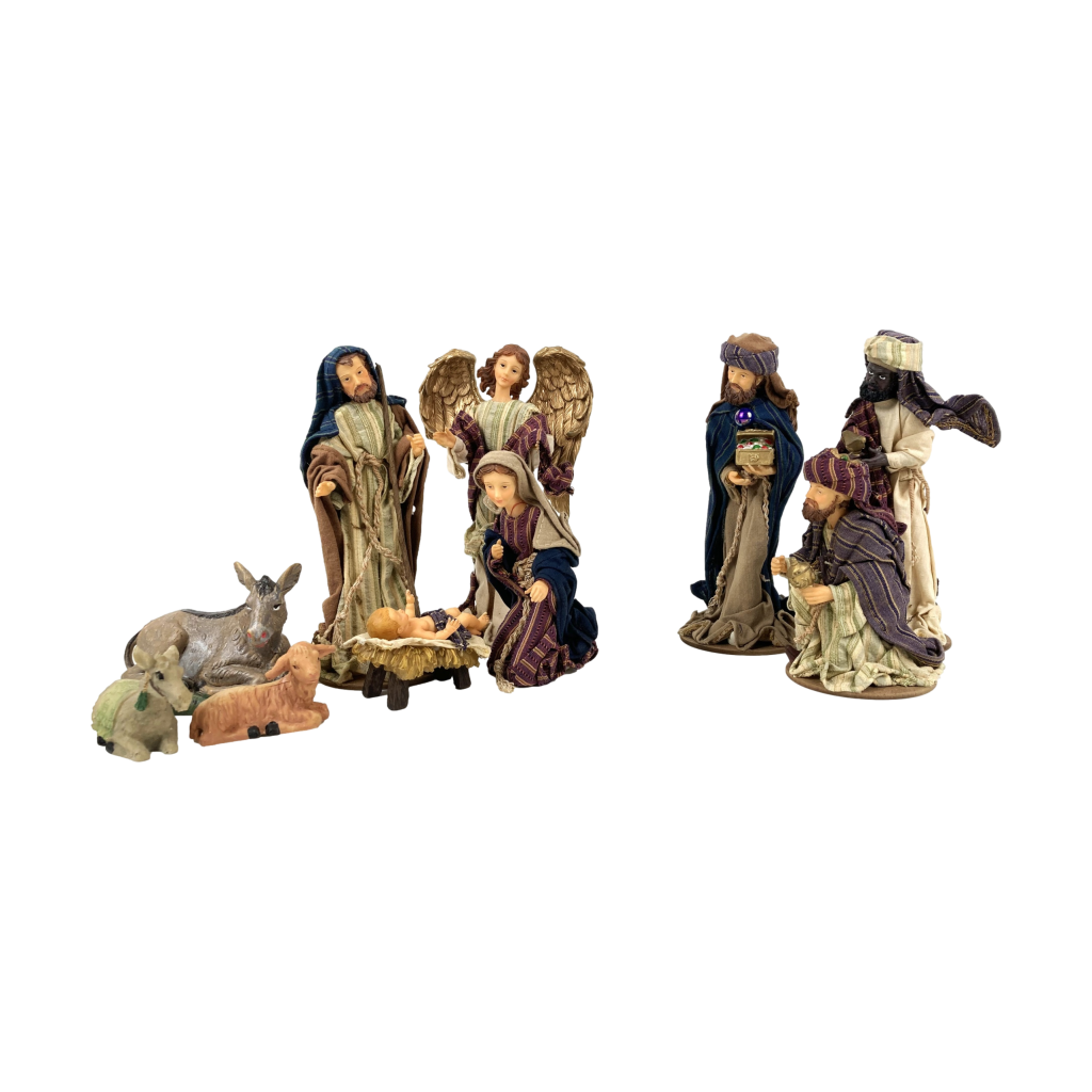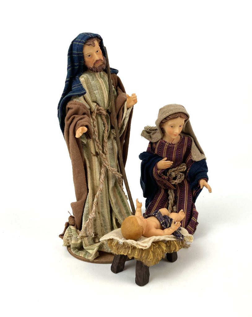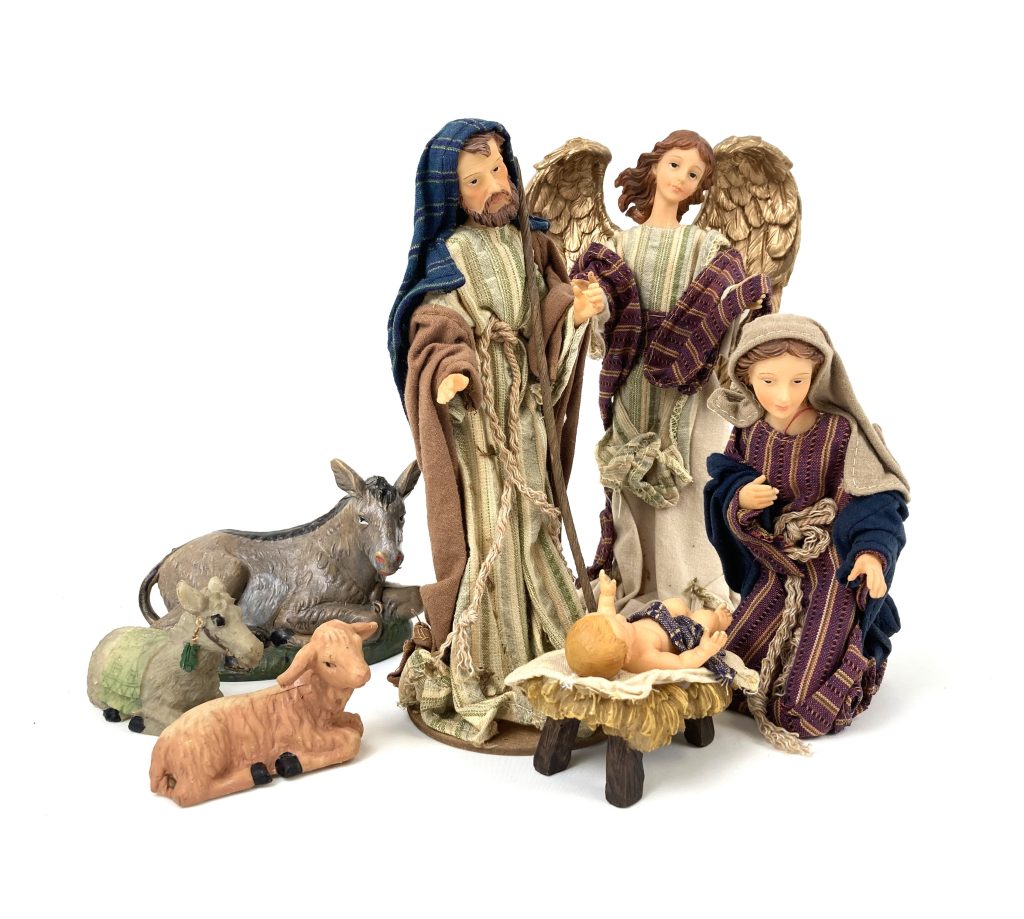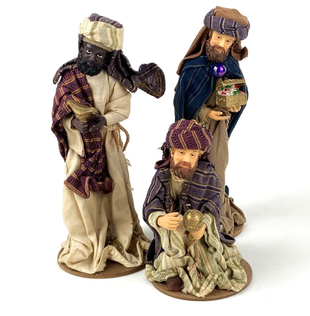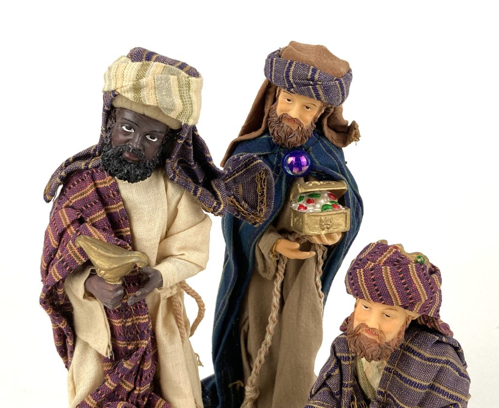 Complete Kerstgroep t.b.v. Kerststal. Gemaakt in Italië. Materiaal: kunststof (hars?) met stof.