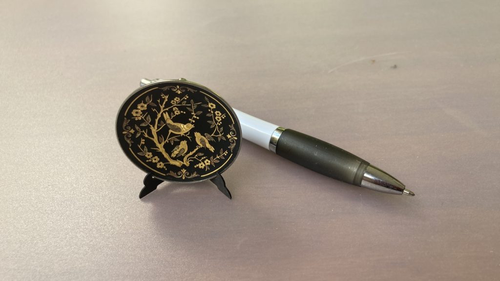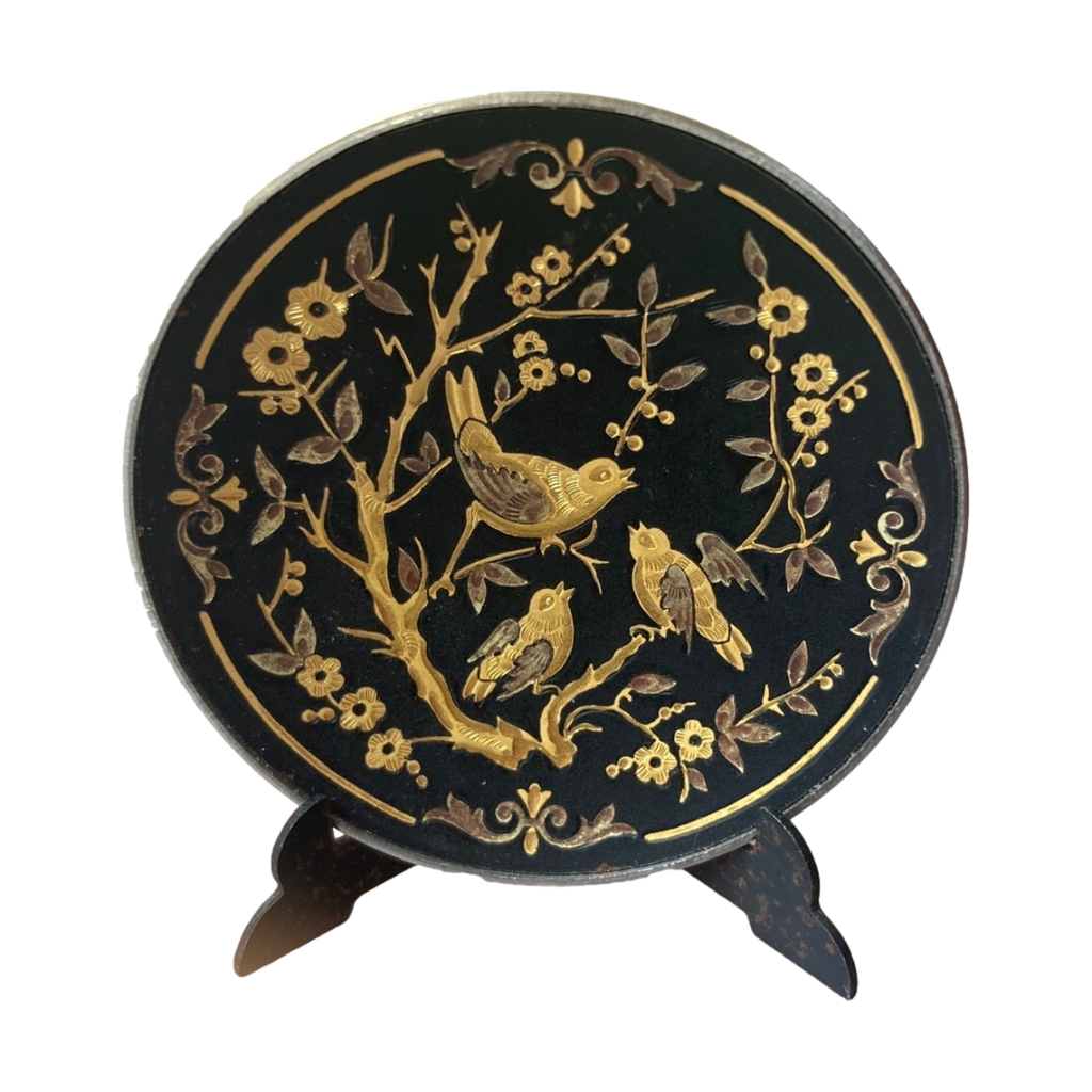 Prachtig decoratief displaybord met handgemaakt goud (Amarillo 24 kts. en Verde 18 kts.) het damasceen designwerk met een vogel- en bloemendesign. Dit bord is rond van vorm en heeft een diameter van 4,5 cm.