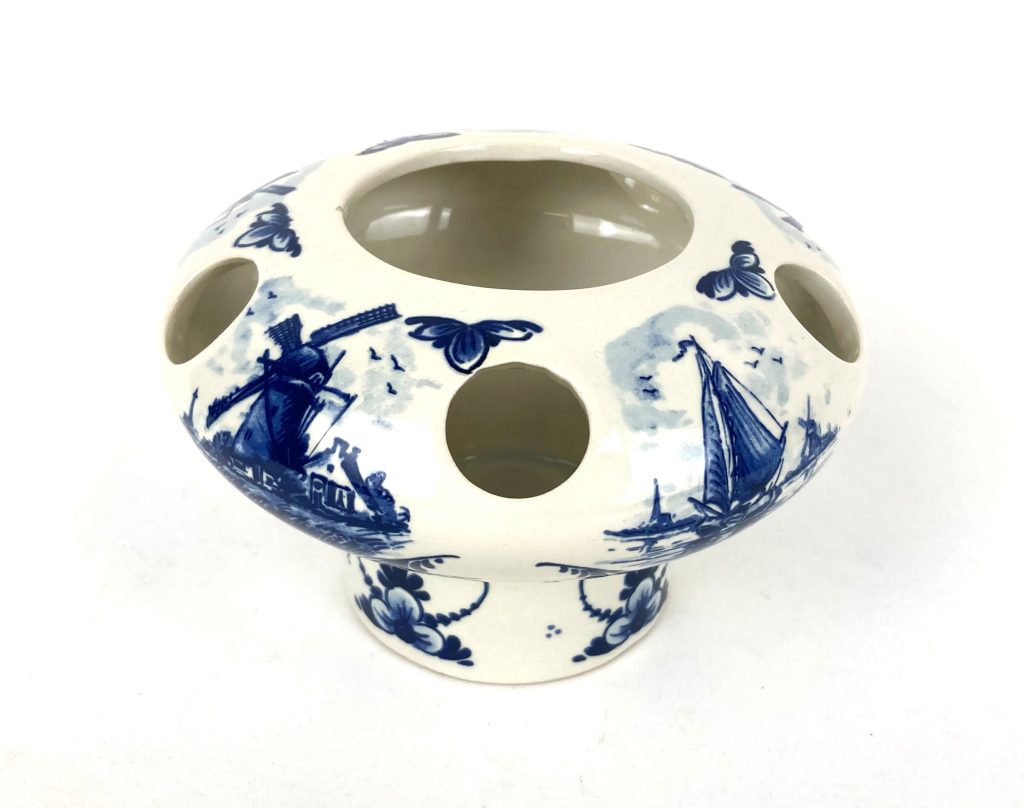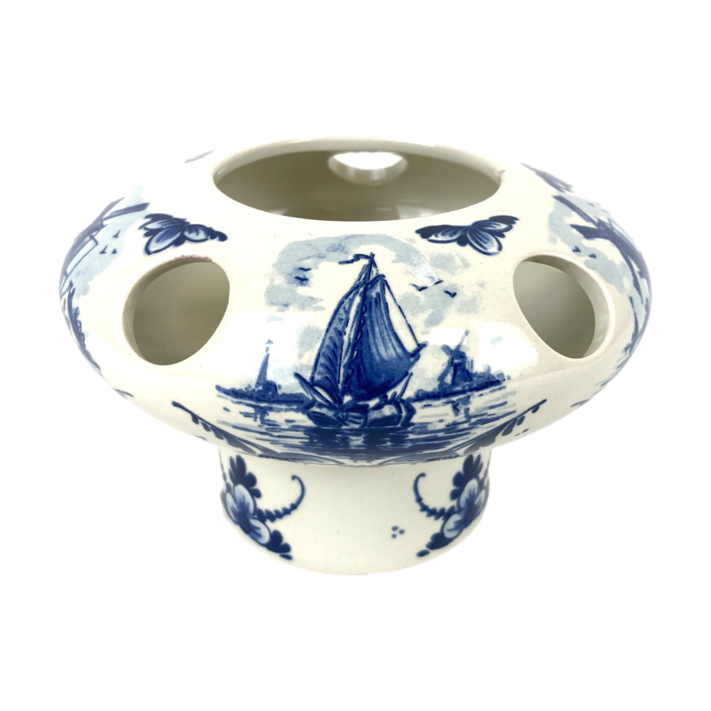 Delftsblauw porseleinen tulpenvaasje met décor van o.a. molens en schepen. Model nr. 208. Ongemerkt. Hoog: 10 cm. Diameter voet: 8 cm. Diameter: 15 cm. In uitstekende staat.