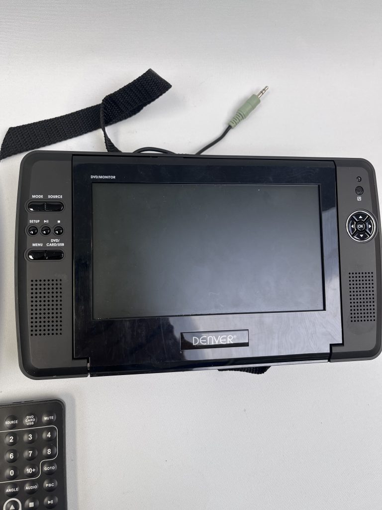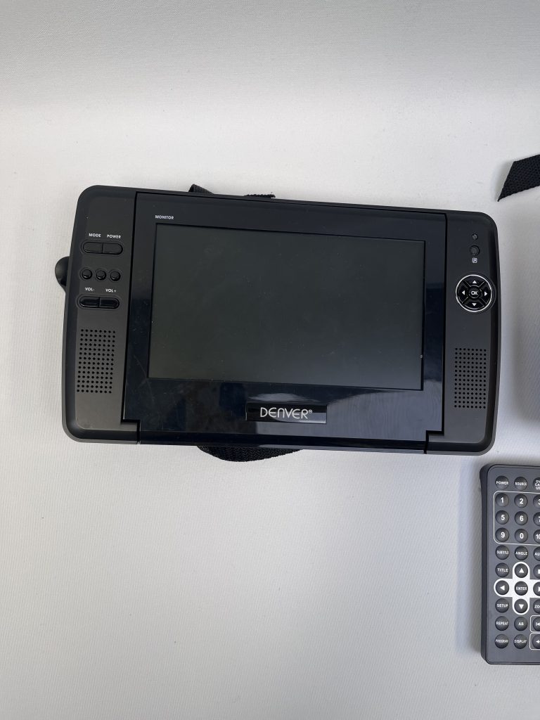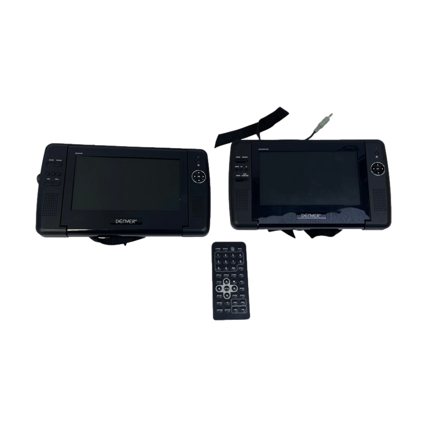 Handige Denver DVD-speler met twee schermen, ideaal voor onderweg. Bevestigbaar aan hoofdsteunen. Inclusief afstandsbediening en voedingskabels.