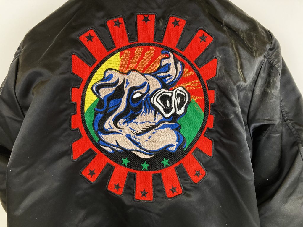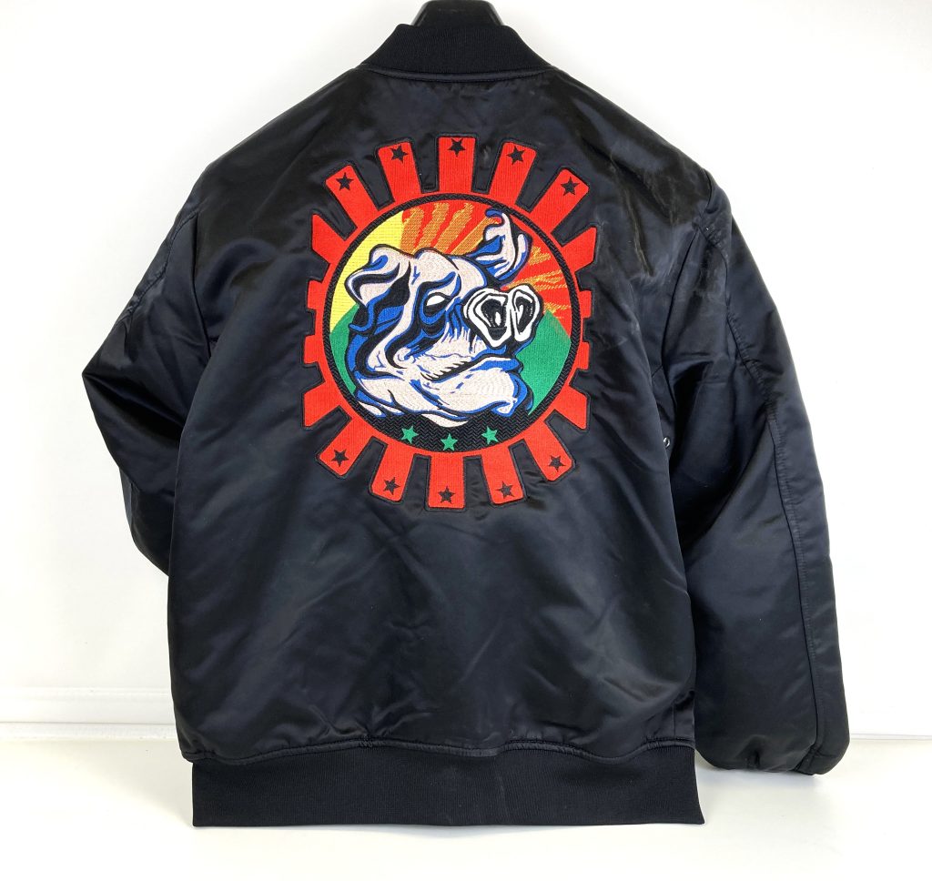 Omkeerbaar. De ene kant is volledig zwart en op de achterkant bevindt zich een grafisch borduursel, de andere kant is een volledig wit logo op een zwarte achtergrond. De jas heeft een geribde kraag, manchetten en taille. Compleet met een ritssluiting aan de voorkant en twee diagonale zakken aan elke kant. Klassieke pasvorm. Lengte: 70 cm. Van oksel tot oksel: 57 cm. Mouwlengte vanaf schoudernaad: 67 cm. In nieuwstaat.