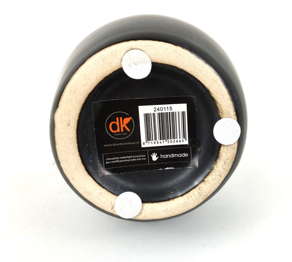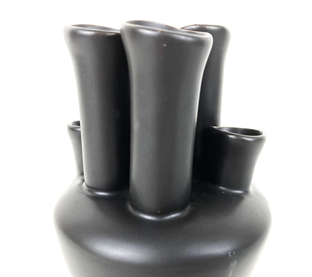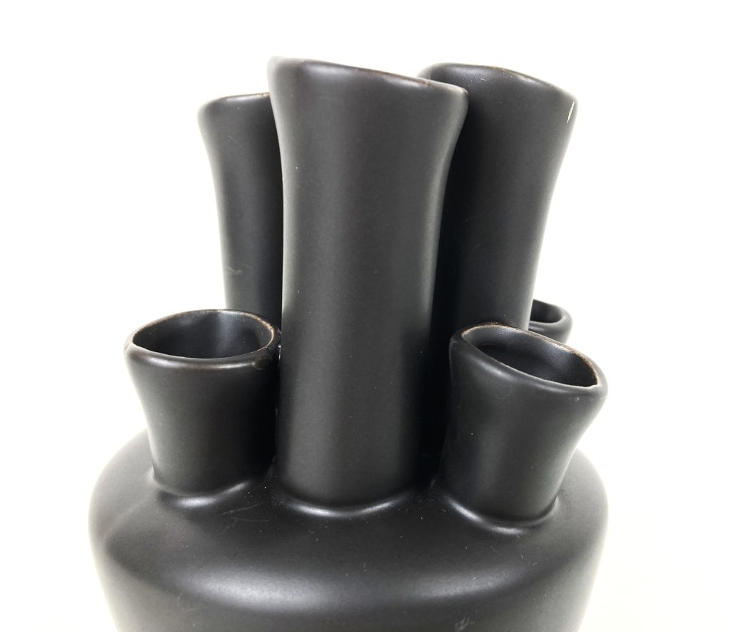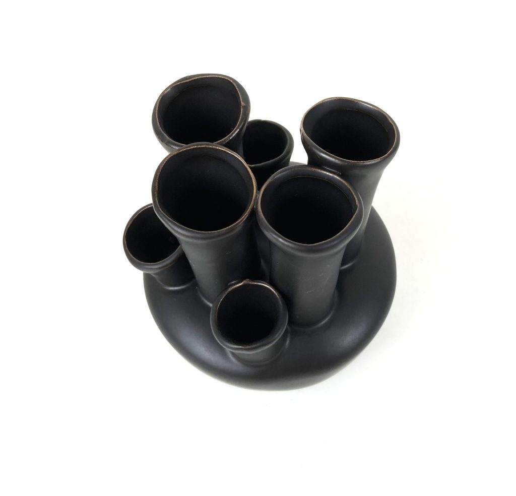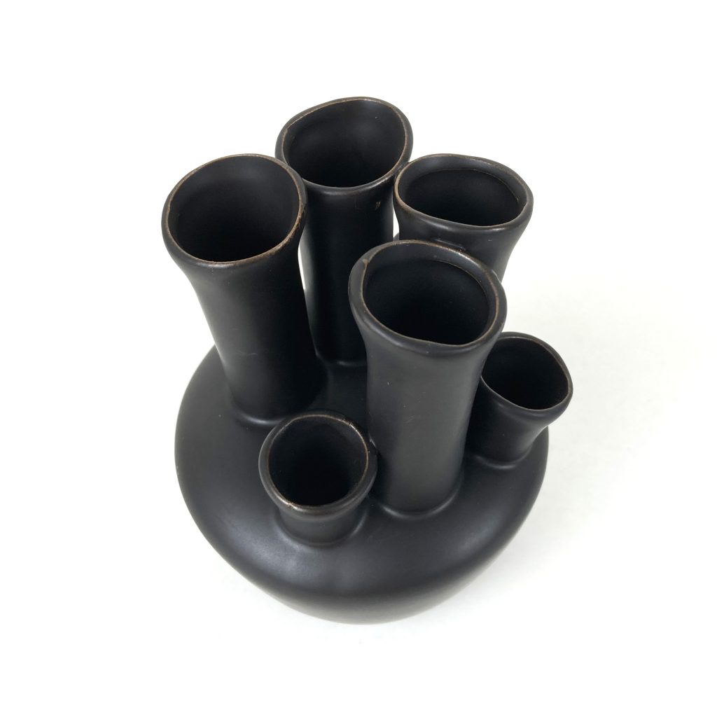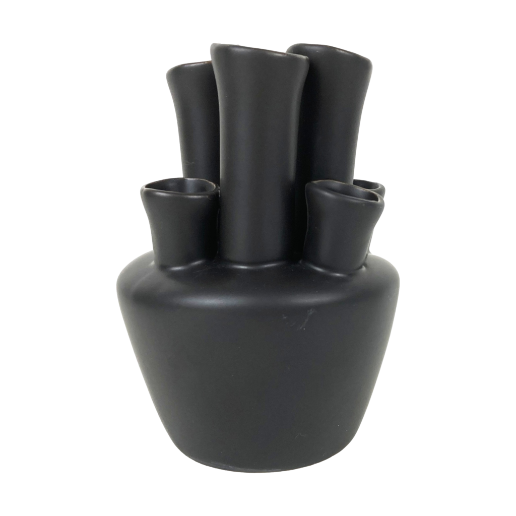 Aardewerken tulpenvaas in zwart/antraciet. Merk: DK. Handgemaakt. Voor 7 bloemen. Hoog: 15 cm. Diameter: 11 cm. In uitstekende staat.