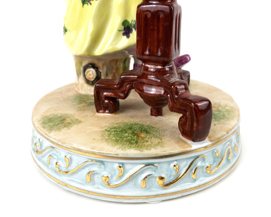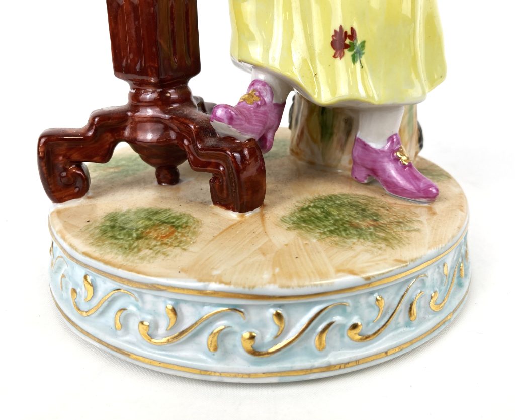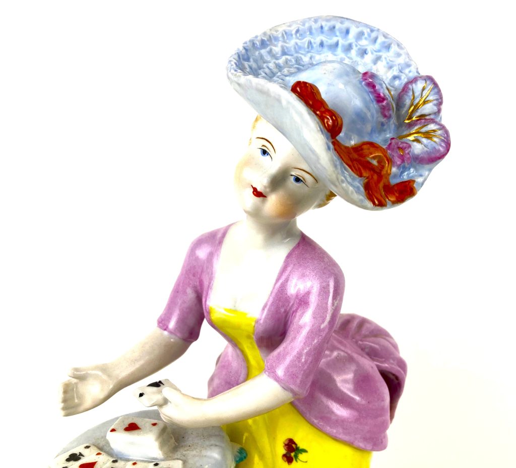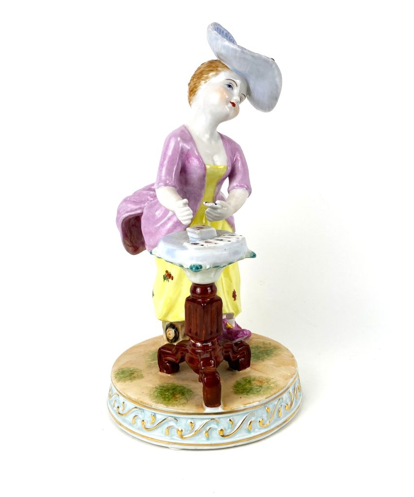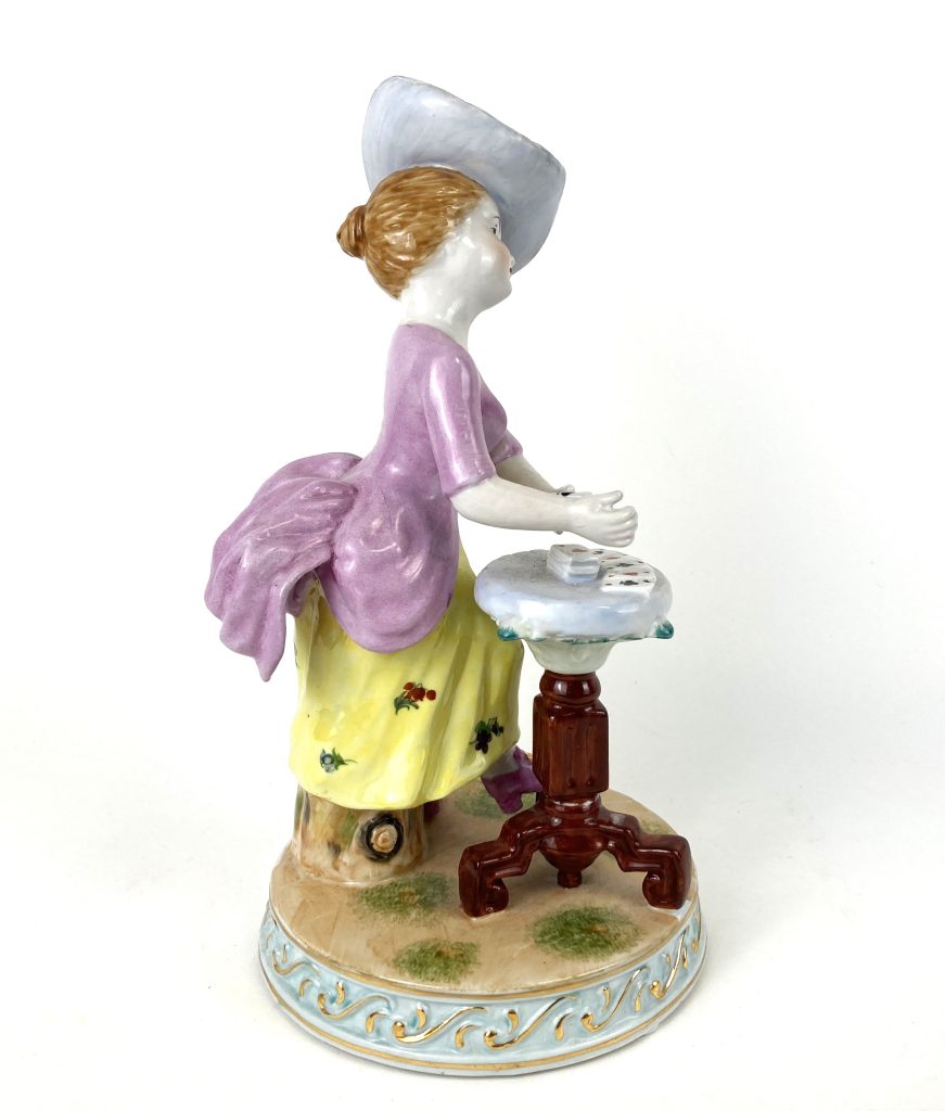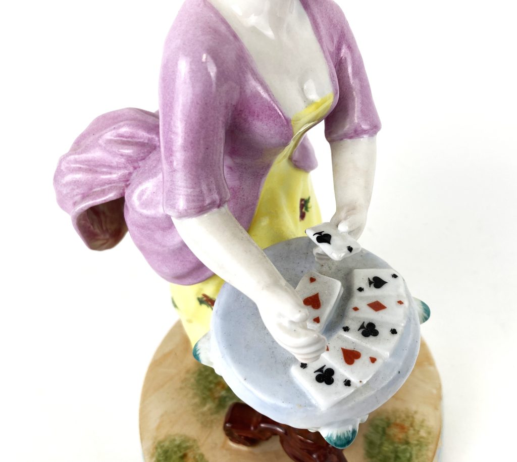 Beeld van een kaart spelende vrouw van Dresden porselein (Duitsland). Gemerkt met een Z met kroon. Hoog: 30 cm. In uitstekende staat.