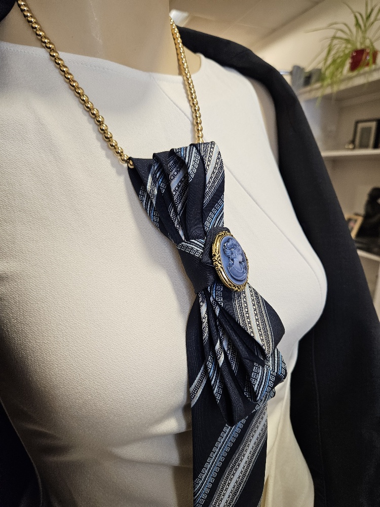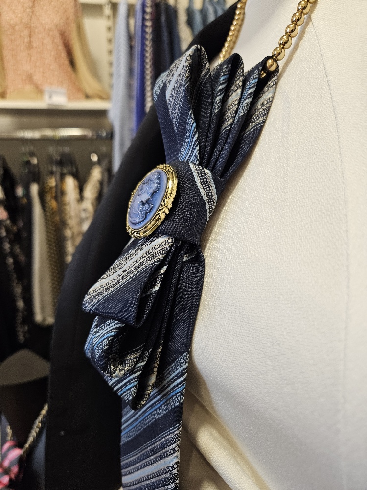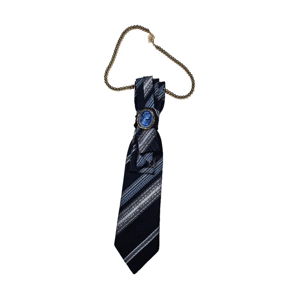 Het ontwerp vertelt een verhaal van duurzaamheid: in plaats van nieuwe materialen te gebruiken, krijgt een bestaande stropdas een nieuw leven, terwijl een vergeten broche opnieuw mag schitteren. Door hergebruik en creatief upcycling ontstaat een mode-item dat niet alleen opvalt door zijn uitstraling, maar ook door zijn bewuste keuzes.