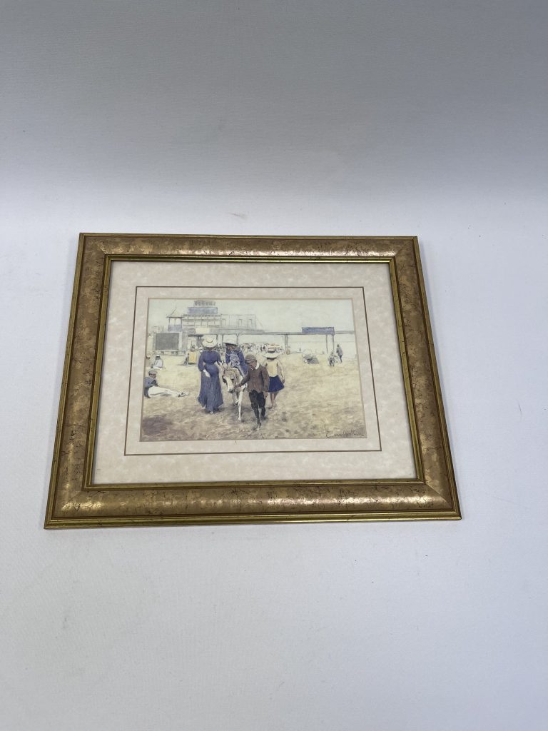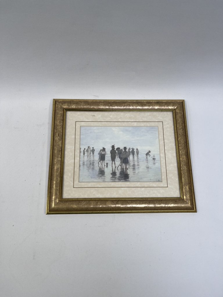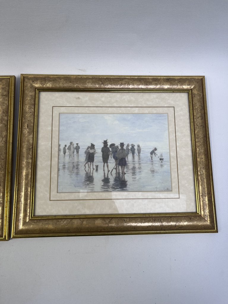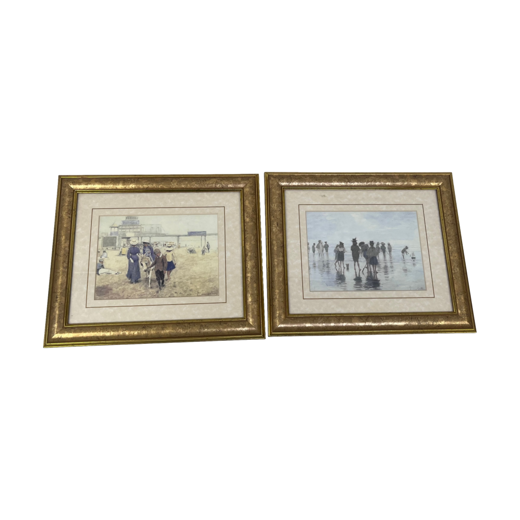 Beide werken tonen strandscènes. De schilderijen zijn uitgevoerd in olieverf en vermoedelijk afkomstig uit de late 19e of vroege 20e eeuw. Ze zijn voorzien van bijpassende lijsten die de klassieke uitstraling versterken.