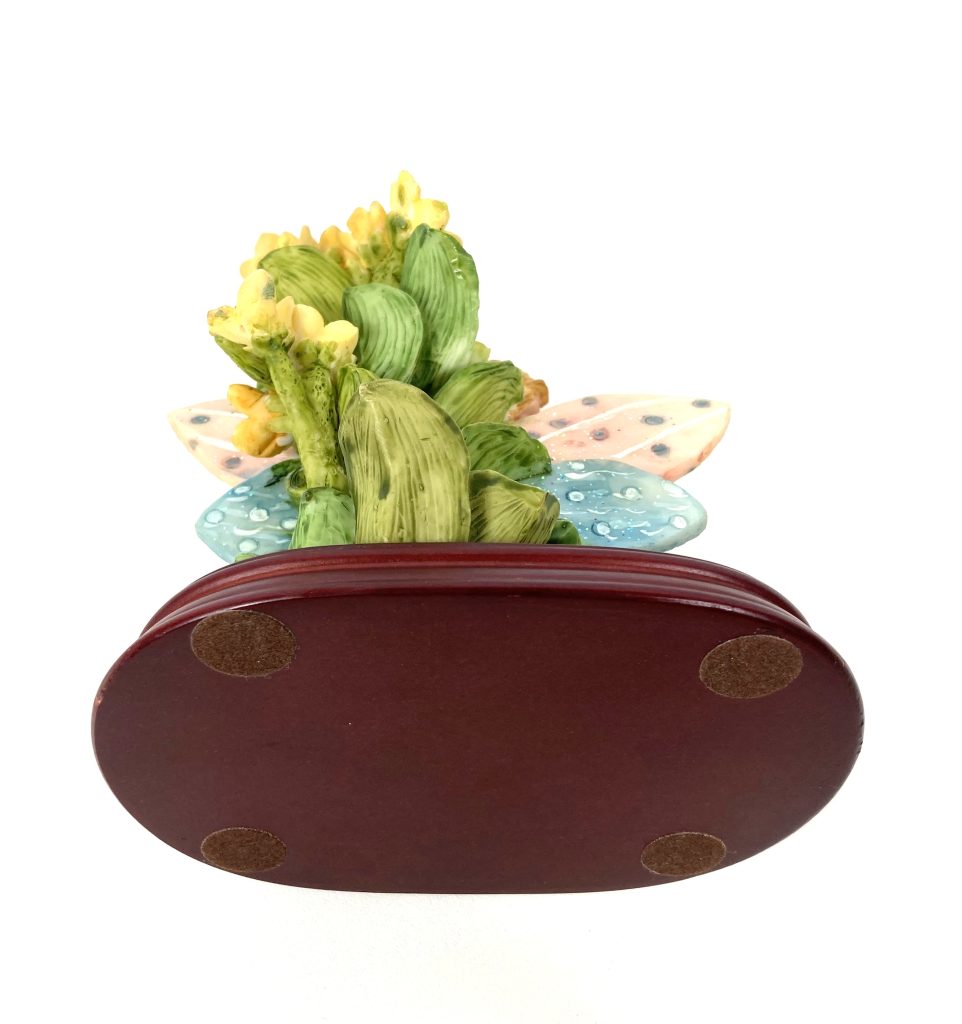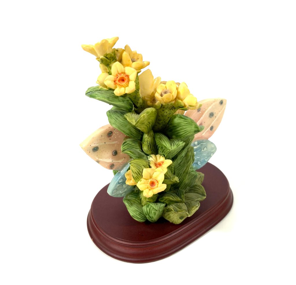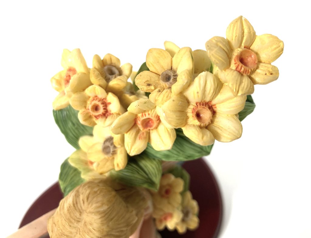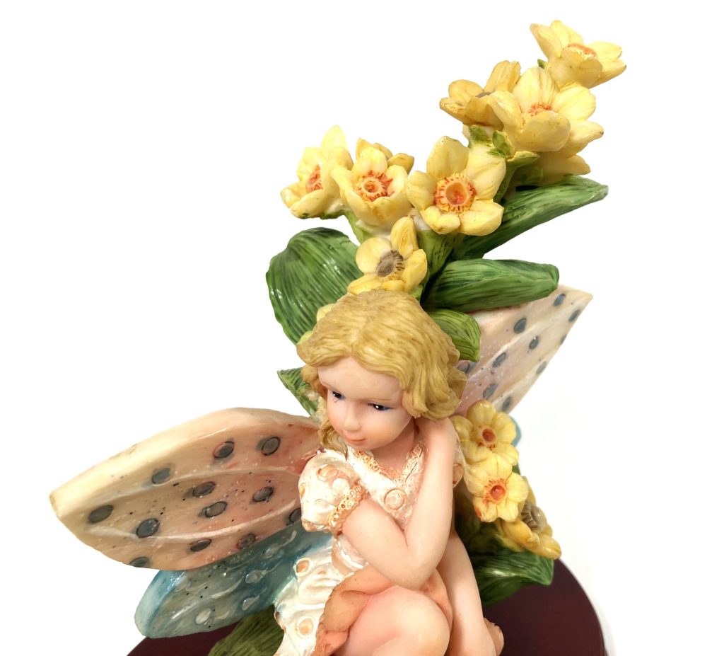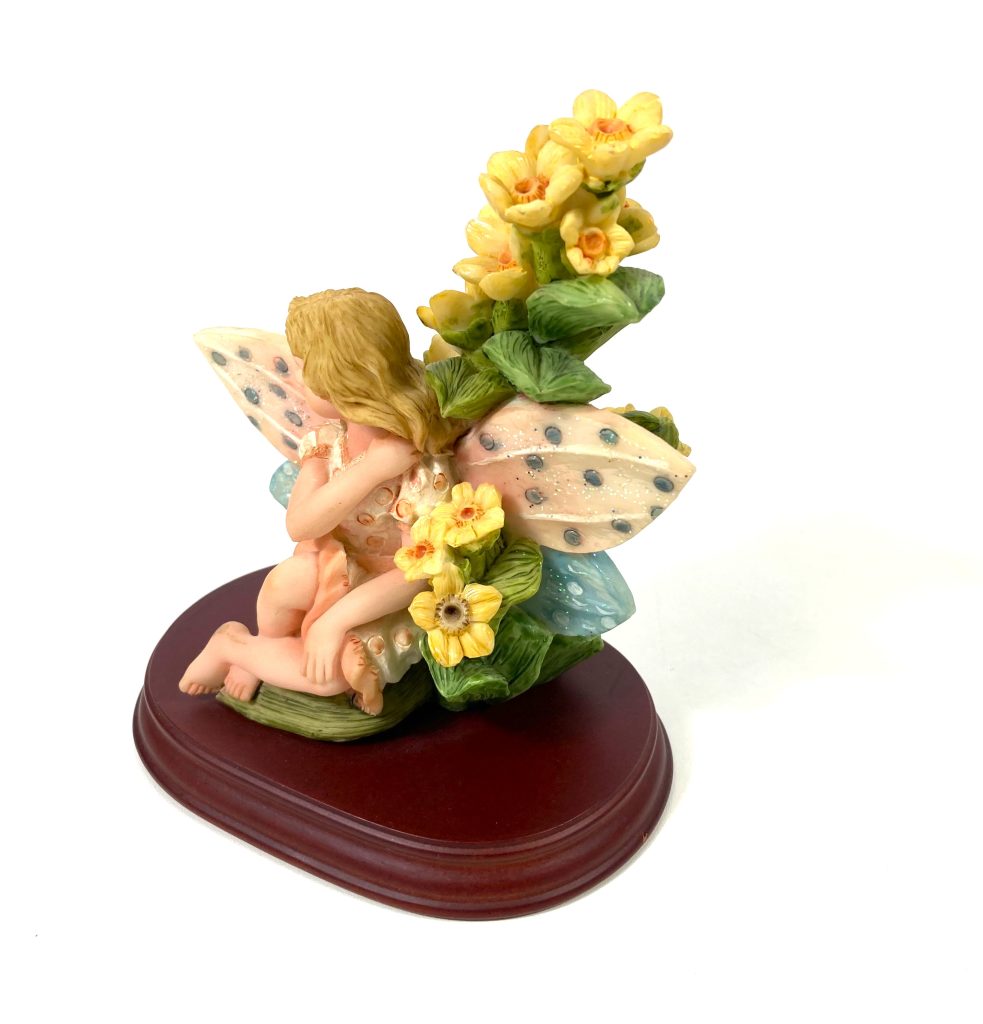 Het beeldje stelt een zittende fee voor met vleugels en blonde haren, omringd door gele bloemen. Het geheel rust op een houten sokkel.