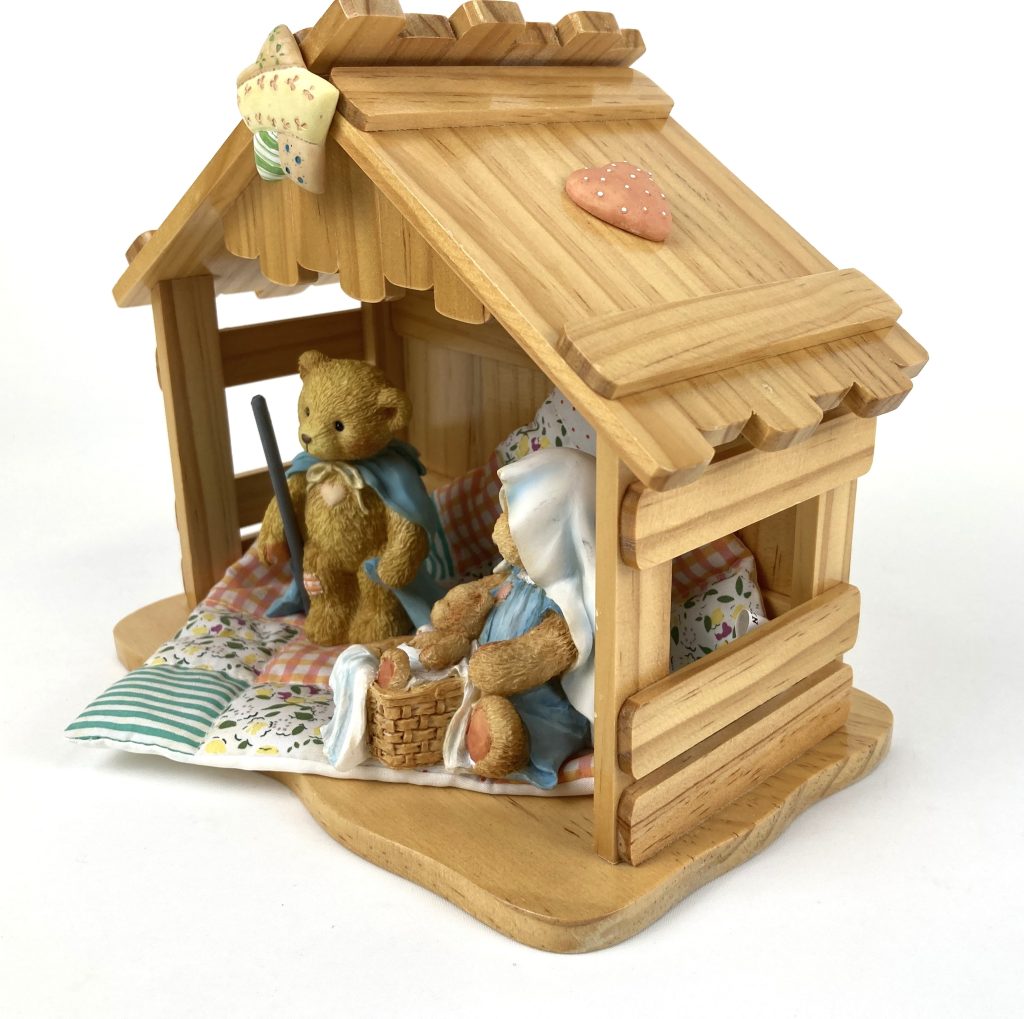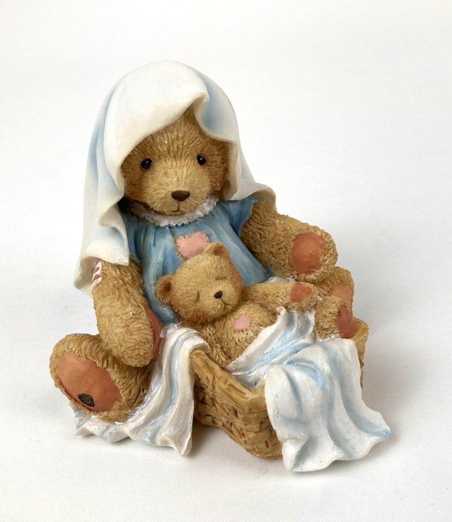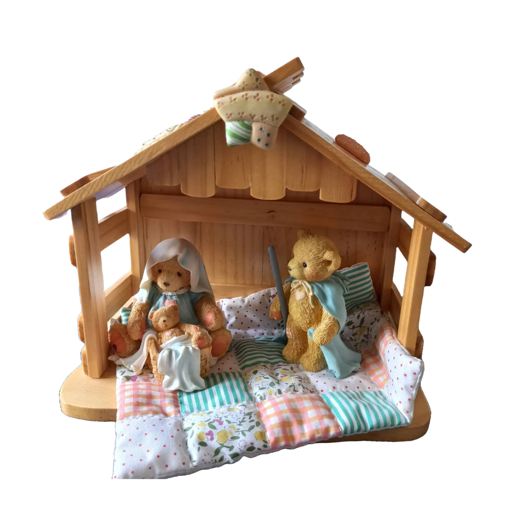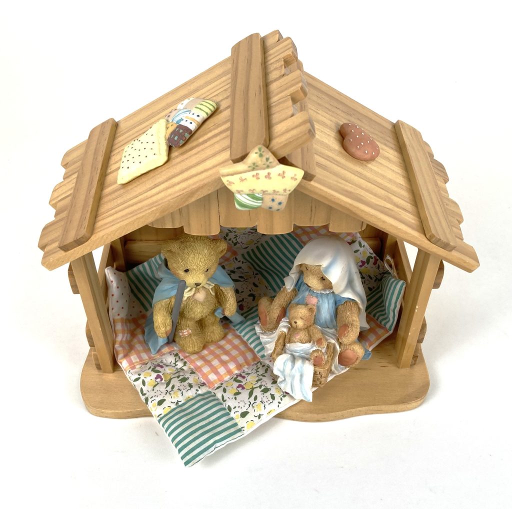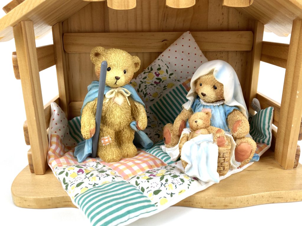 Uit de Nativity collectie (1992) van Priscilla Hillman: Cherished Teddies houten Kerststal (“Crèche”) met dekentje, Maria en Baby (950688), en Josh (Jozef) (950688). Fabrikaat: Enesto. Nieuwprijs: ca. 80 euro.