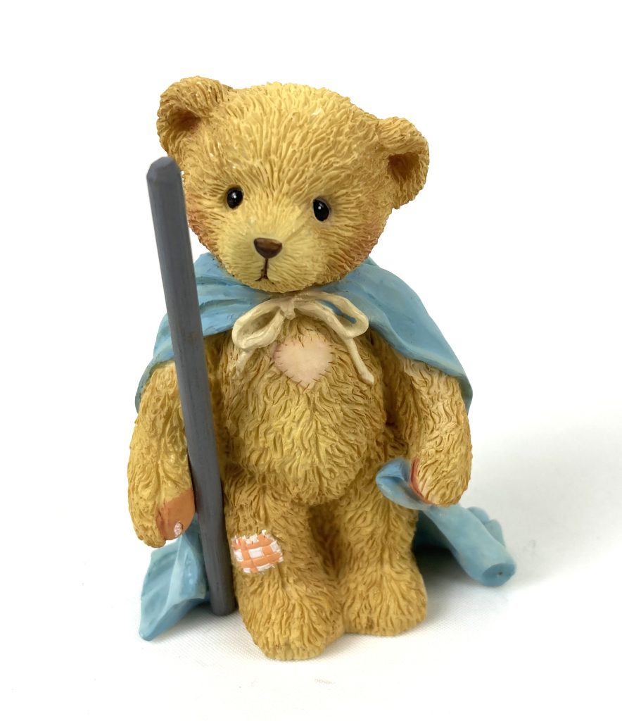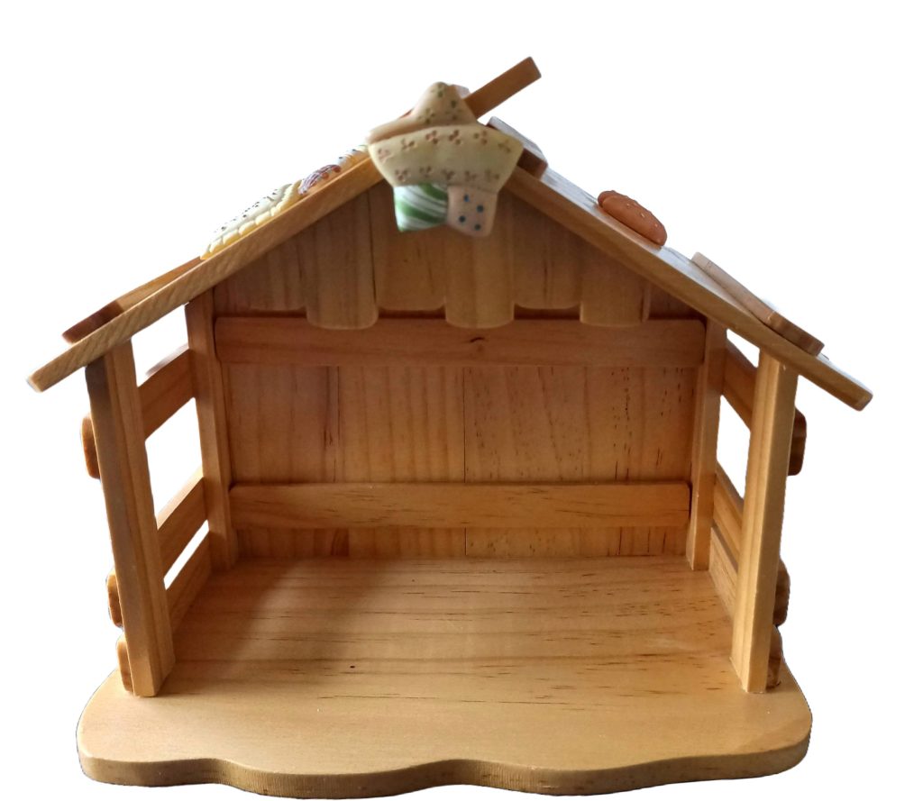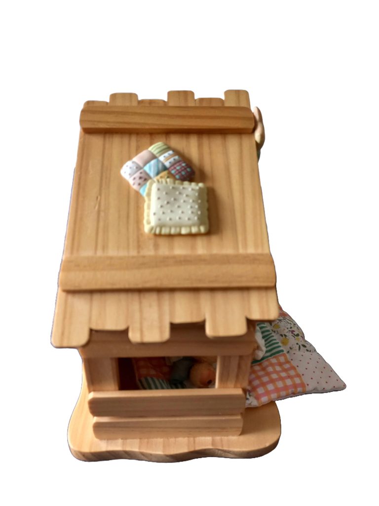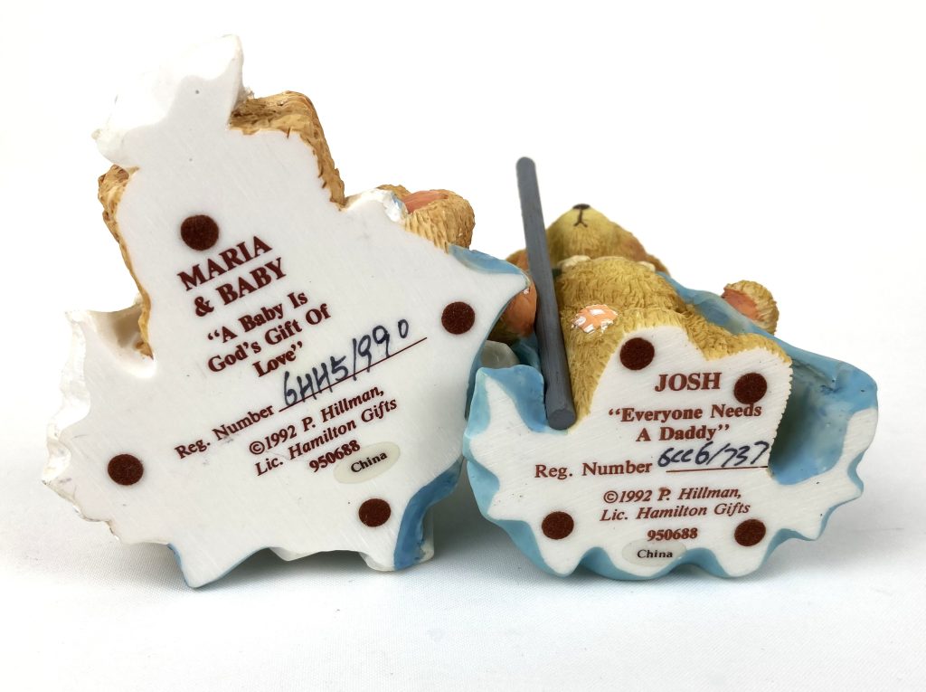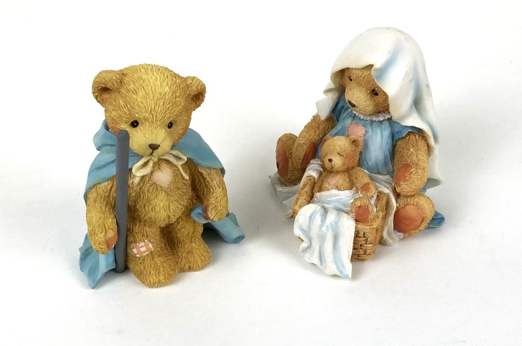 Uit de Nativity collectie (1992) van Priscilla Hillman: Cherished Teddies houten Kerststal (“Crèche”) met dekentje, Maria en Baby (950688), en Josh (Jozef) (950688). Fabrikaat: Enesto. Nieuwprijs: ca. 80 euro.