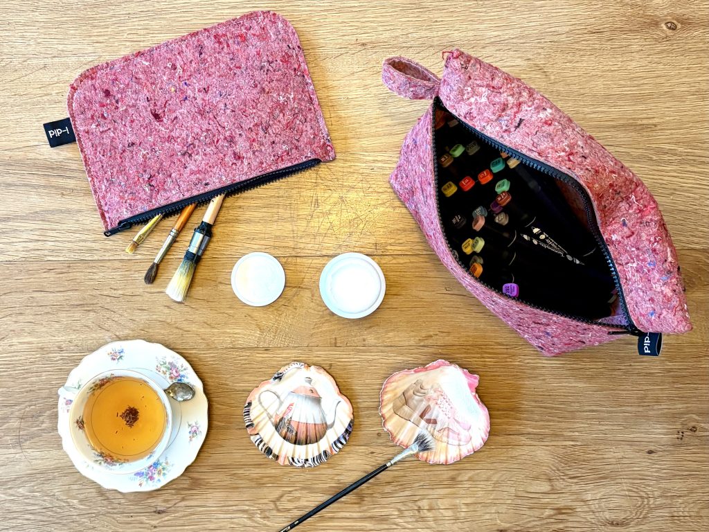 Elke kleur vertelt zijn eigen verhaal. De rozerode tint van deze etui is ontstaan uit gesorteerde, gerecyclede kledingstukken van consumenten, soms herken je nog een stukje trui of een glimmertje van een feestjurk. Zo draag je altijd een stukje geschiedenis met je mee.