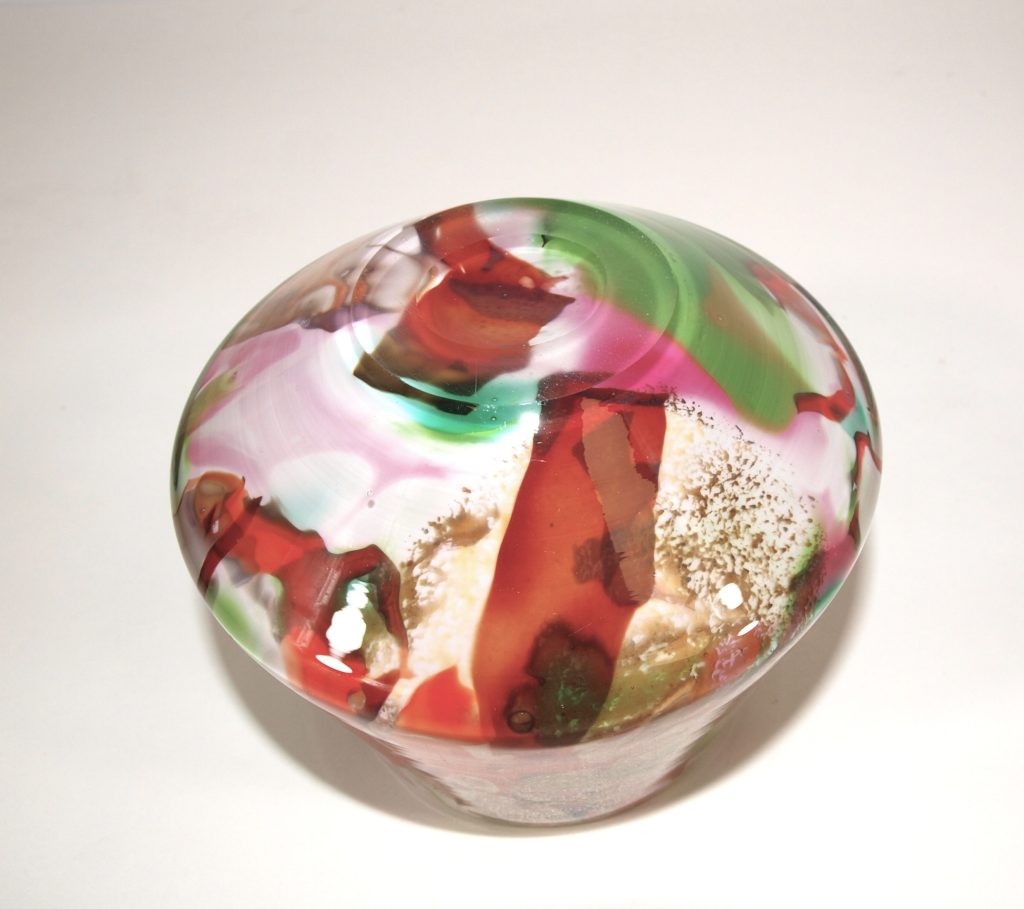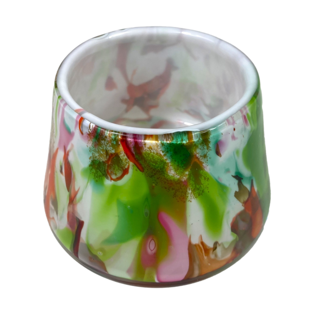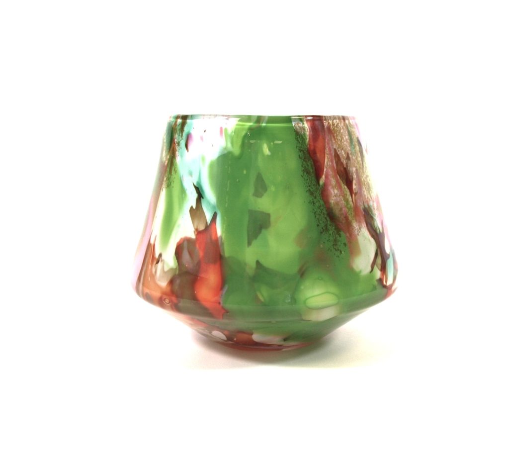 Een prachtig handgemaakt vaasje / waxinelichthouder dat door zijn unieke ontwerp en kleurenpallet direct de aandacht trekt. Het mondgeblazen glas maakt elk exemplaar uniek, met subtiele variaties in kleur en vorm die het ambachtelijke karakter van het product benadrukken. Door gebruik te maken van houten mallen en de traditionele glasblastechnieken, ontstaat een vaasje dat niet alleen functioneel is, maar ook een kunstwerk op zich.