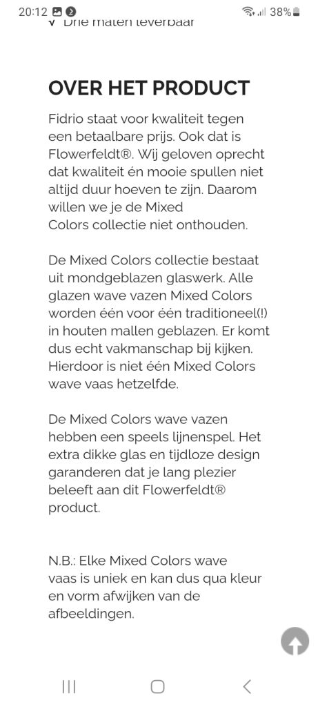 De Fidrio Organic – Mixed Colours is een prachtige handgemaakte bloemenvaas die door zijn unieke ontwerp en kleurenpallet direct de aandacht trekt. Het mondgeblazen glas maakt elk exemplaar uniek, met subtiele variaties in kleur en vorm die het ambachtelijke karakter van het product benadrukken. Door gebruik te maken van houten mallen en de traditionele glasblastechnieken, ontstaat een vaas die niet alleen functioneel is, maar ook een kunstwerk op zich.