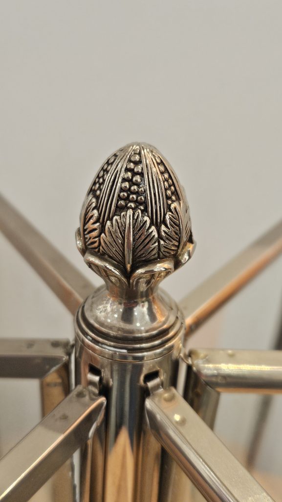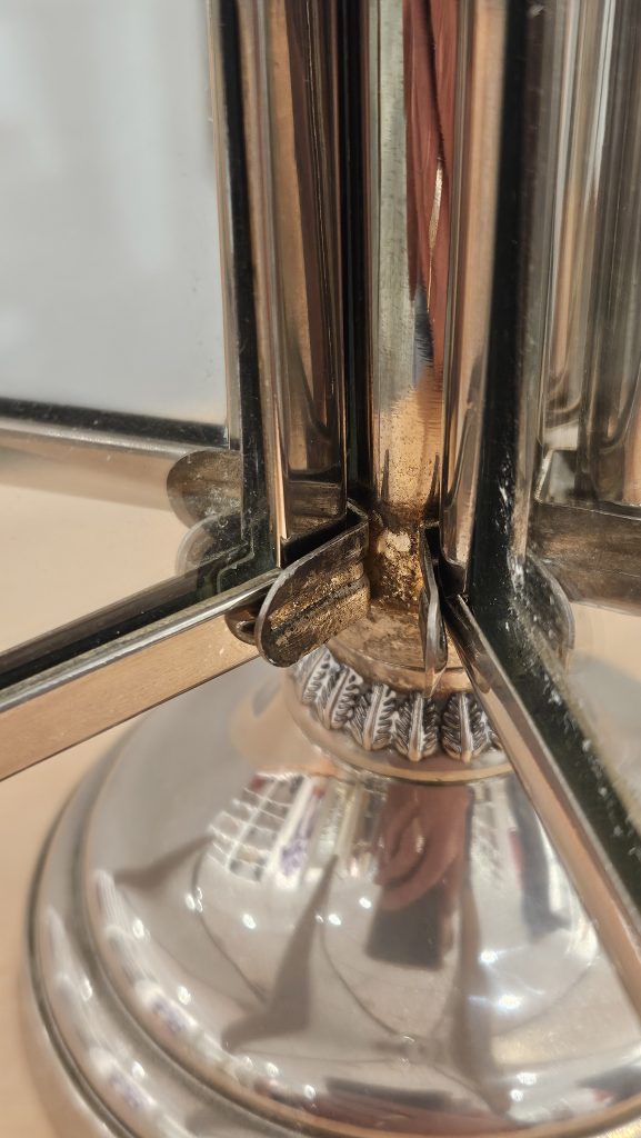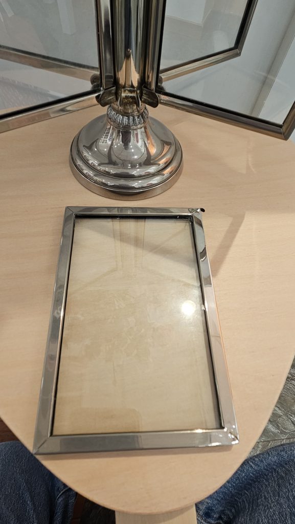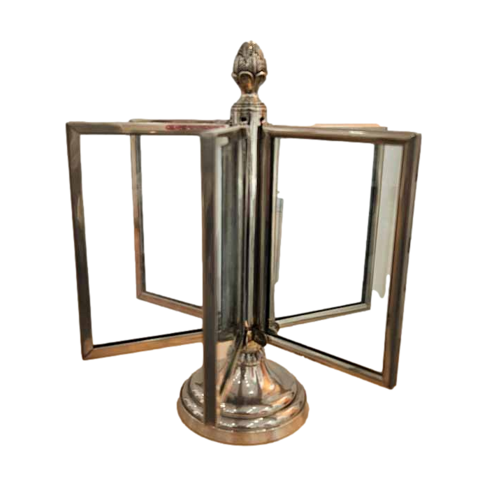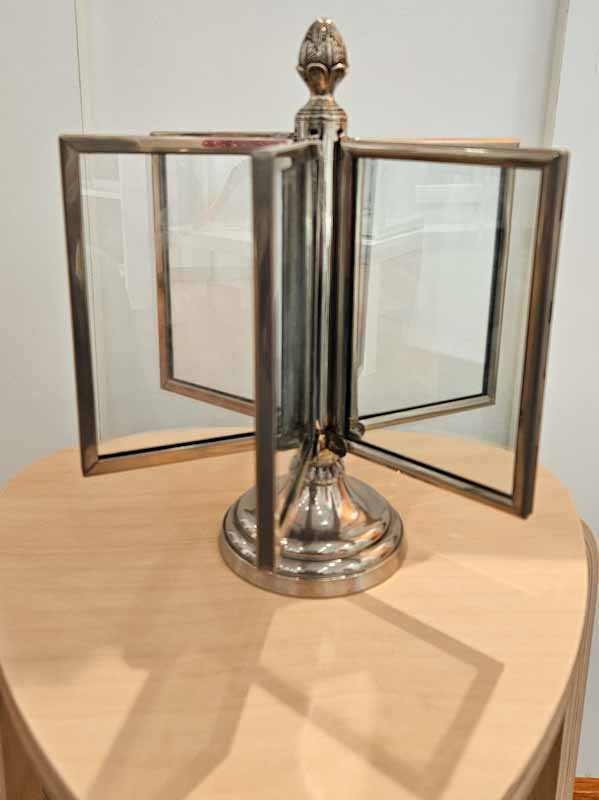 Mooie vintage fotocaroussel met 6 glazen fotolijstjes en zilverkleurig metalen frame. Totaal voor 12 foto’s (dubbelzijdig).