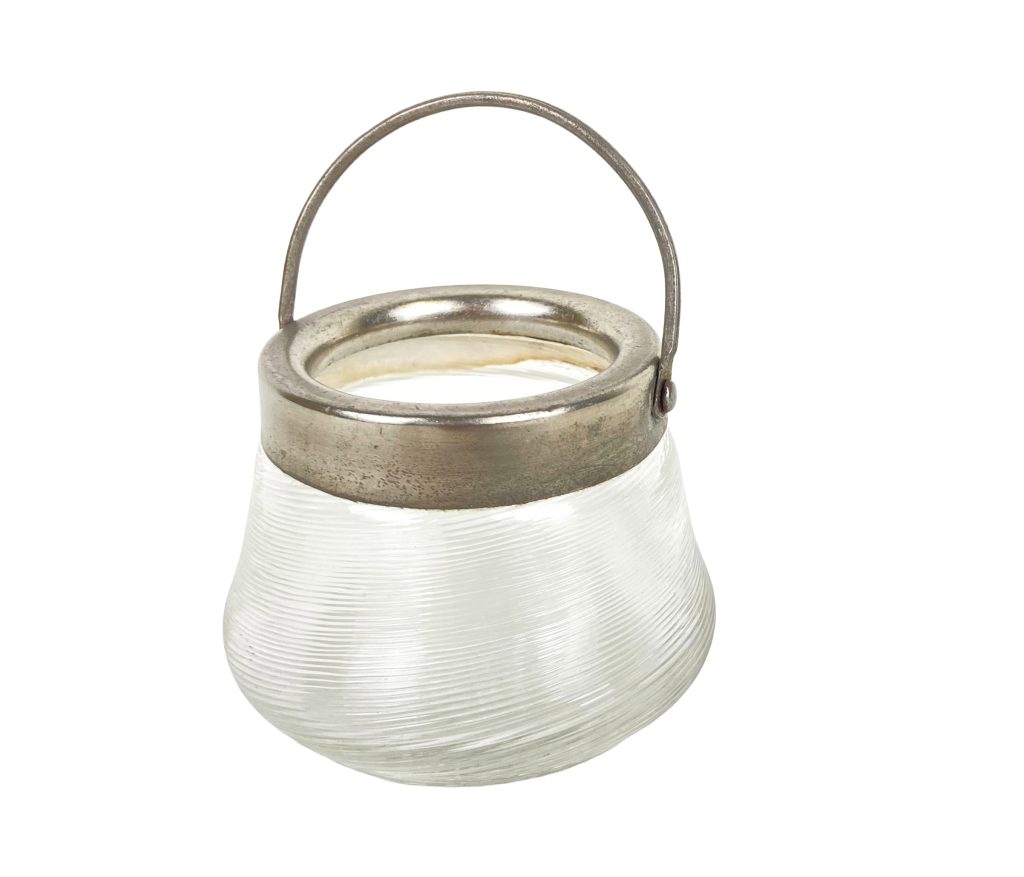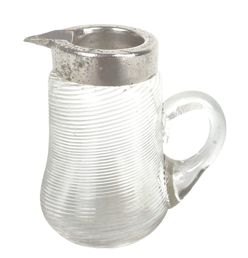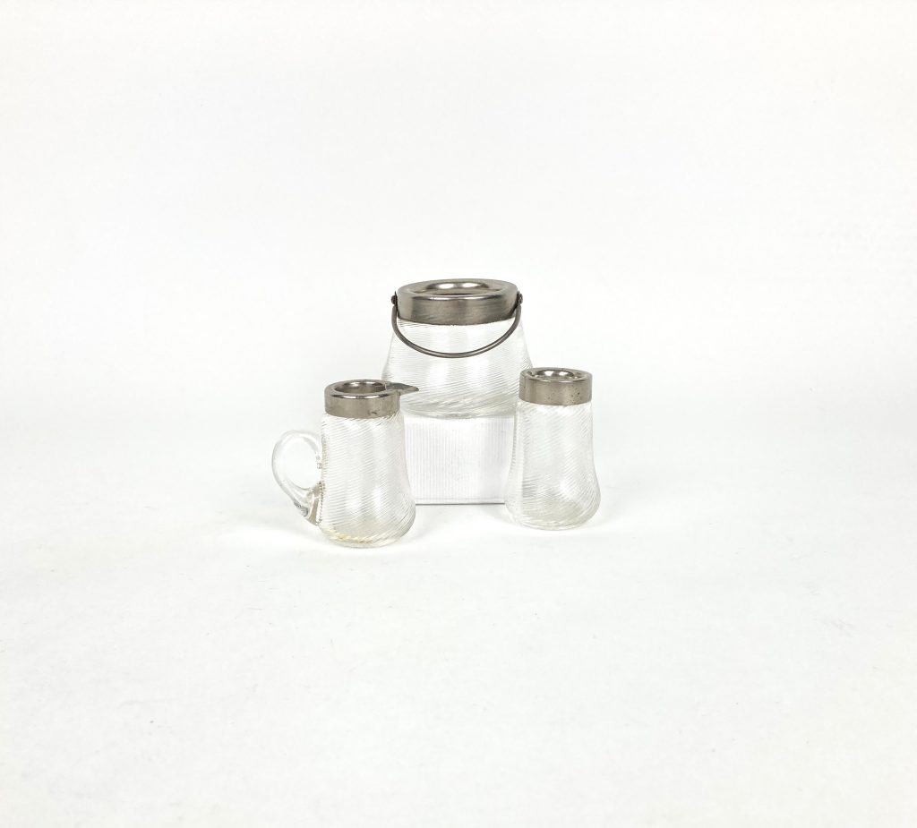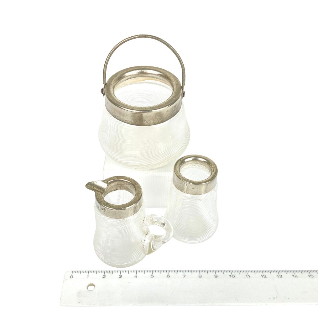 Miniatuur suikerpot, melkkan en lepelvaasje van Fries draadglas. Met metalen rand en hengsel. Hoogte lepelvaasje en melkkannetje: 5,5 cm. Hoogte suikerpot (zonder hengsel: 4,5 cm). Met kleine slijtage aan het metaal, verder in uitstekende staat.
