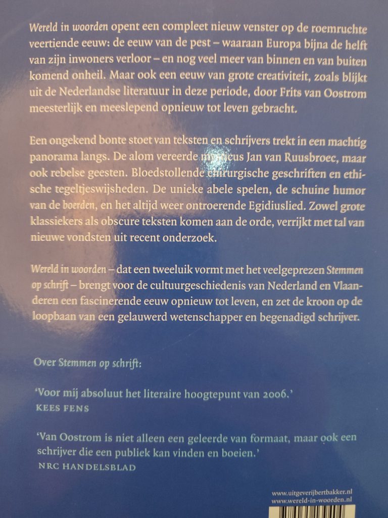 Wereld in woorden opent een compleet nieuw venster op de roemruchte veertiende eeuw: de eeuw van de pest – waaraan Europa bijna de helft van zijn inwoners verloor – en nog veel meer van binnen en van buiten komend onheil. Maar ook een eeuw van grote creativiteit – zoals blijkt uit de Nederlandse literatuur in deze periode, door Frits van Oostrom meesterlijk en meeslepend opnieuw tot leven gebracht.