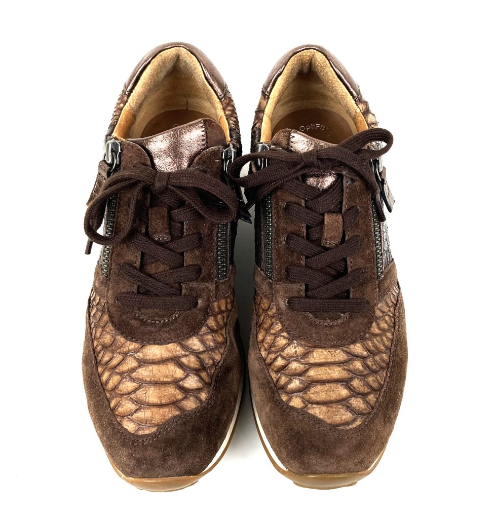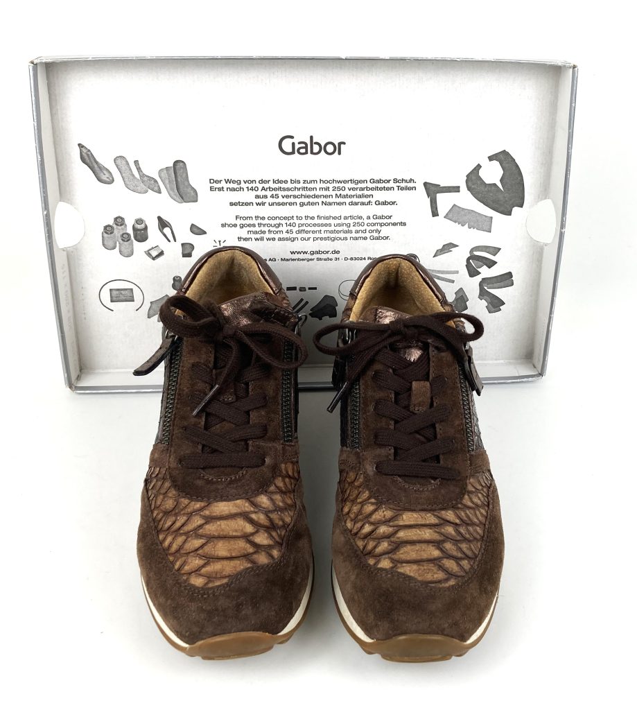 Nieuwe dames leren sneakers van Gabor Comfort, vervaardigd in suède met krokoprint. De sneakers zijn voorzien van zowel veters als een rits, wat een gemakkelijke instap garandeert. In de kleuren cognac en mokka.