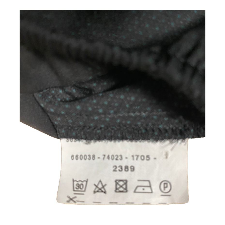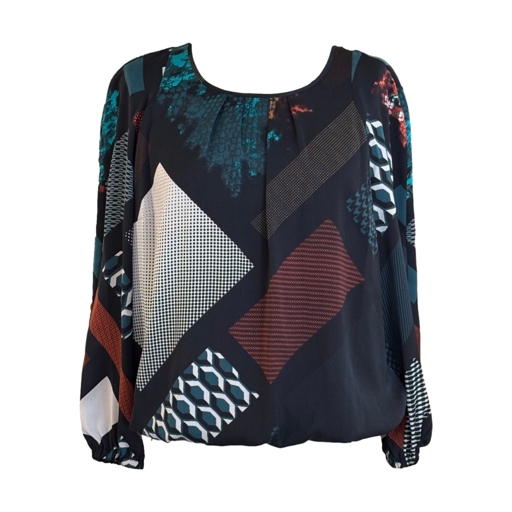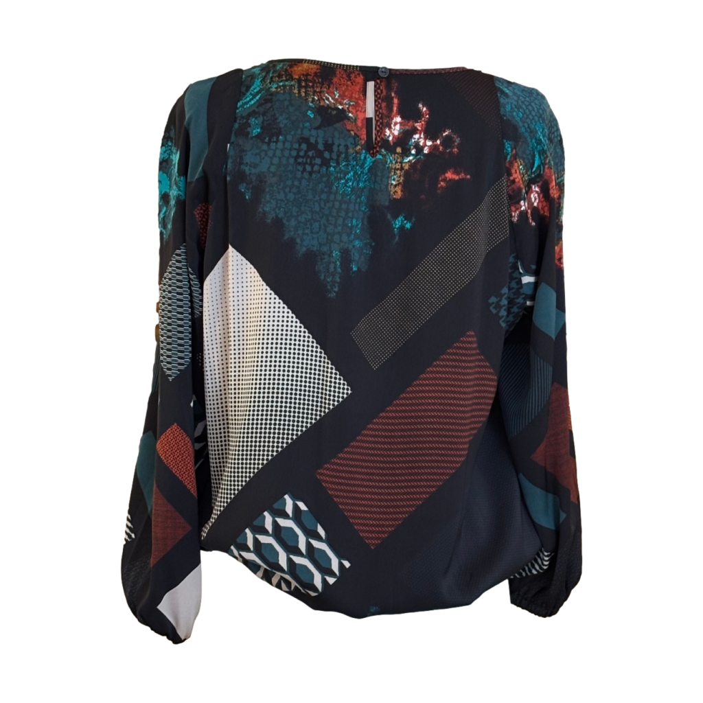 Blouson met zwart/groen/bruin/beige grafisch dessin, 4 kleine plooitje bij de hals.
