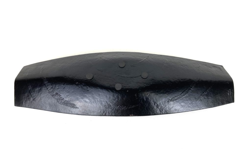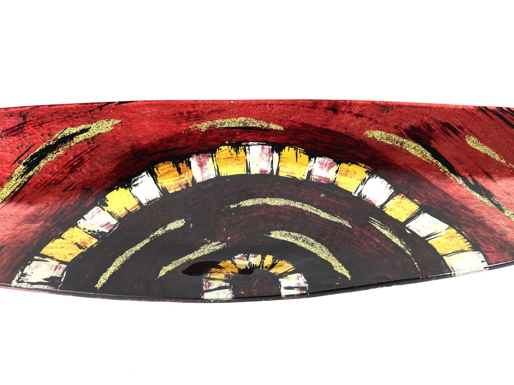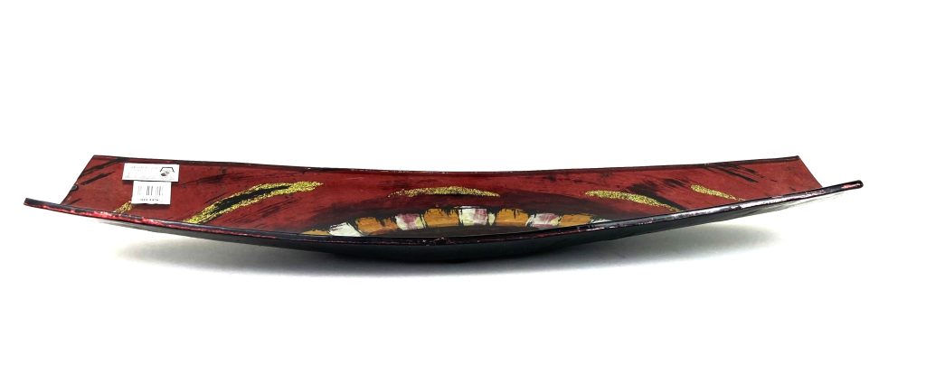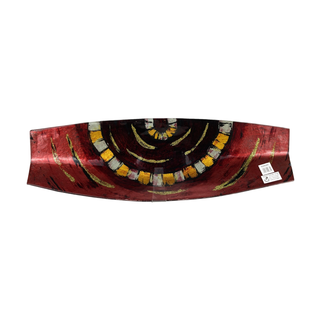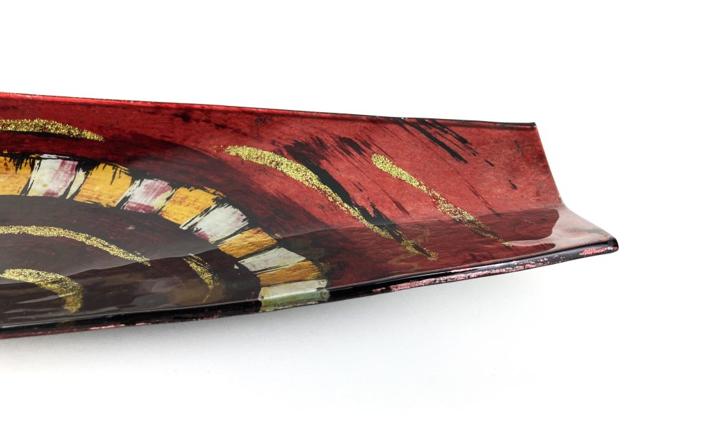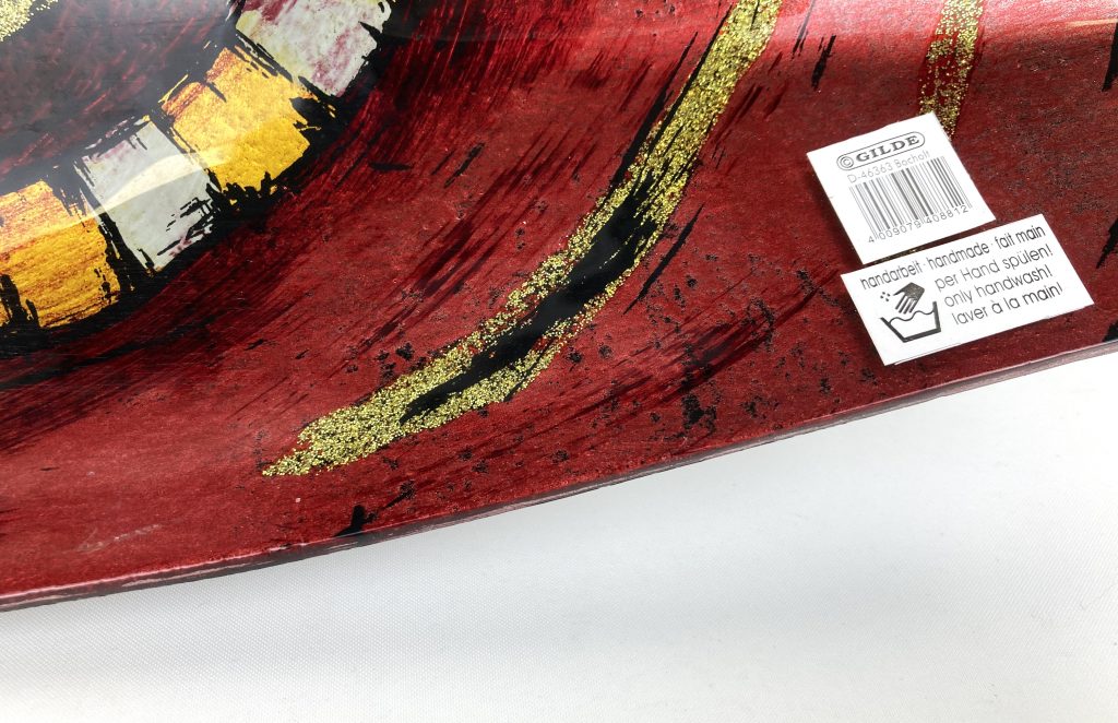 Nieuwe handgemaakte decoratieve schaal van Gilde Glass Art (Bocholt). Gemaakt met de fusing techniek (versmolten glaselementen). Handbeschilderd in abstracte motieven in de kleuren goud (glitter), bordeauxrood en zwart. Afmeting: 44 cm lang x 15 cm breed x 3 cm hoog.